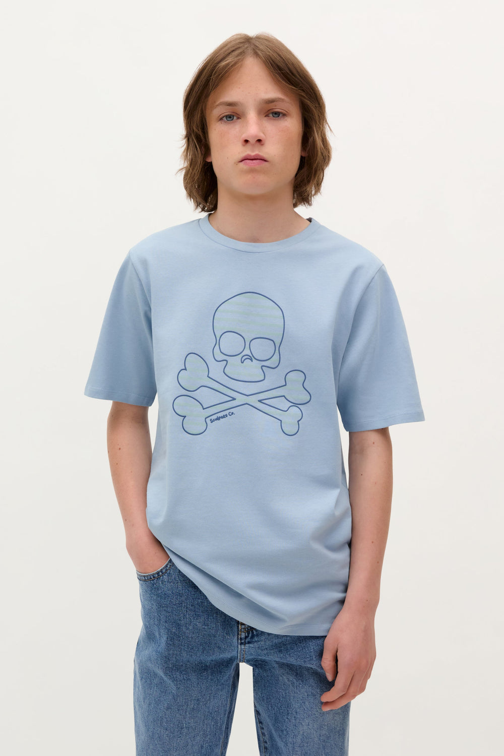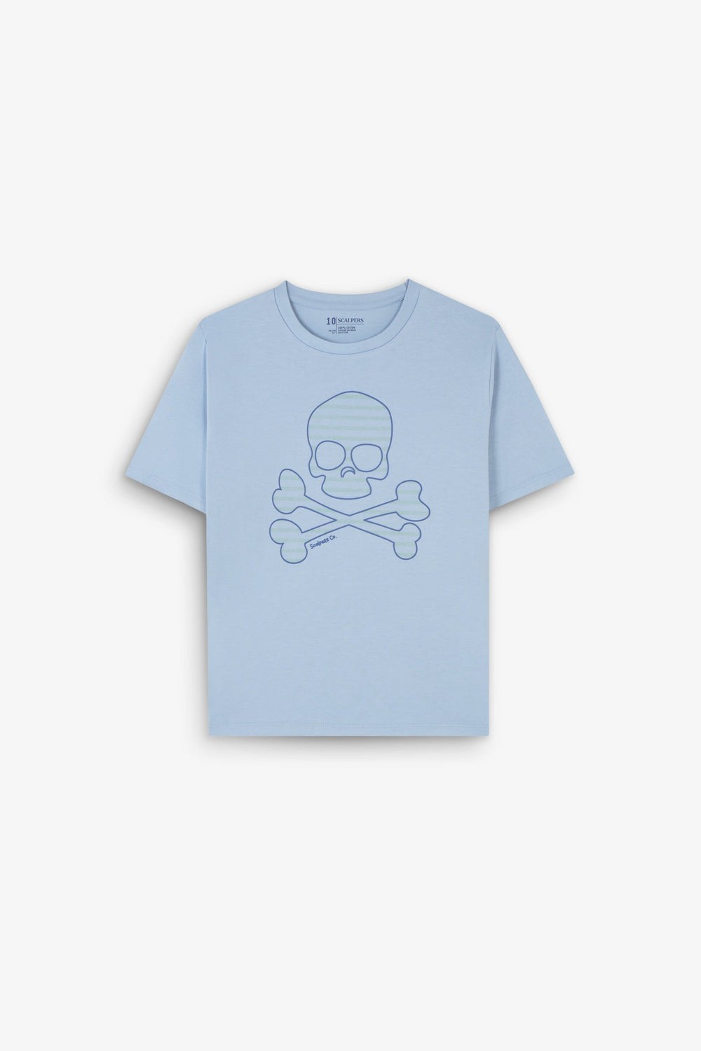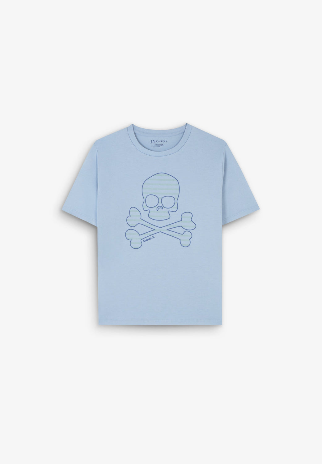 Camiseta confeccionada en tejido 100% algodón BCI. Corte recto, cuello redondo y manga corta. Detalle de bordado en el pecho y print de calavera "mágico": las rayas solo se aprecian cuando le da la luz del sol.