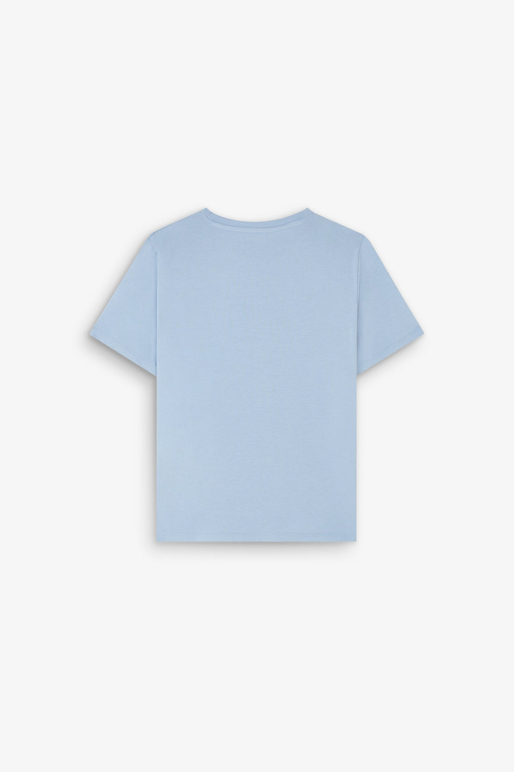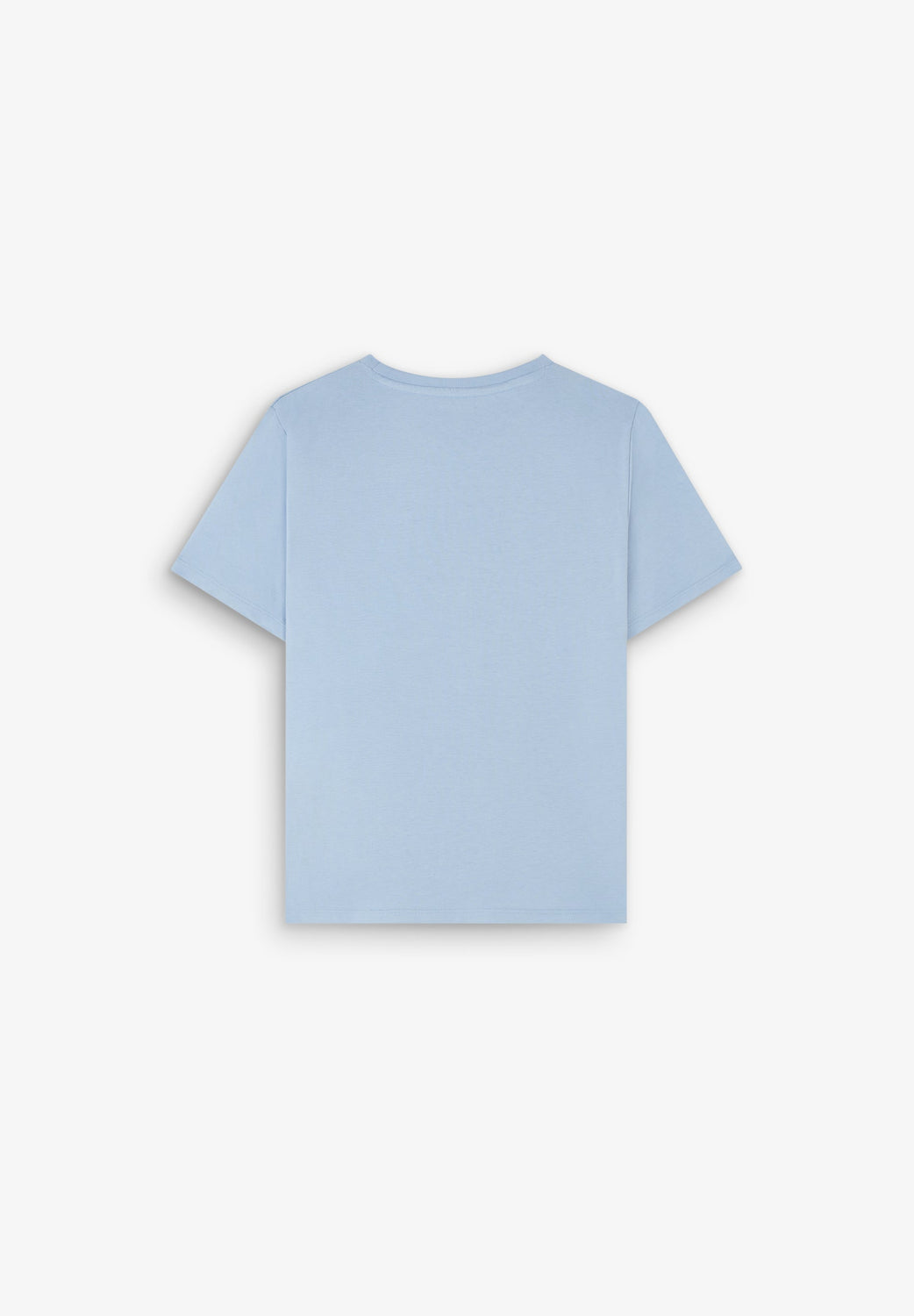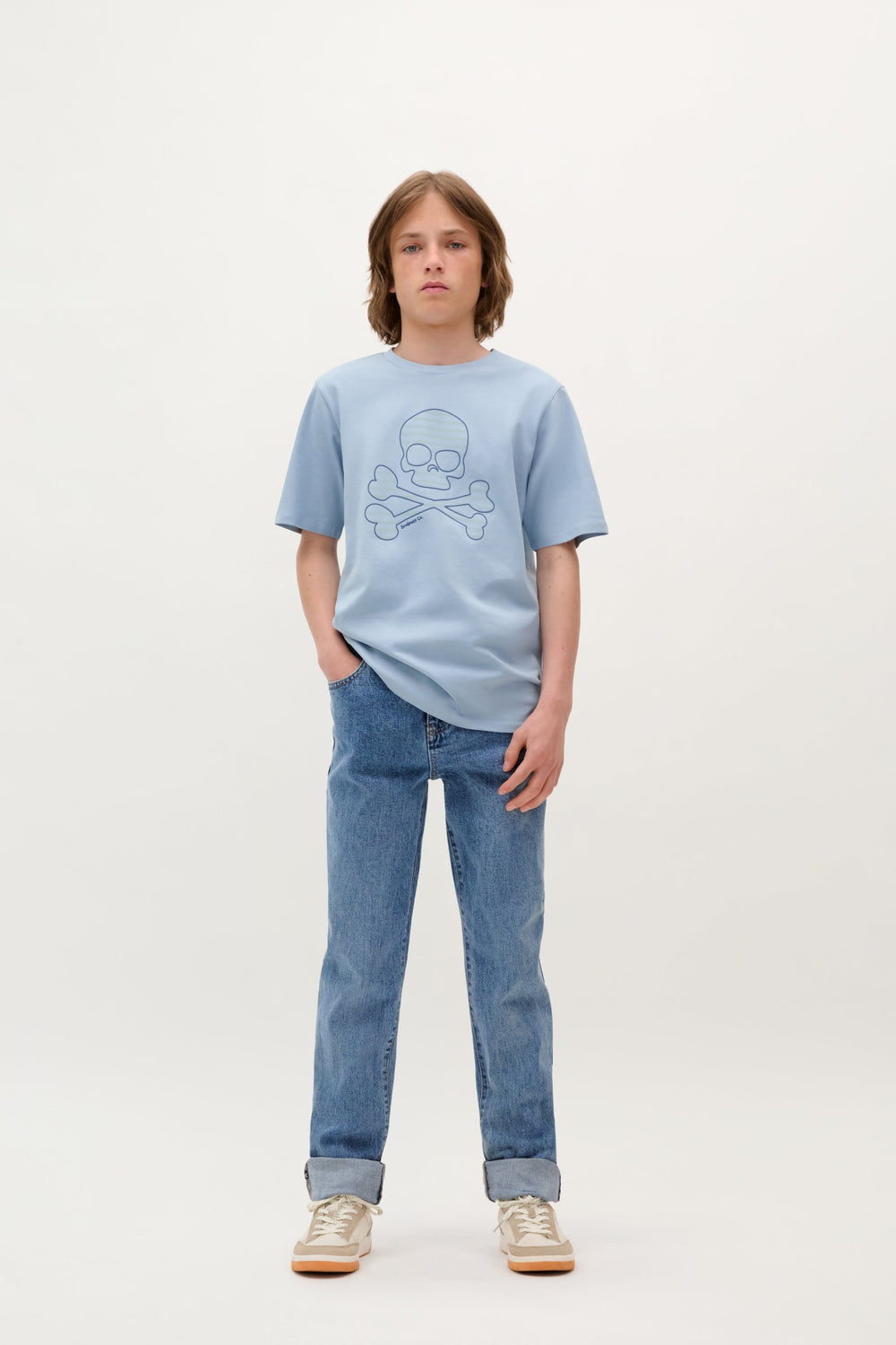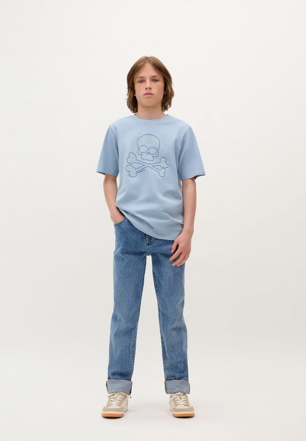 Camiseta confeccionada en tejido 100% algodón BCI. Corte recto, cuello redondo y manga corta. Detalle de bordado en el pecho y print de calavera "mágico": las rayas solo se aprecian cuando le da la luz del sol.