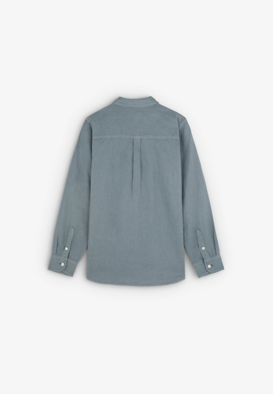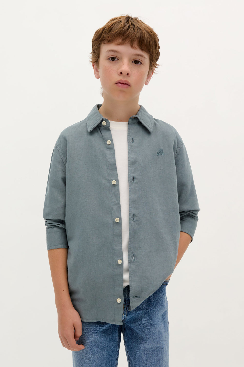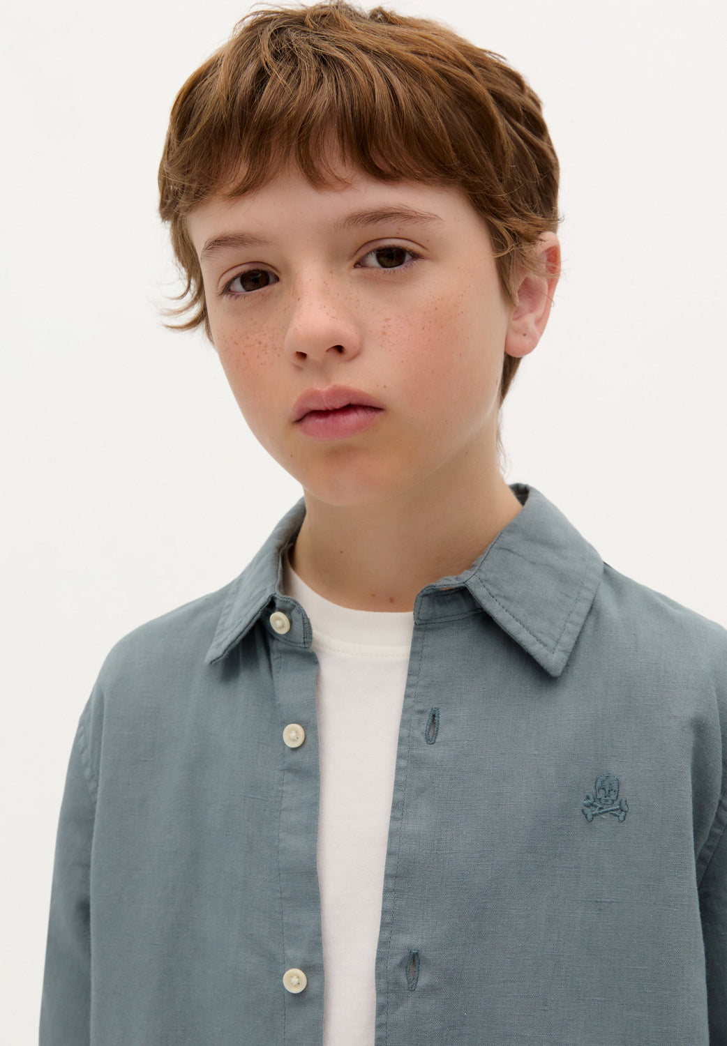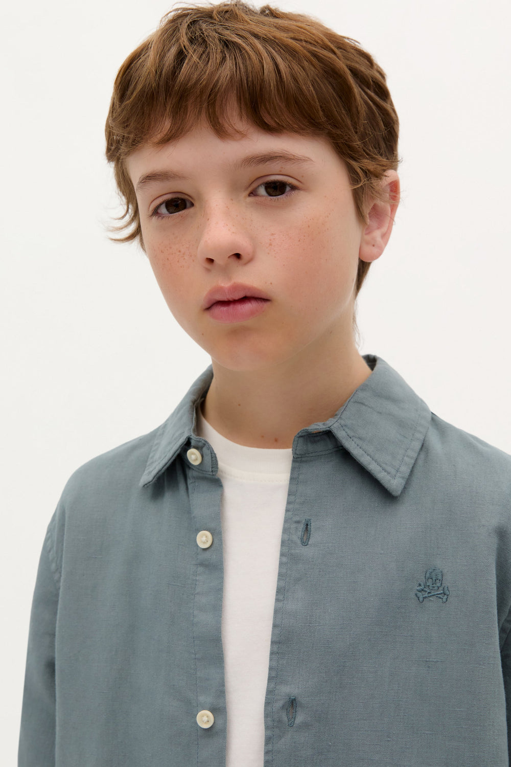 Camisa con calavera bordada en pecho a tono. Confeccionada en mezcla de lino y algodón. Corte Regular fit. Cuello clásico. Cierre con botones. Tablón trasero. Manga larga terminada en puño con botones.
