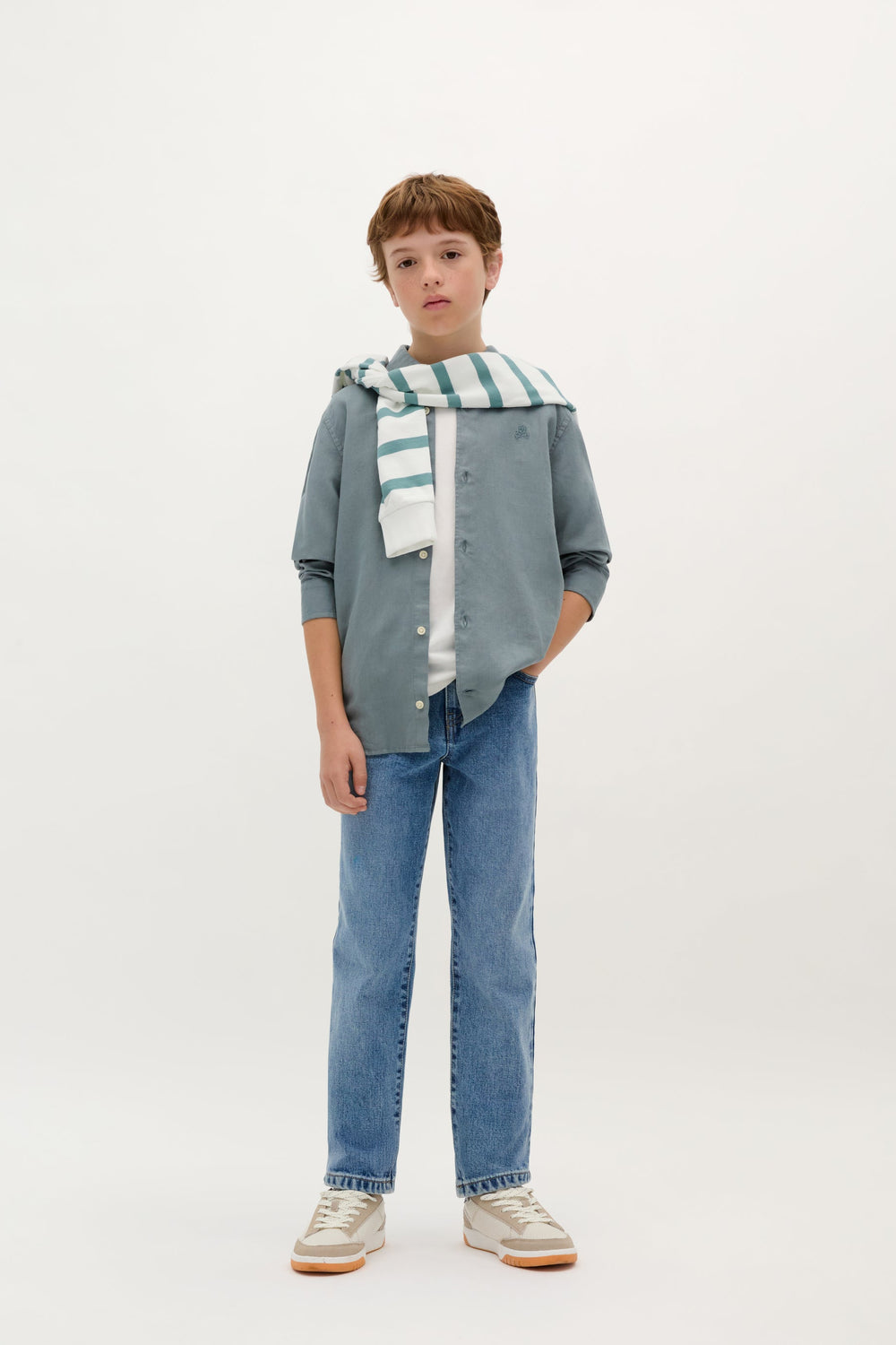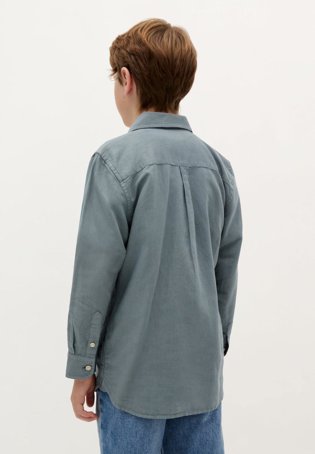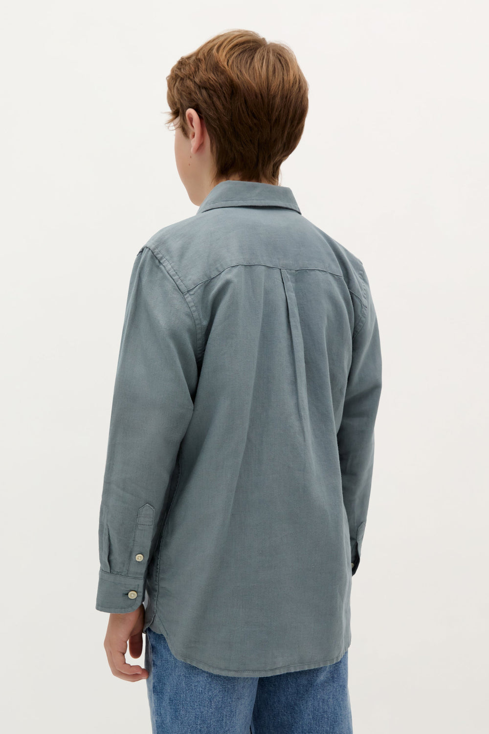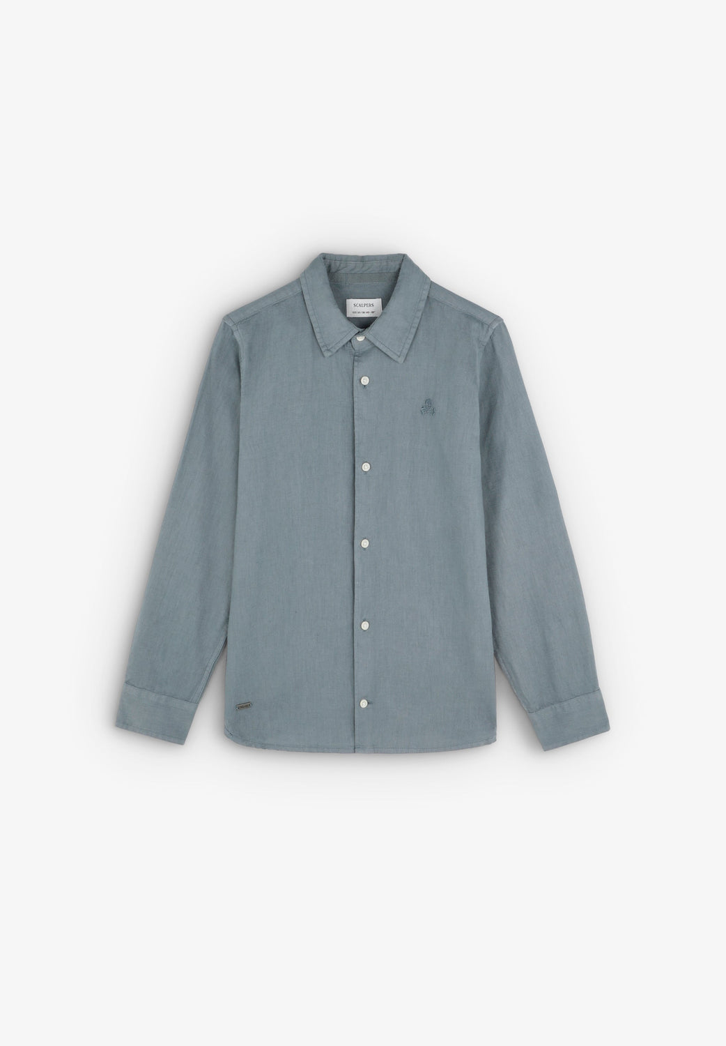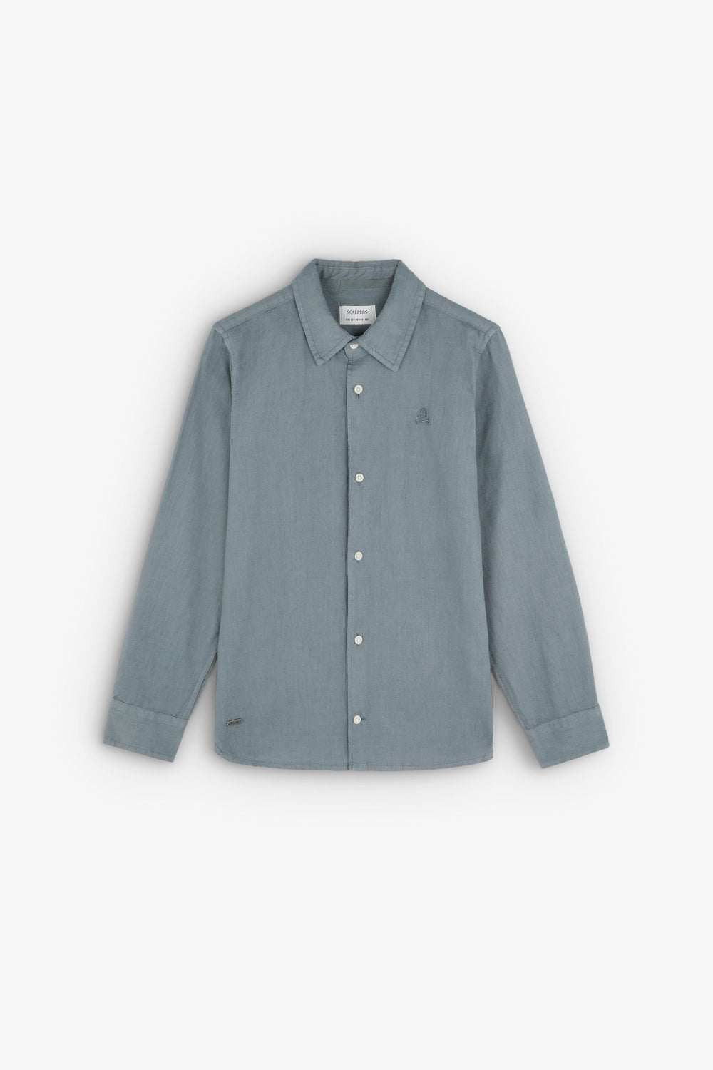 Camisa con calavera bordada en pecho a tono. Confeccionada en mezcla de lino y algodón. Corte Regular fit. Cuello clásico. Cierre con botones. Tablón trasero. Manga larga terminada en puño con botones.