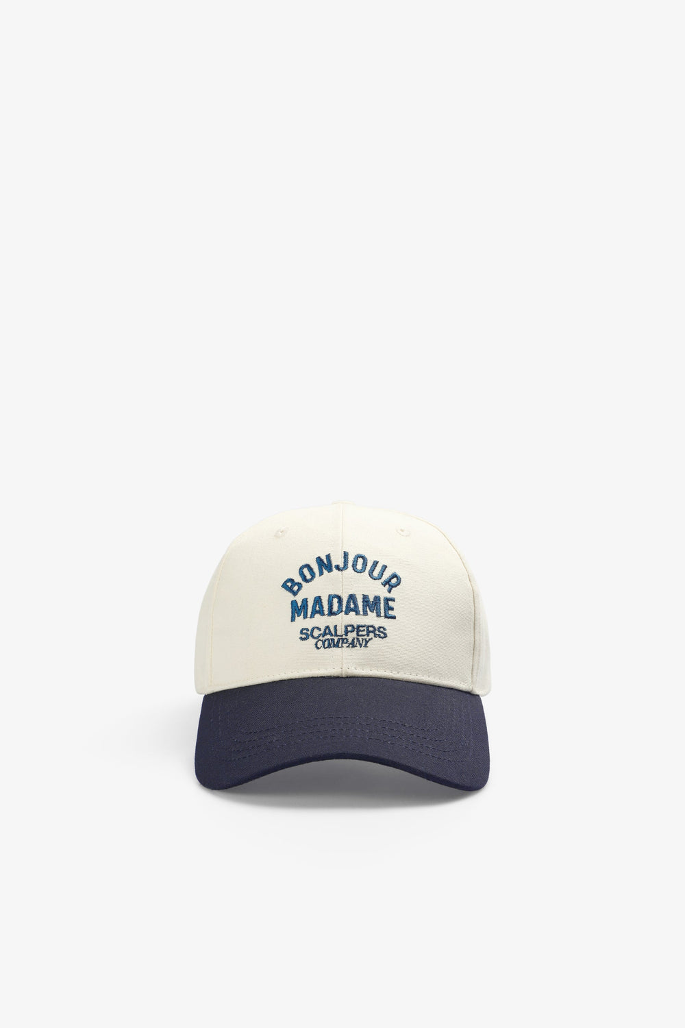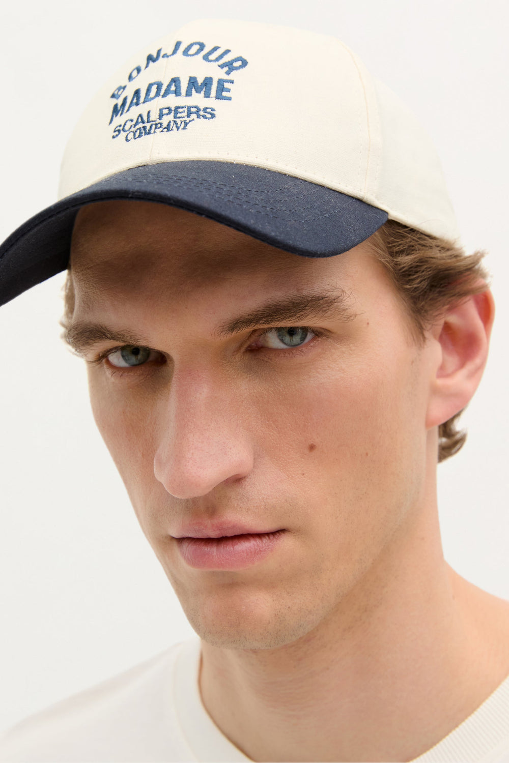 Gorra bicolor confeccionada en 100% algodón. Cierre ajustable trasero y print delantero a contraste.