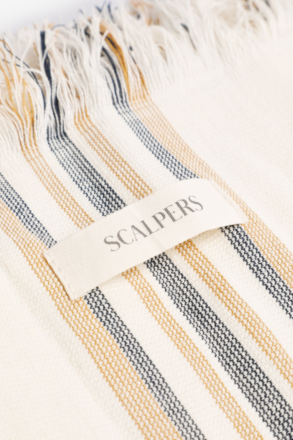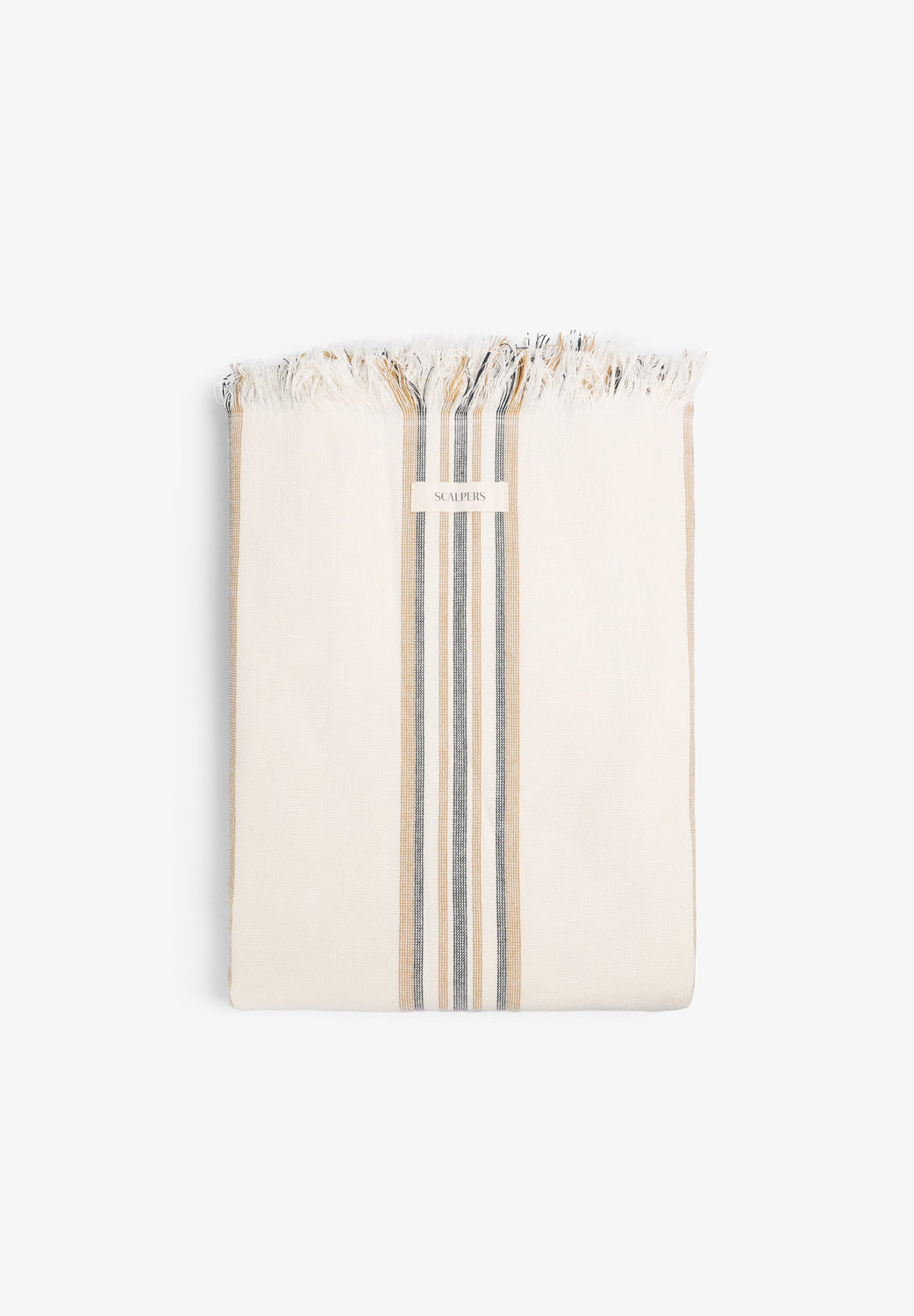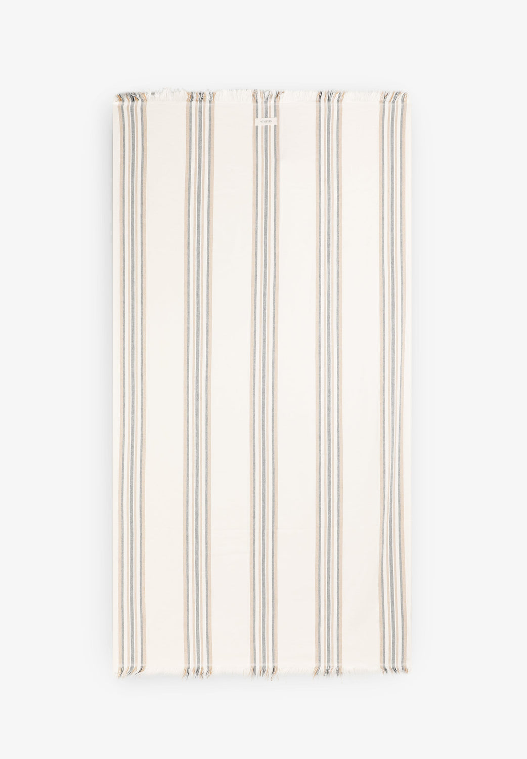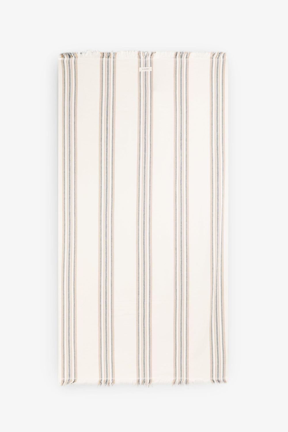 Toalla confeccionada en 100% Algodón Orgánico BCI. Estampado a rayas. Detalle logotipo en etiqueta bordada.