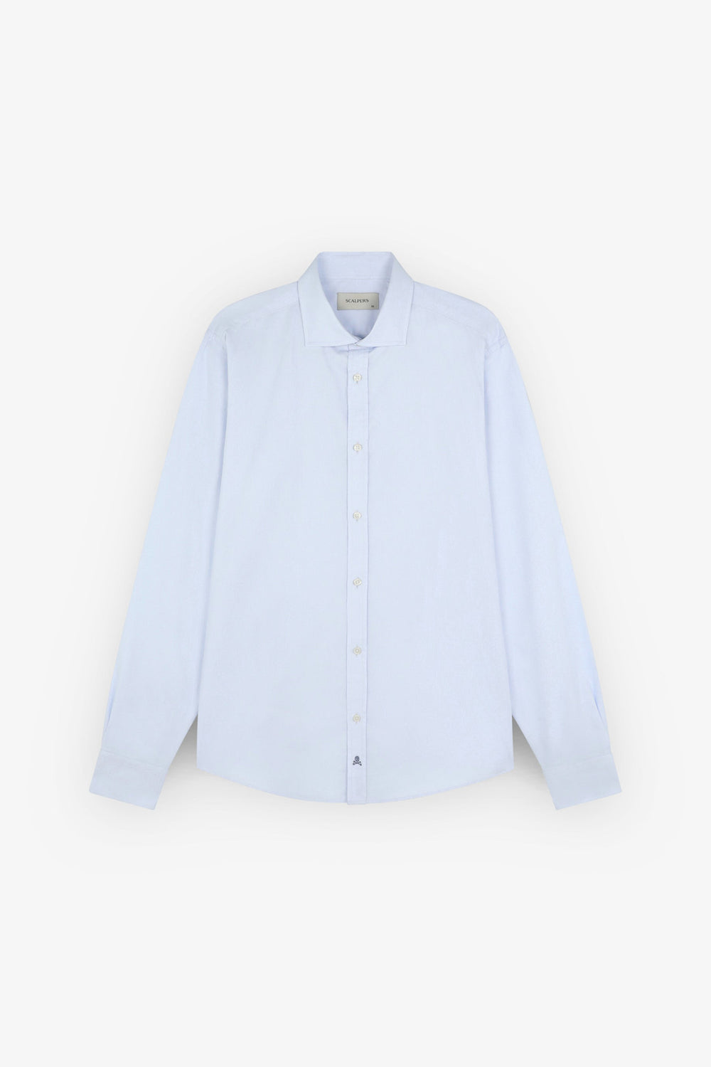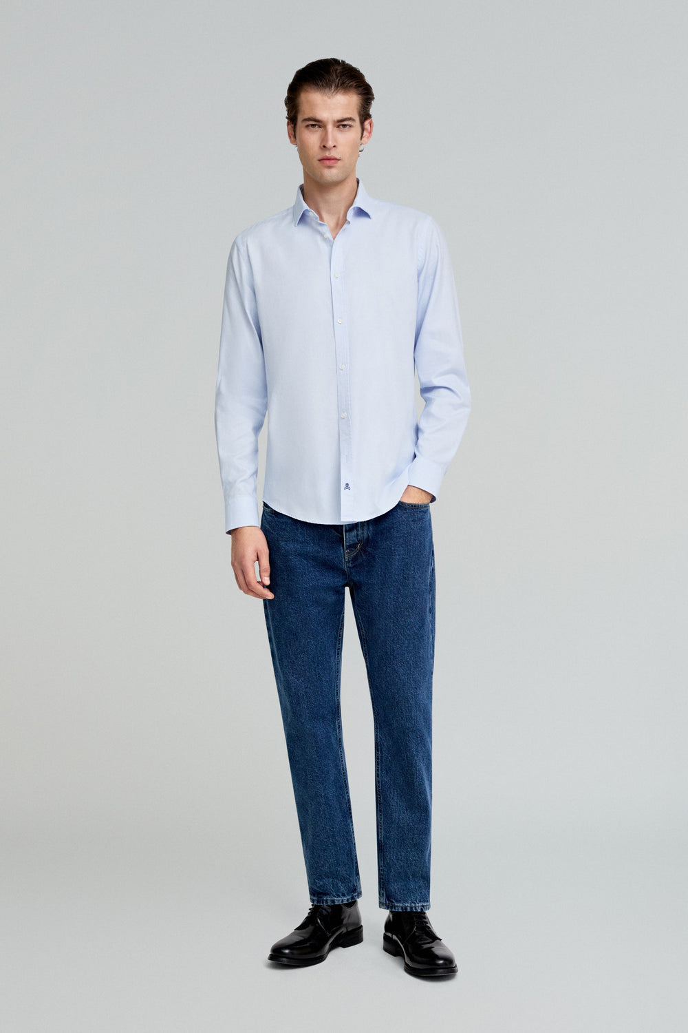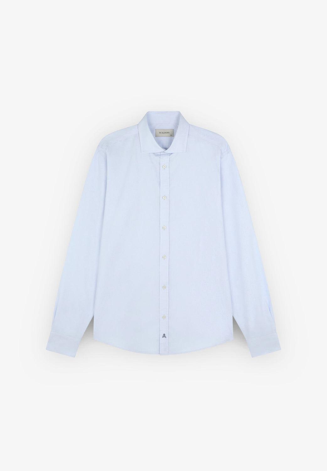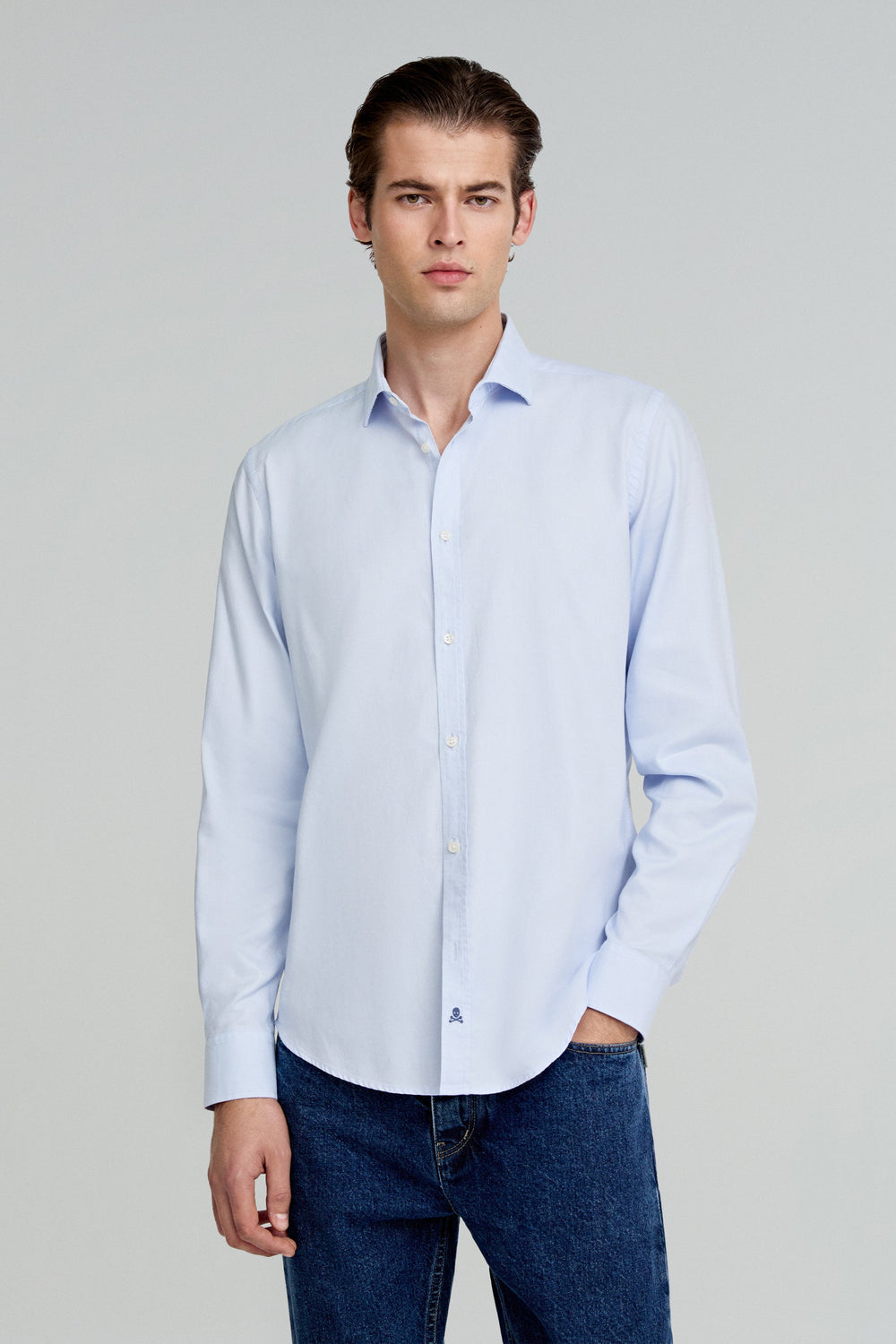 Camisa básica confeccionada en 100% algodón. Slim fit, cuello italiano y cierre con botones. Manga larga terminada en puño con botones y calavera a contraste en tapeta.