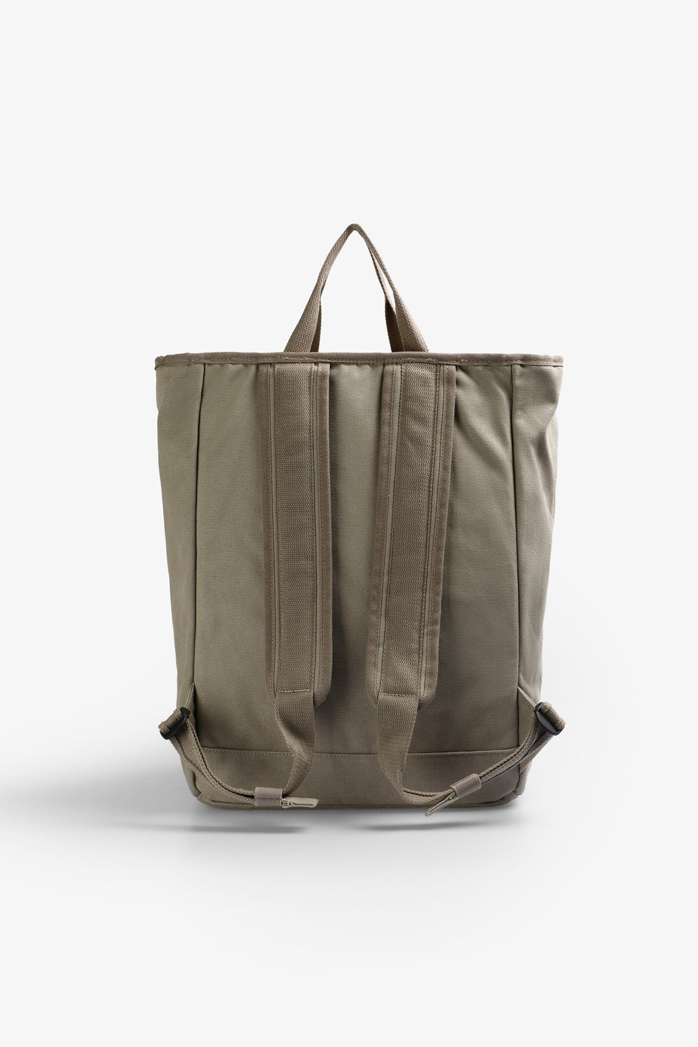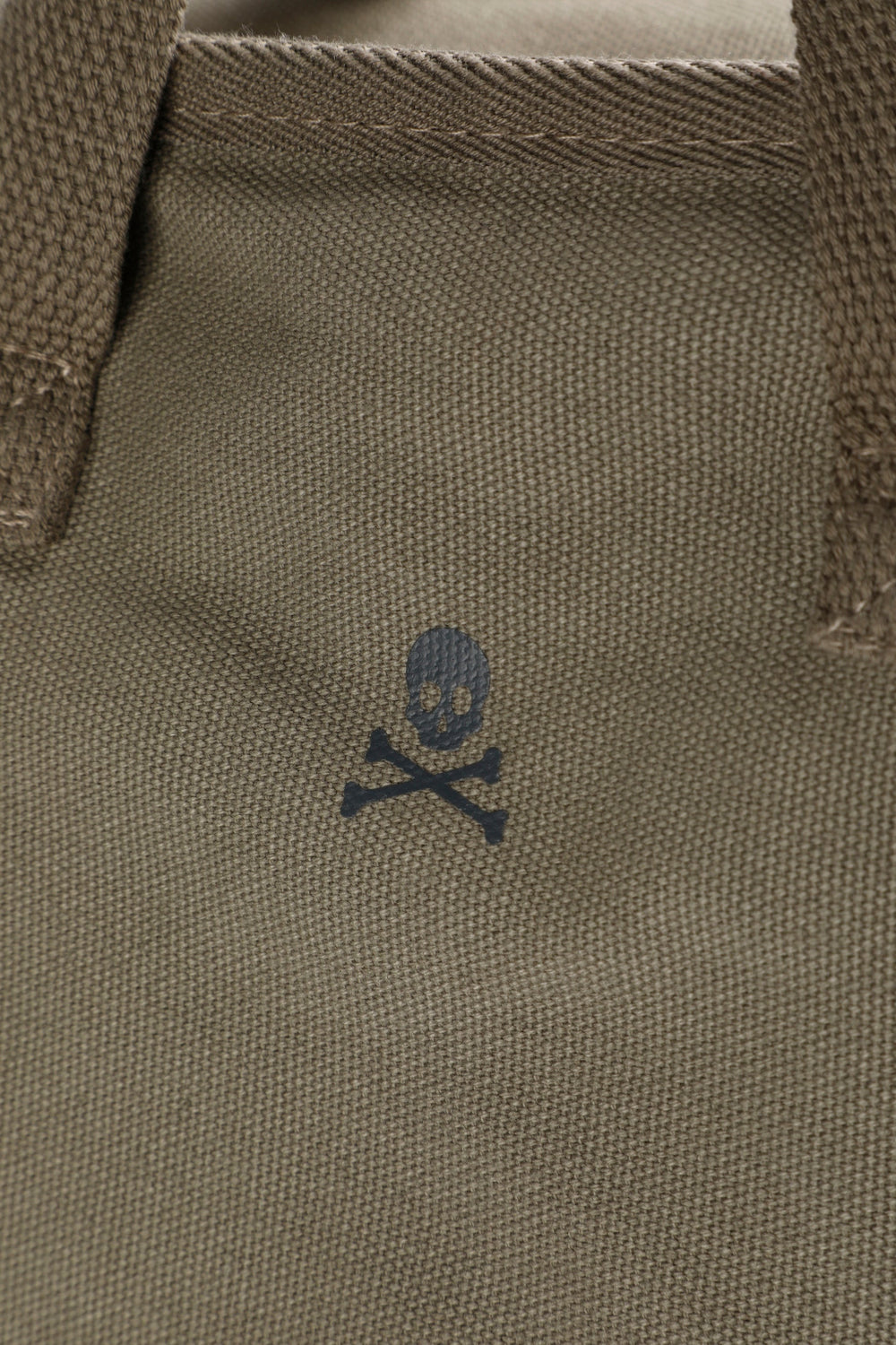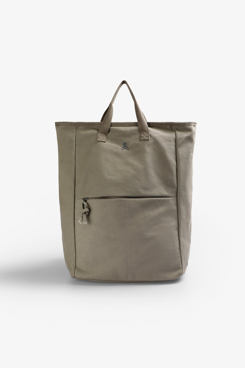 Bolsa con funcionalidad doble de mochila. Confeccionada en tejido canvas reciclado. Cierre con cremallera. Bolsillo interior. Asas cortas superiores y traseras ajustables. Detalle de print frontal de logo y calavera.