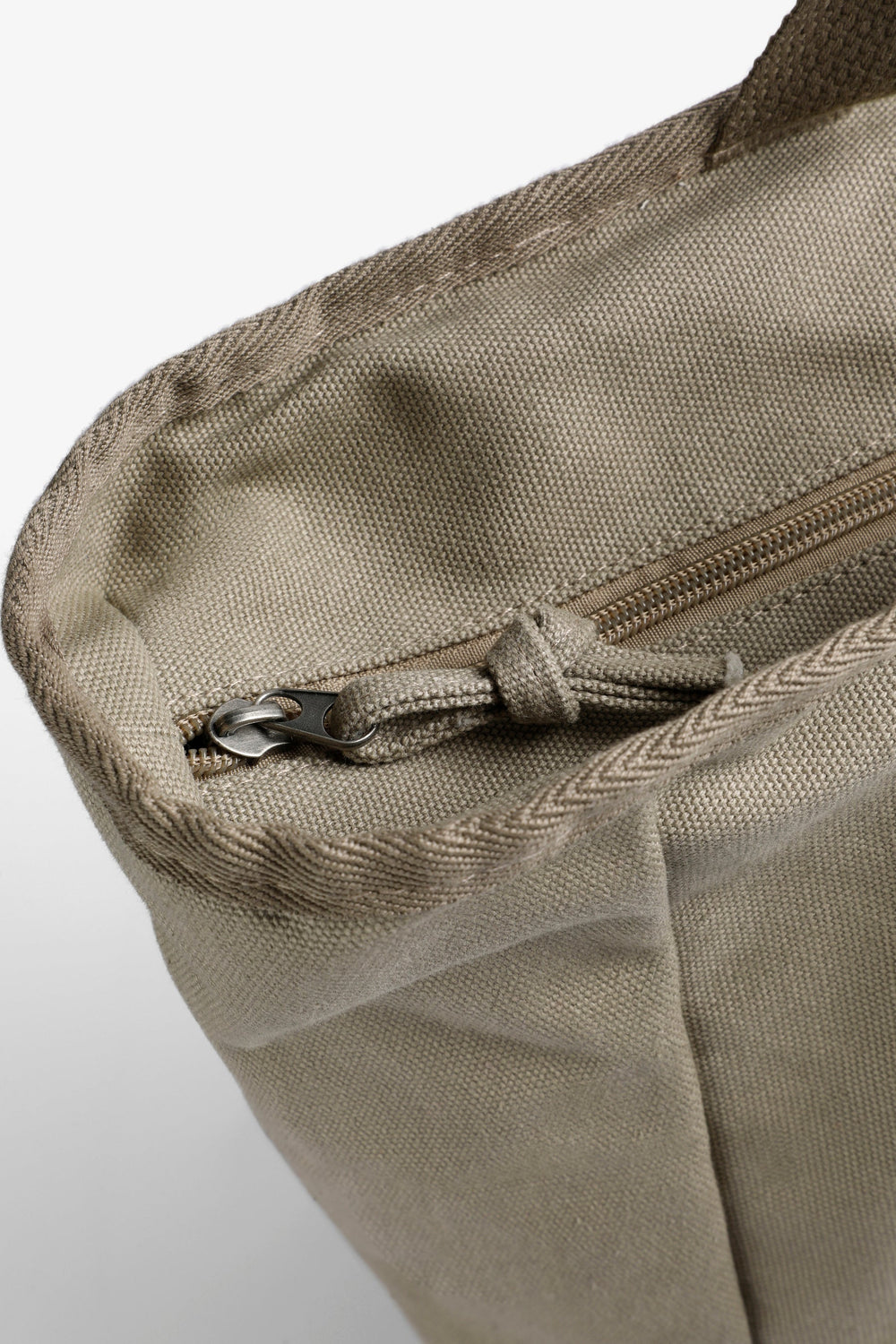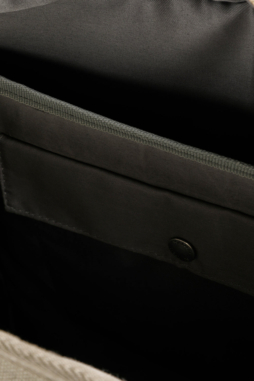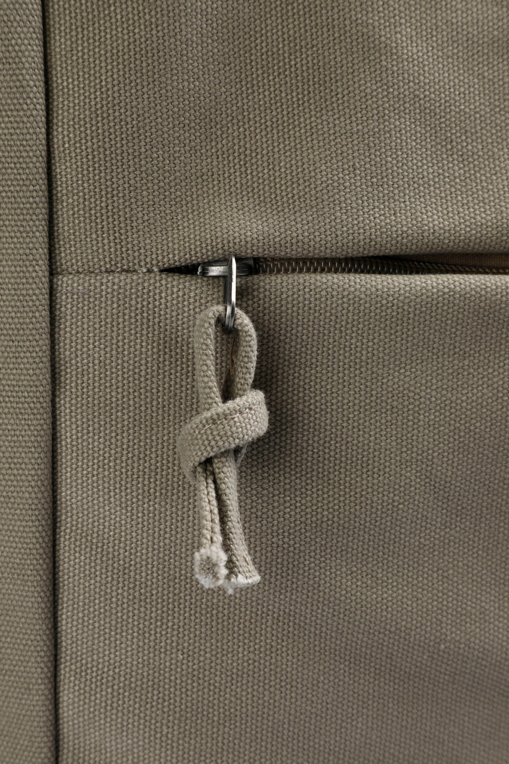 Bolsa con funcionalidad doble de mochila. Confeccionada en tejido canvas reciclado. Cierre con cremallera. Bolsillo interior. Asas cortas superiores y traseras ajustables. Detalle de print frontal de logo y calavera.