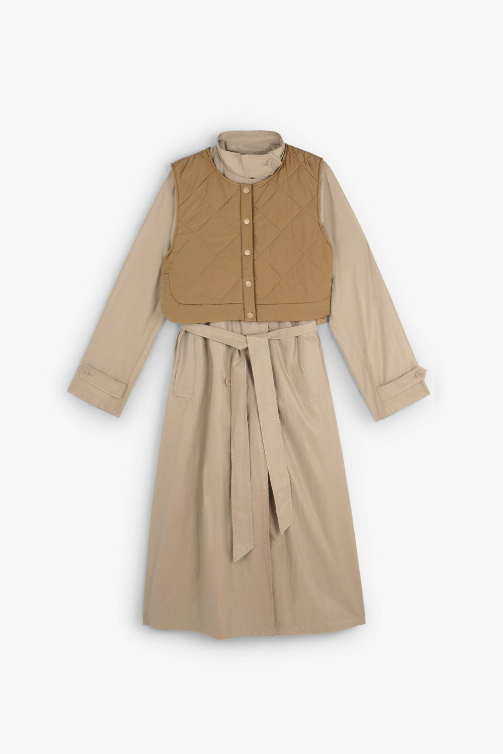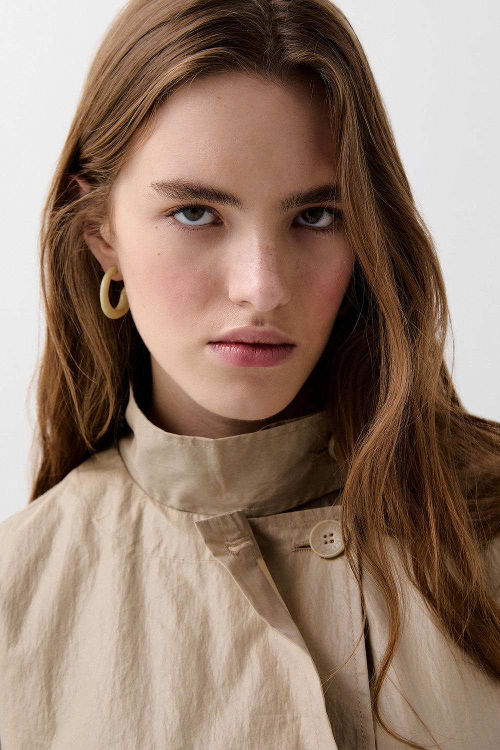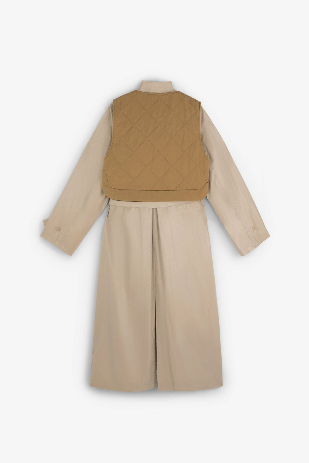 Trench confeccionado en tejido encerado. Ligeramente oversize, cuello con botón de cierre y cierre con botones. Manga larga terminada en puño con botón. Chaleco acolchado desmontable y multiposición tanto por encima como dentro del chaleco.