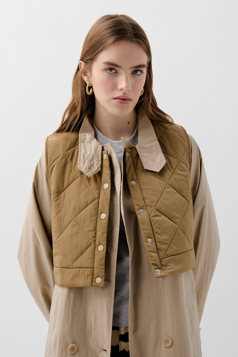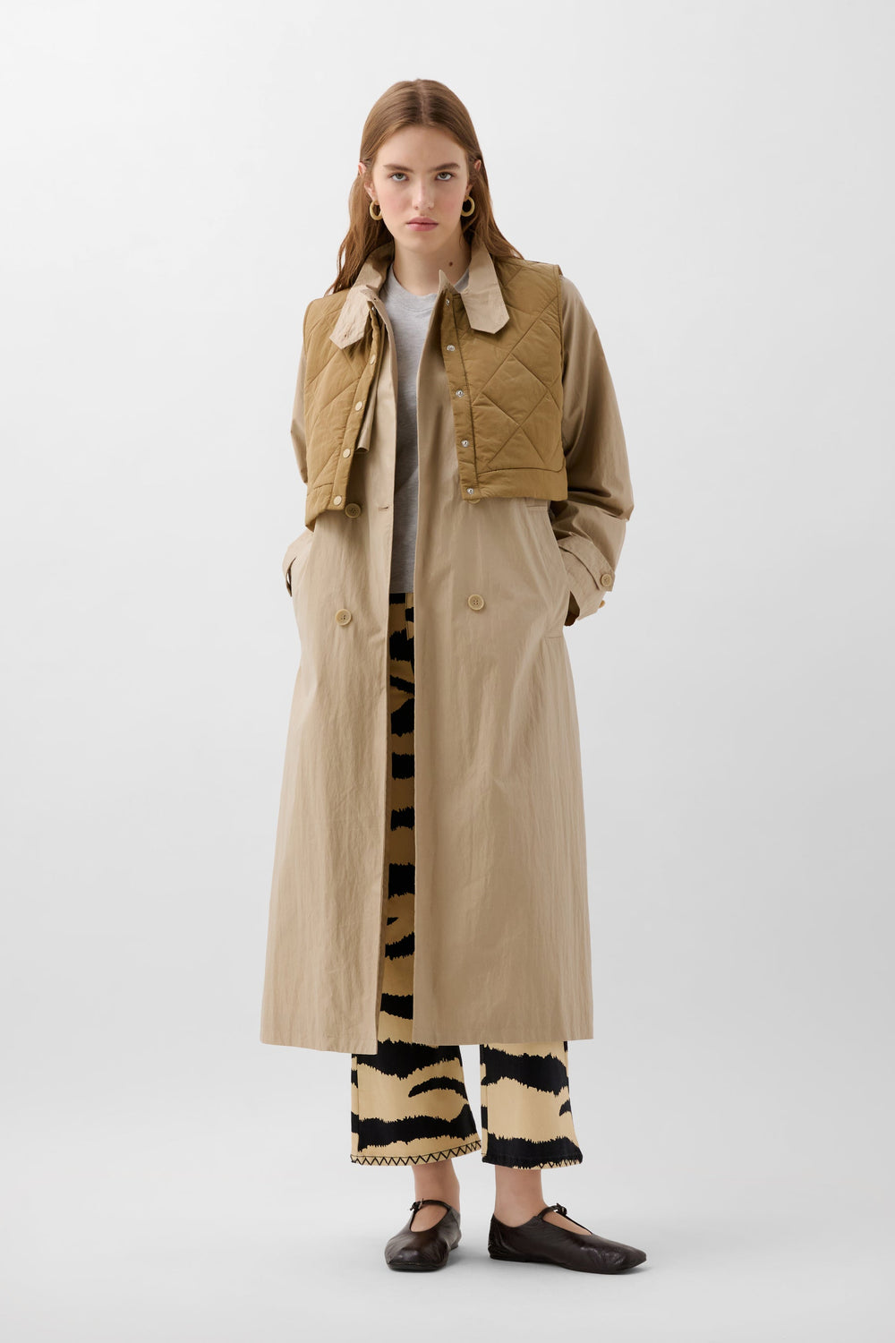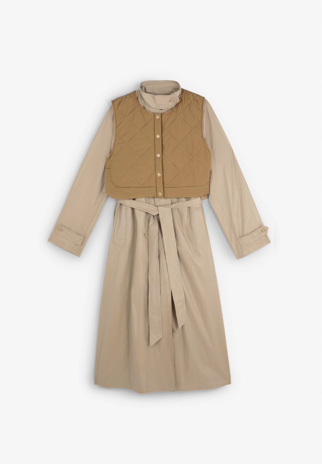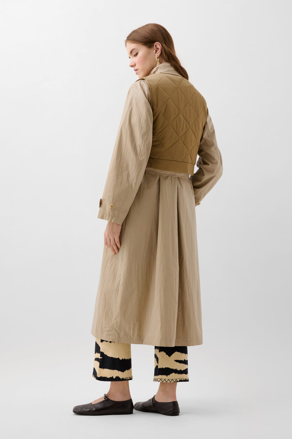Trench confeccionado en tejido encerado. Ligeramente oversize, cuello con botón de cierre y cierre con botones. Manga larga terminada en puño con botón. Chaleco acolchado desmontable y multiposición tanto por encima como dentro del chaleco.