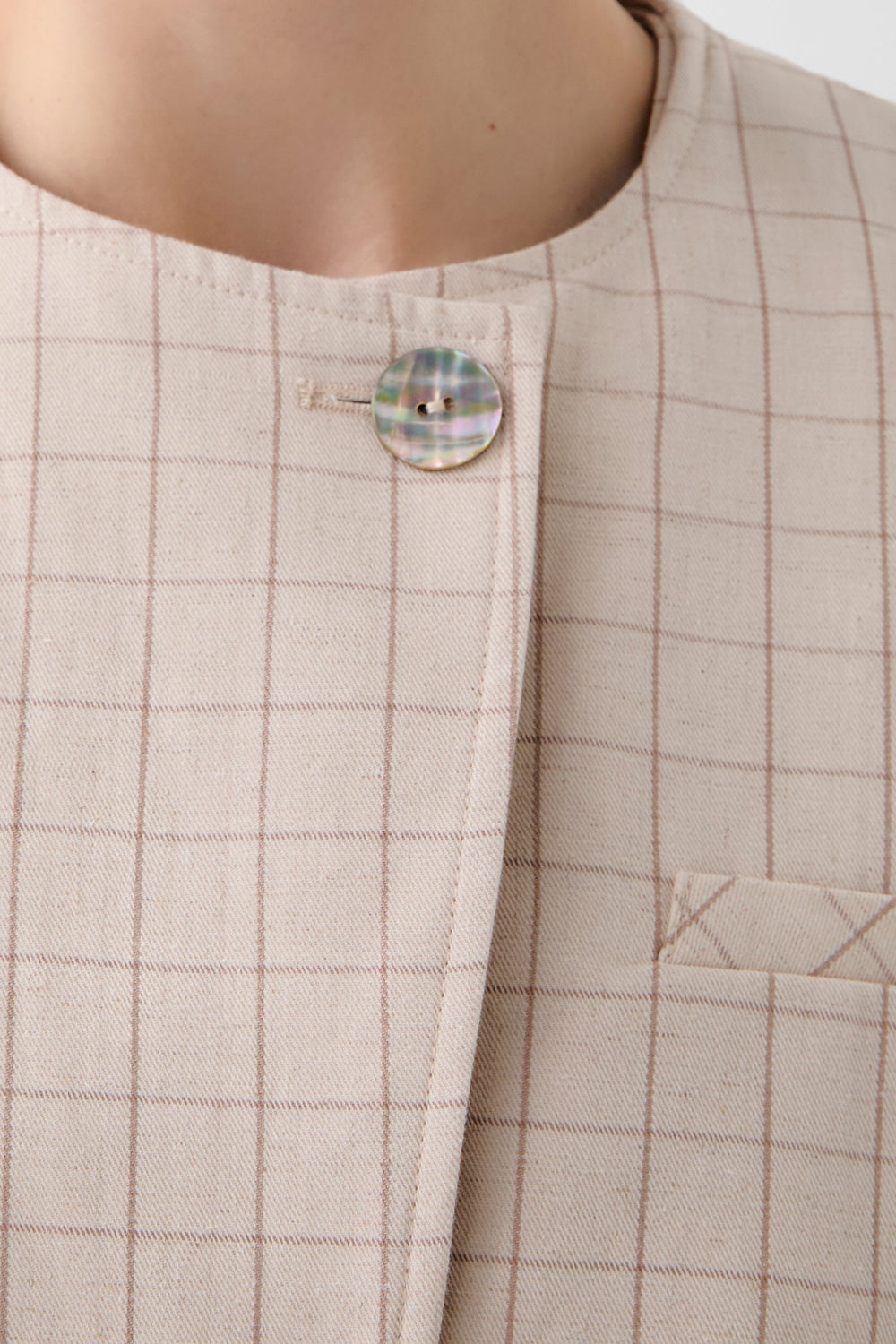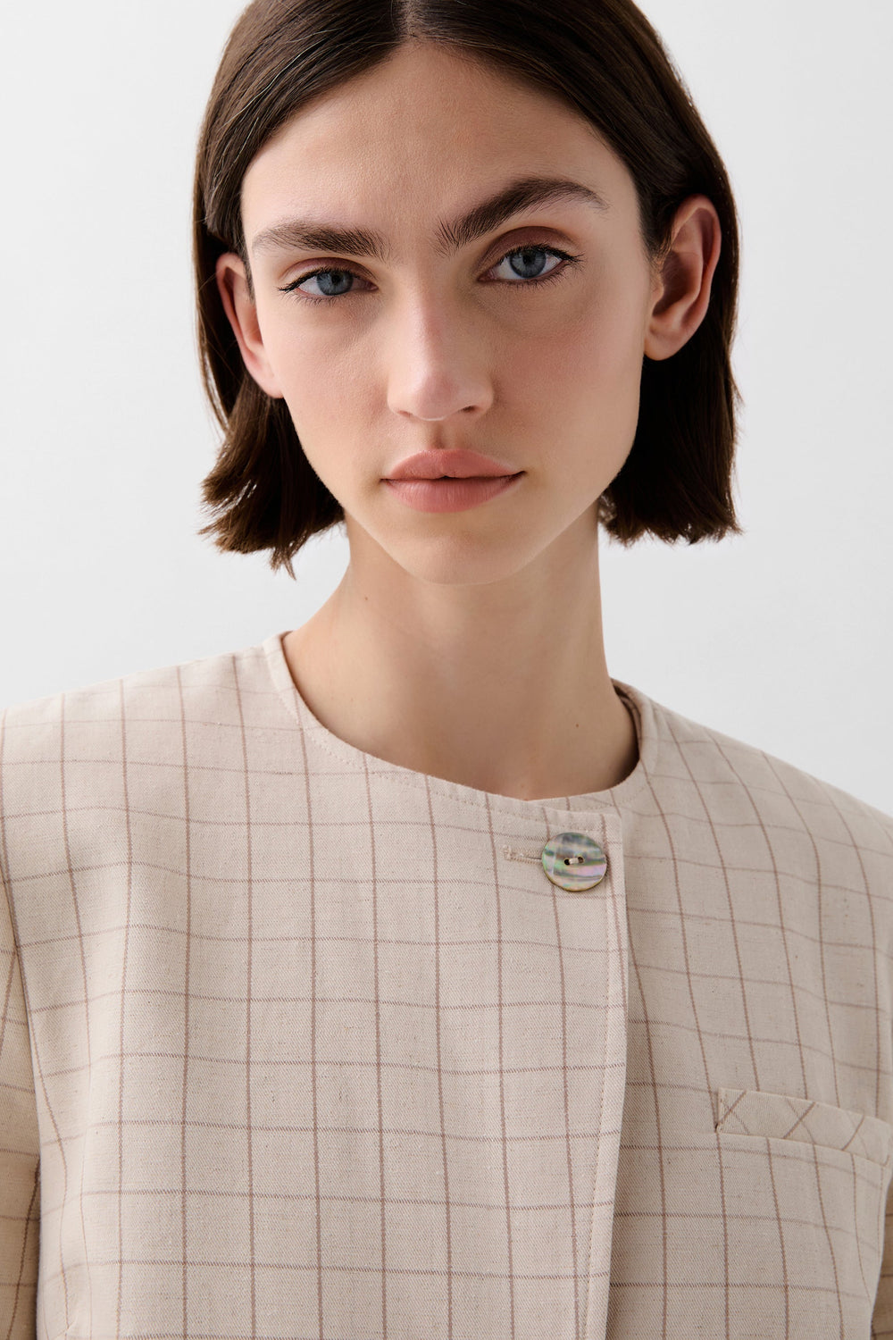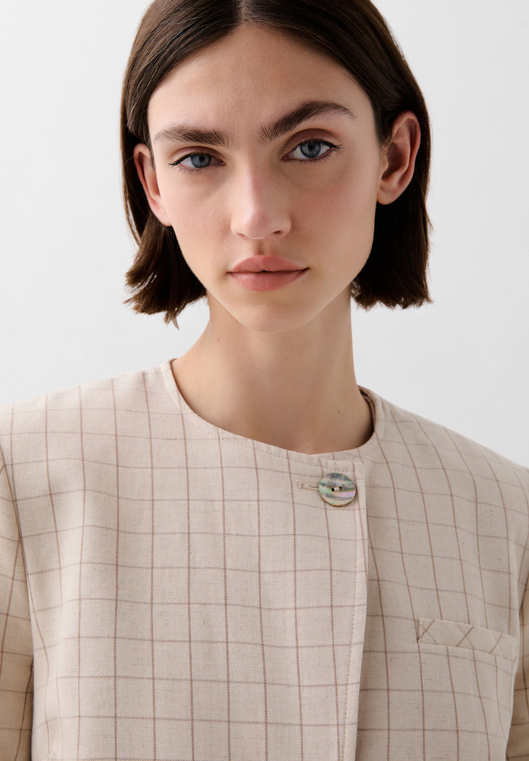 Blazer confeccionada en mezcla de algodón y lino. Corte Regular Fit, cuello de solapa multiposición. Exterior estampado de cuadros, forro interior de rayas. Cierre con botones y bolsillos frontales con vivo.