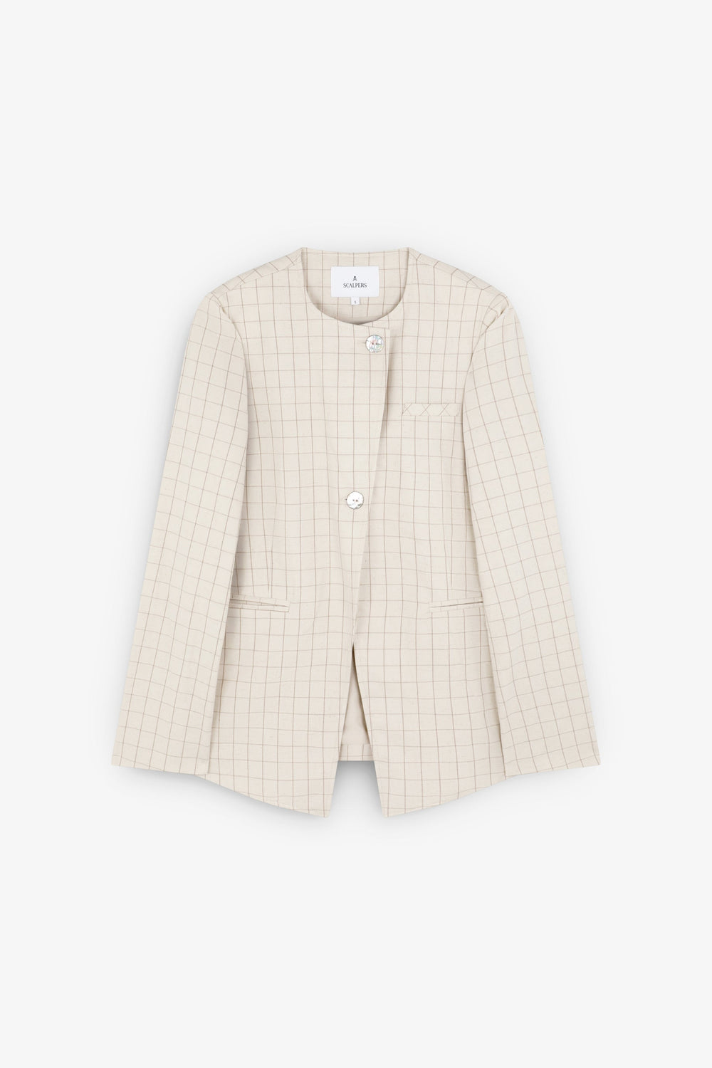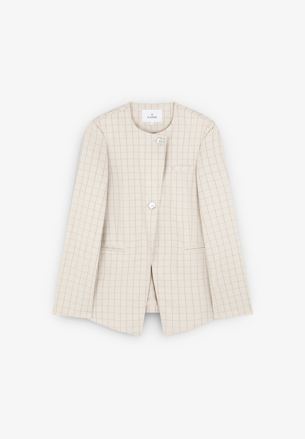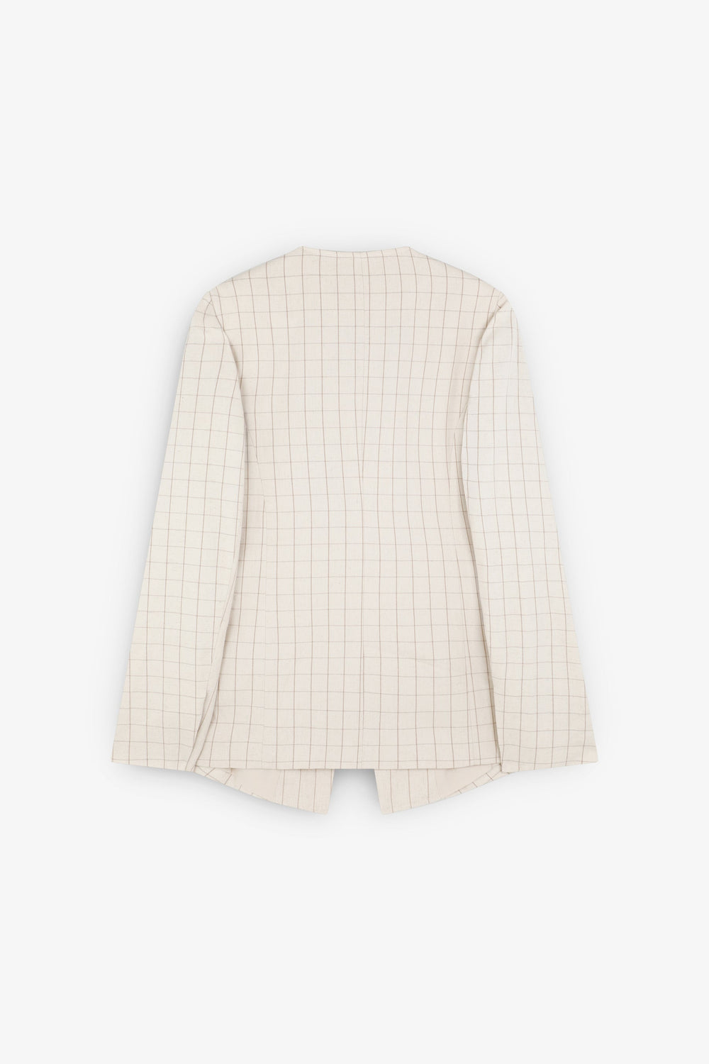 Blazer confeccionada en mezcla de algodón y lino. Corte Regular Fit, cuello de solapa multiposición. Exterior estampado de cuadros, forro interior de rayas. Cierre con botones y bolsillos frontales con vivo.