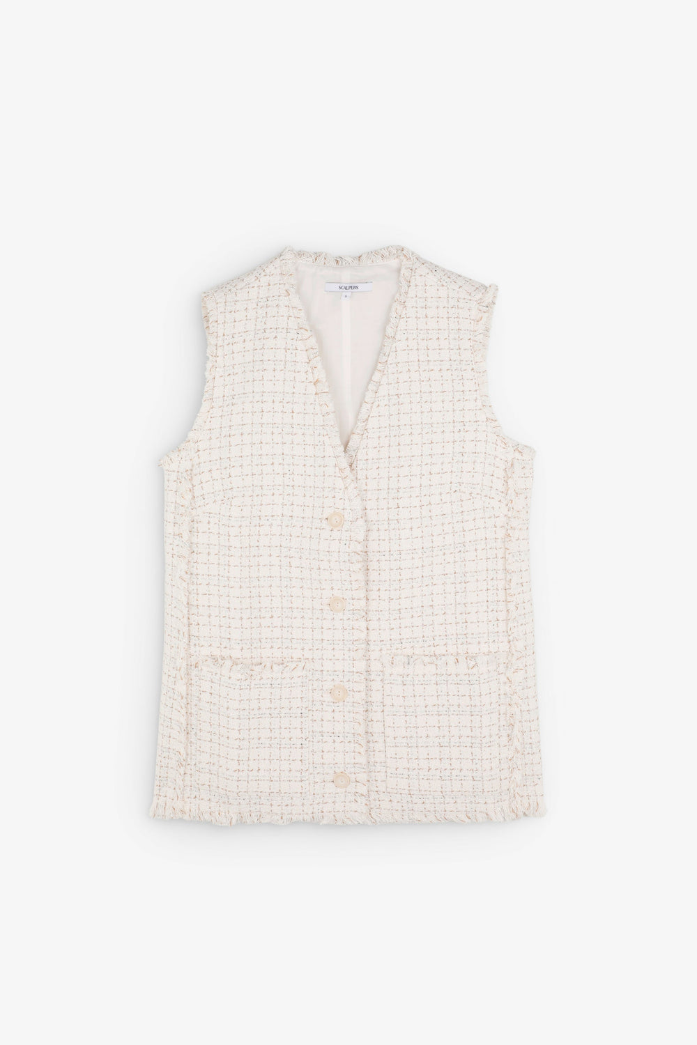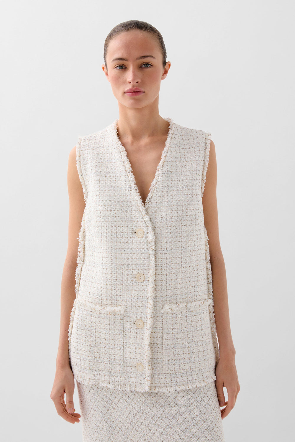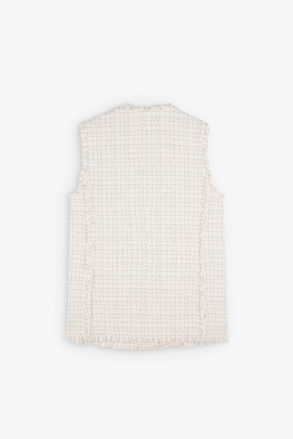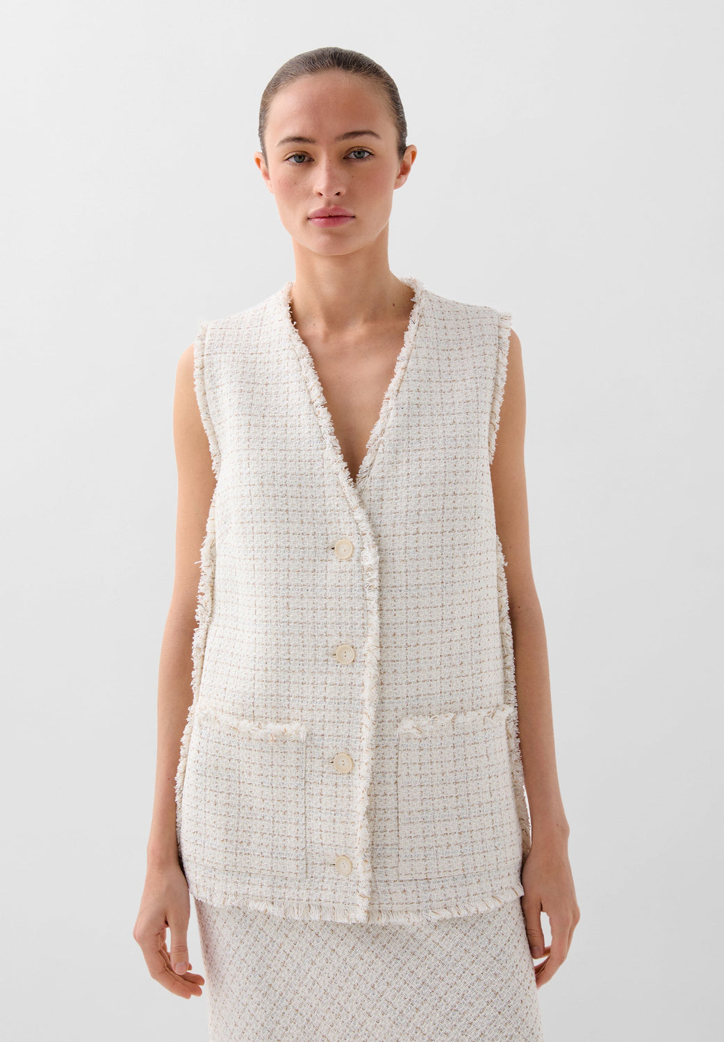 Chaleco confeccionado en mezcla de algodón con hilo metalizado. Corte Regular fit, escote de pico y cierre con botones. Manga en sisa con detalles desflecados en manga y el bajo. Bolsillos de parche frontales.