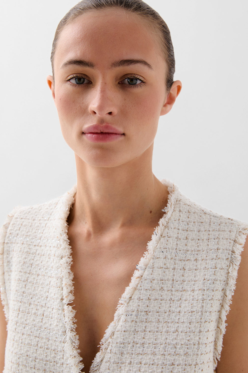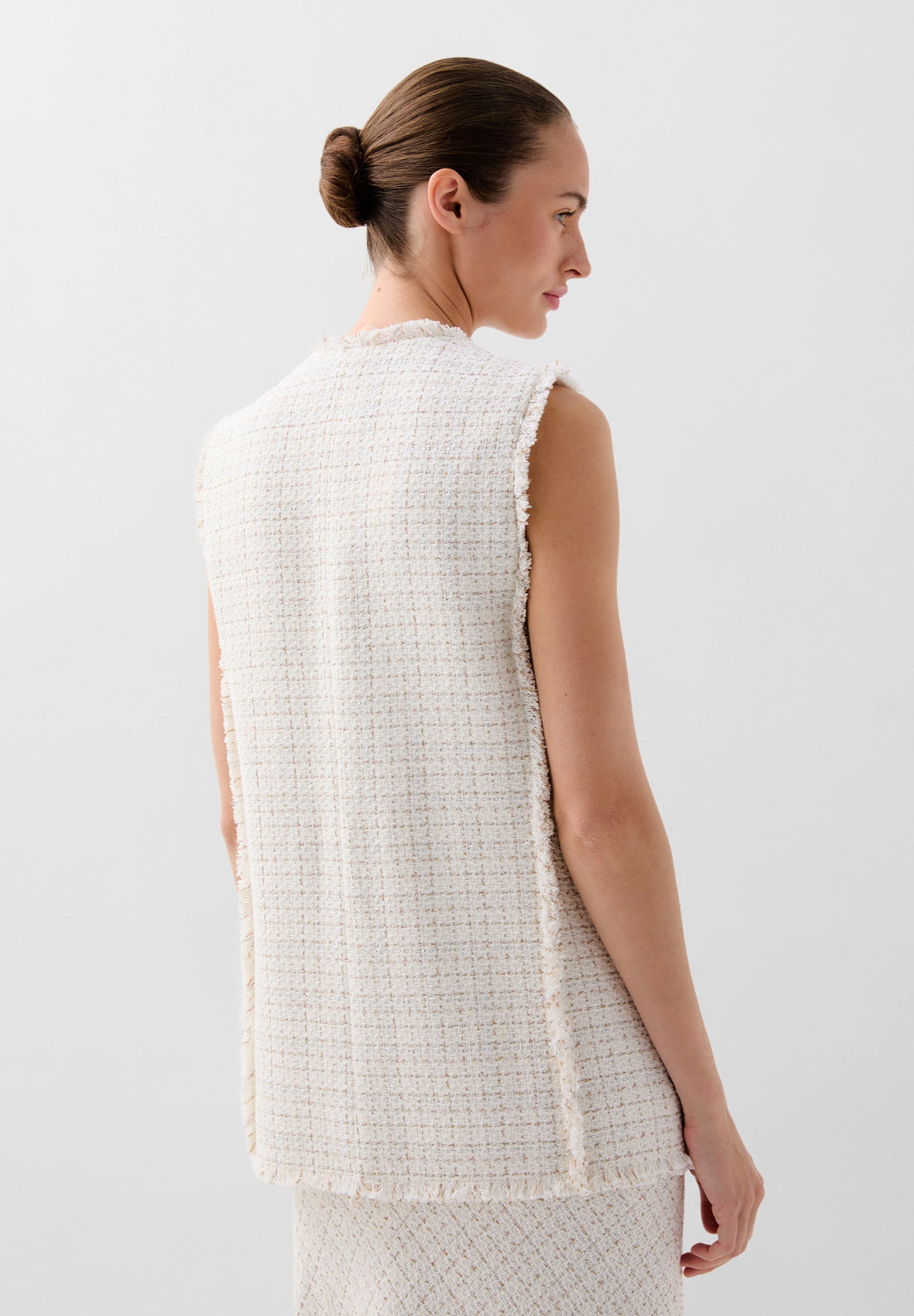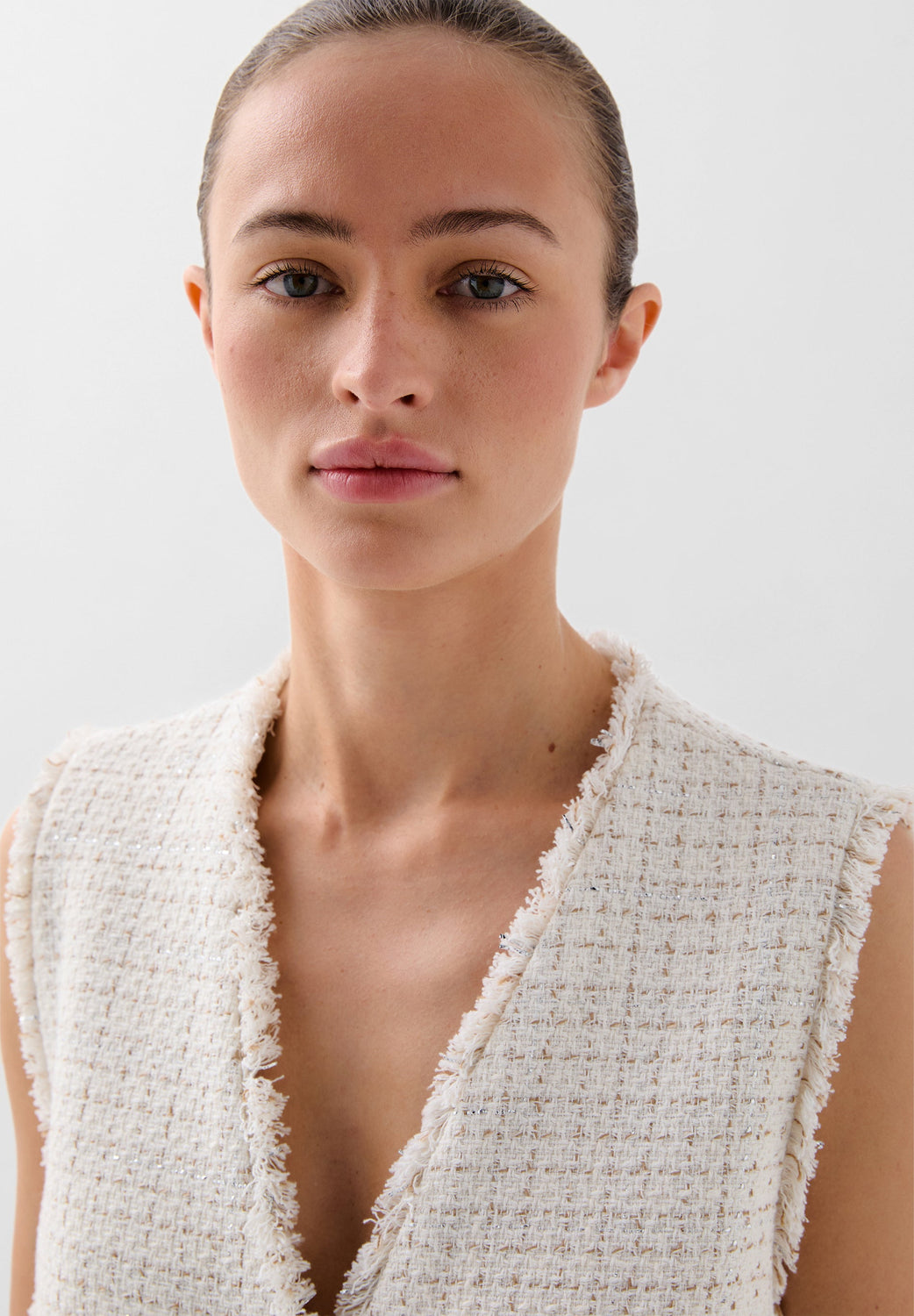 Chaleco confeccionado en mezcla de algodón con hilo metalizado. Corte Regular fit, escote de pico y cierre con botones. Manga en sisa con detalles desflecados en manga y el bajo. Bolsillos de parche frontales.