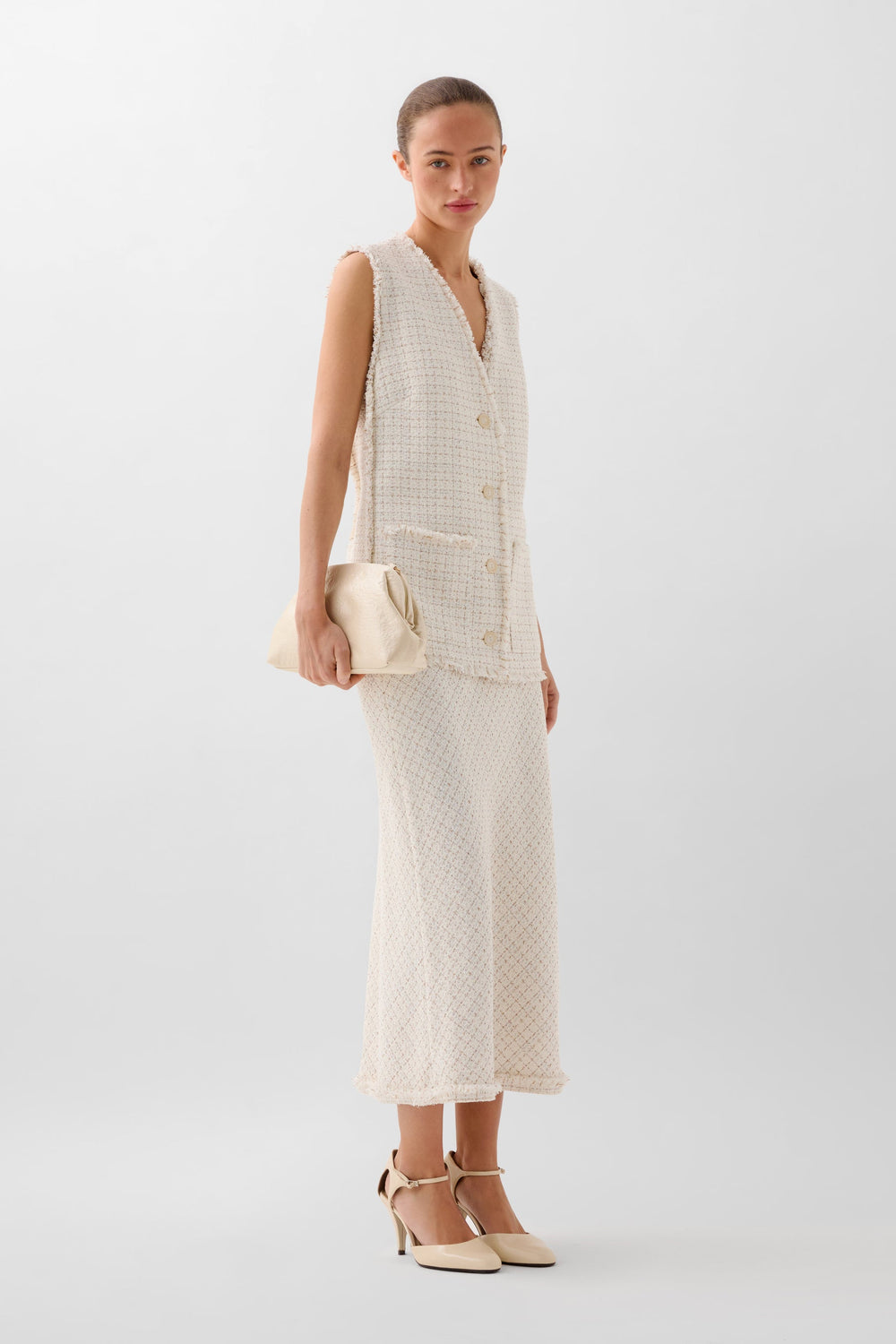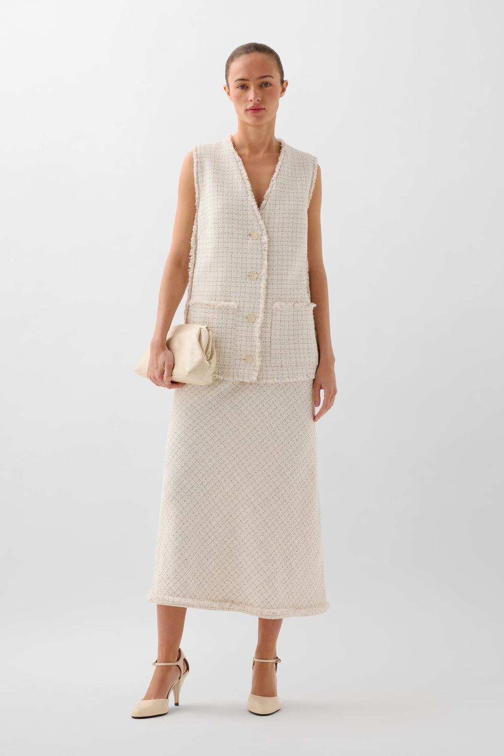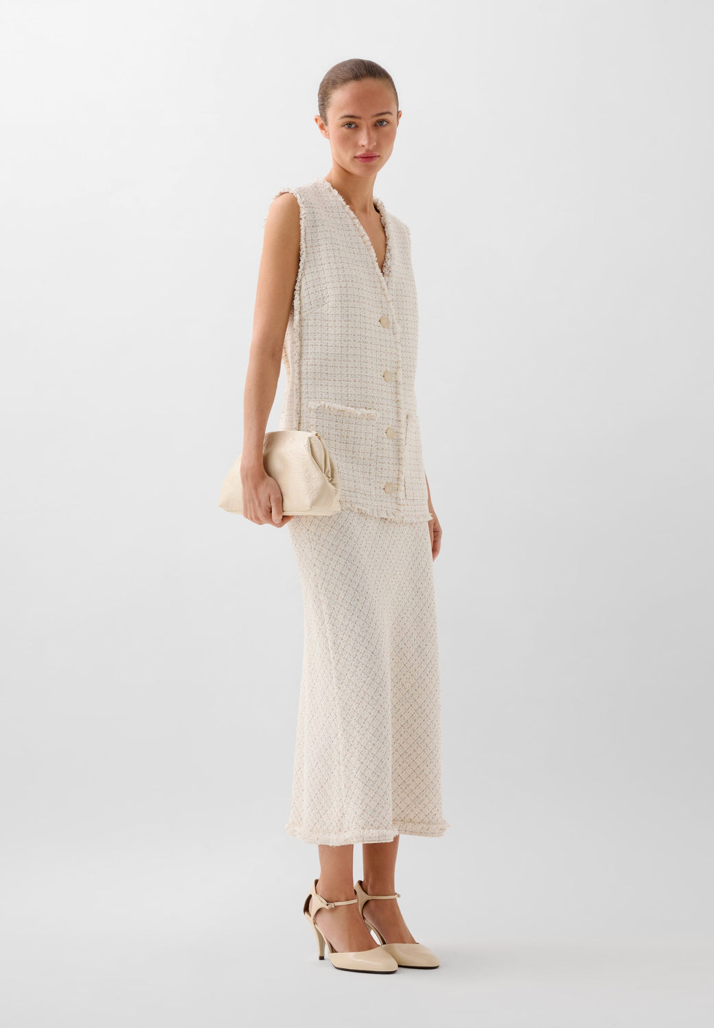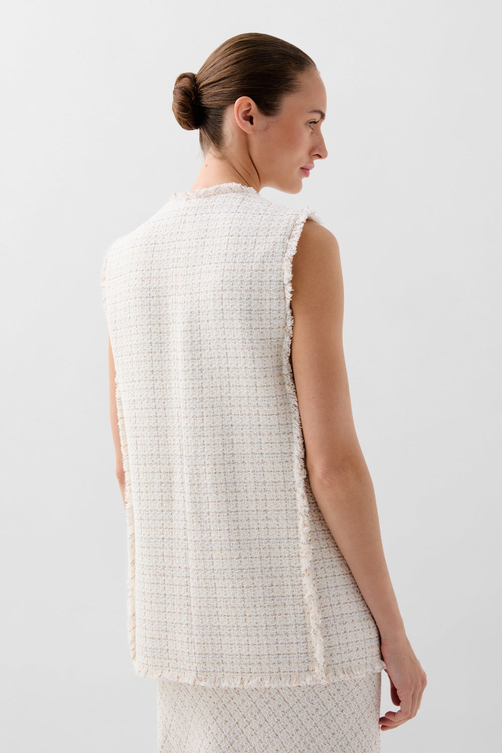 Chaleco confeccionado en mezcla de algodón con hilo metalizado. Corte Regular fit, escote de pico y cierre con botones. Manga en sisa con detalles desflecados en manga y el bajo. Bolsillos de parche frontales.