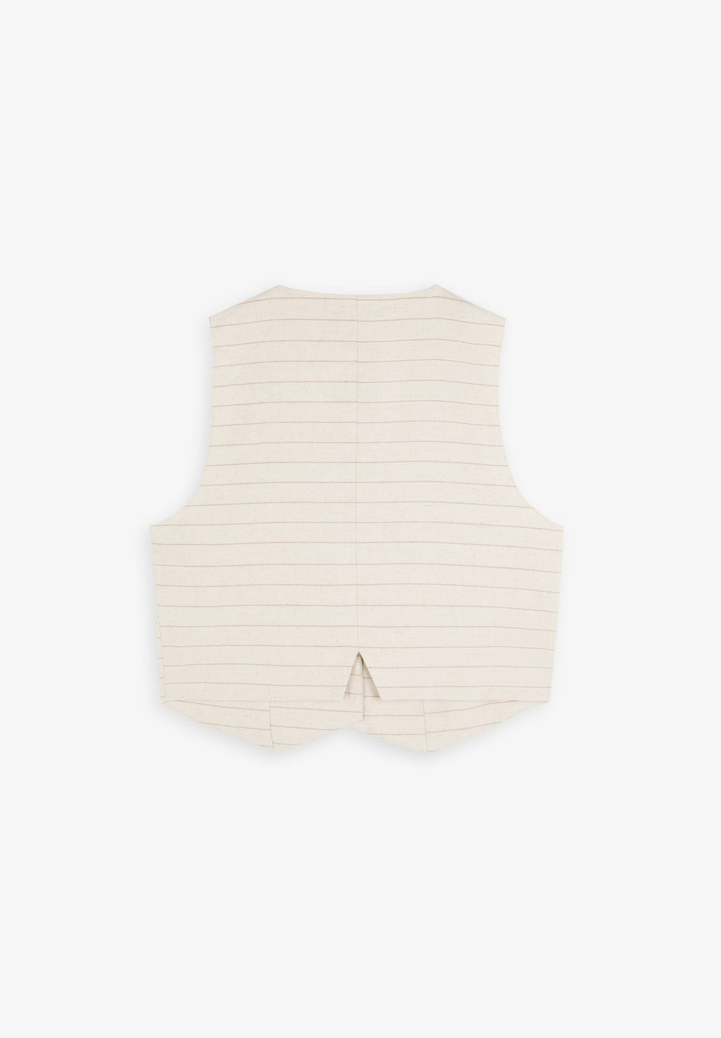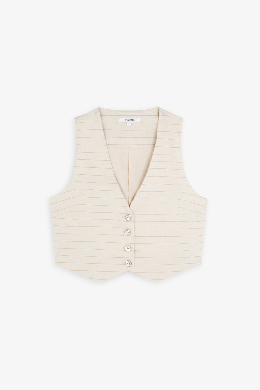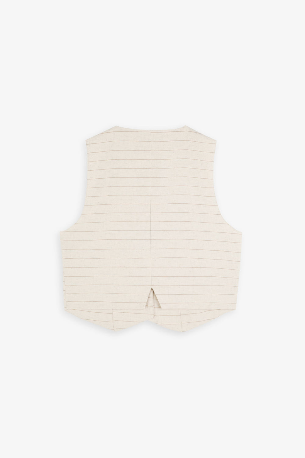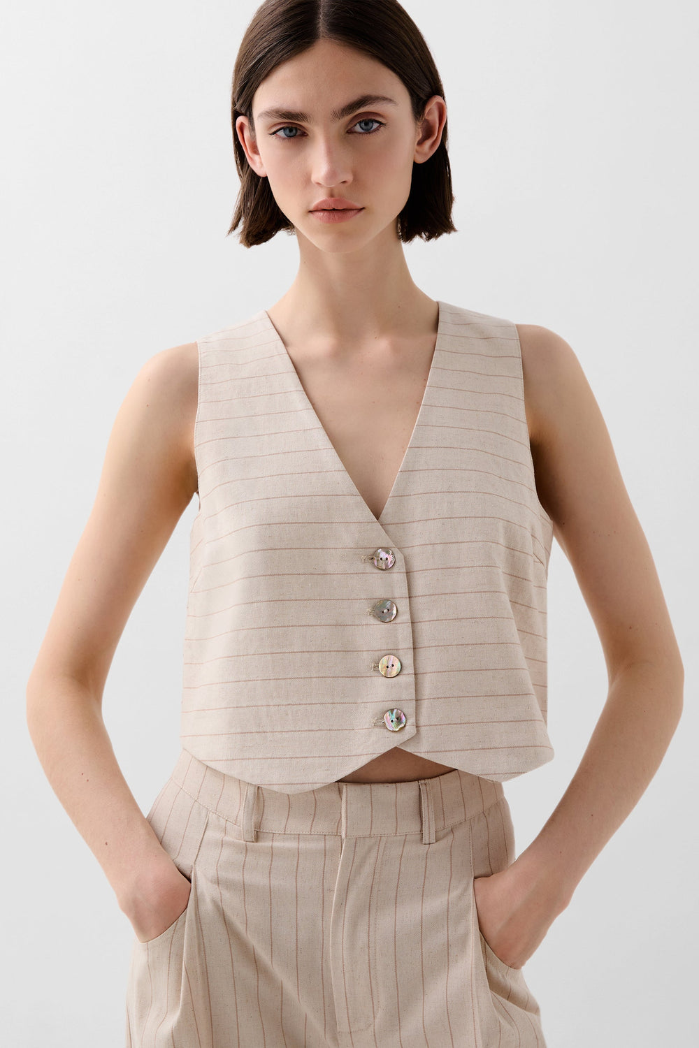 Chaleco de rayas confeccionado en mezcla de algodón y lino. Corte ligeramente cropped, escote en pico y cierre con botones efecto nacarado.