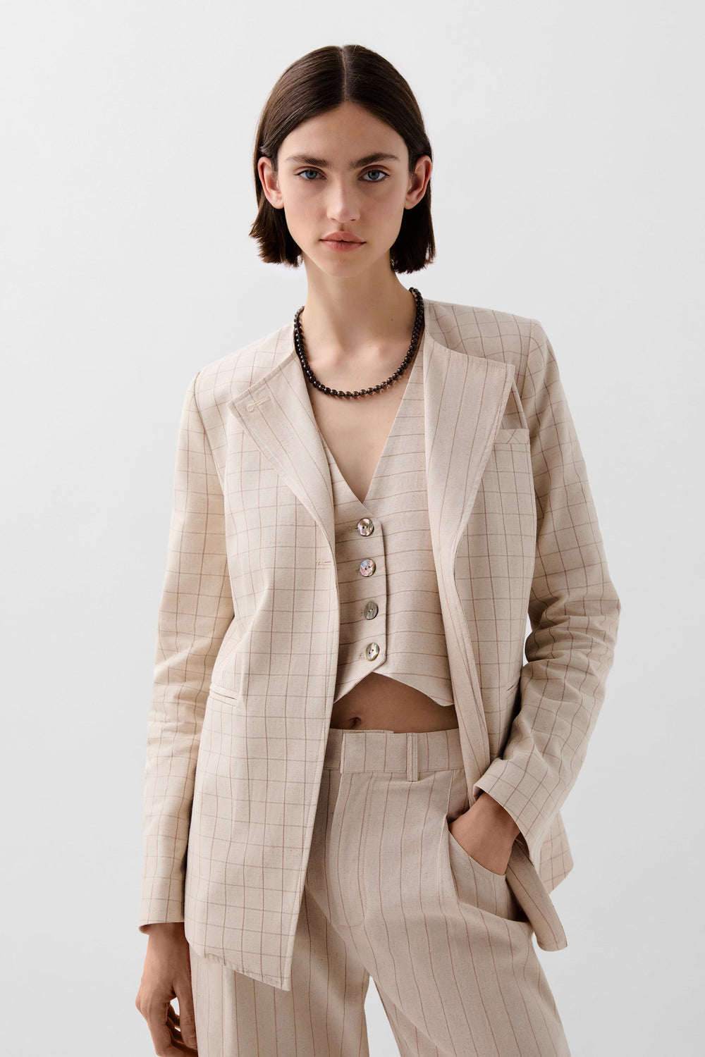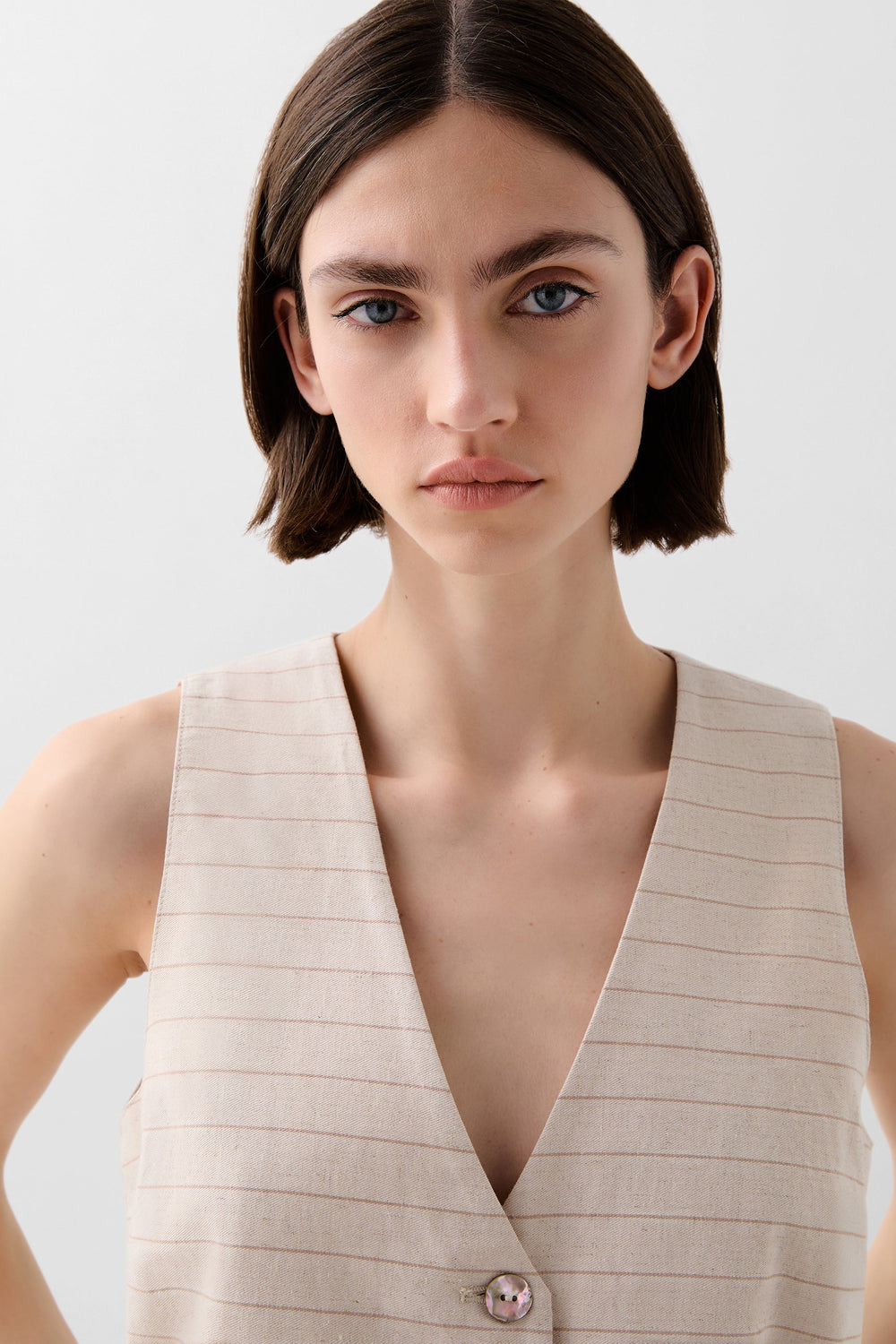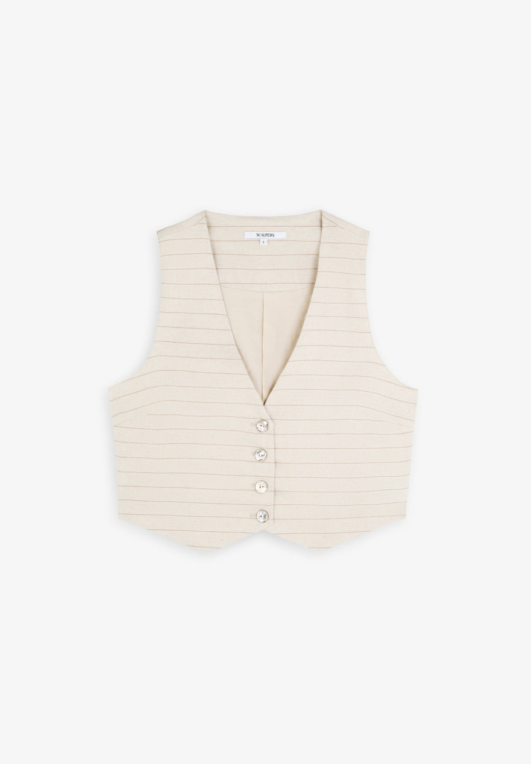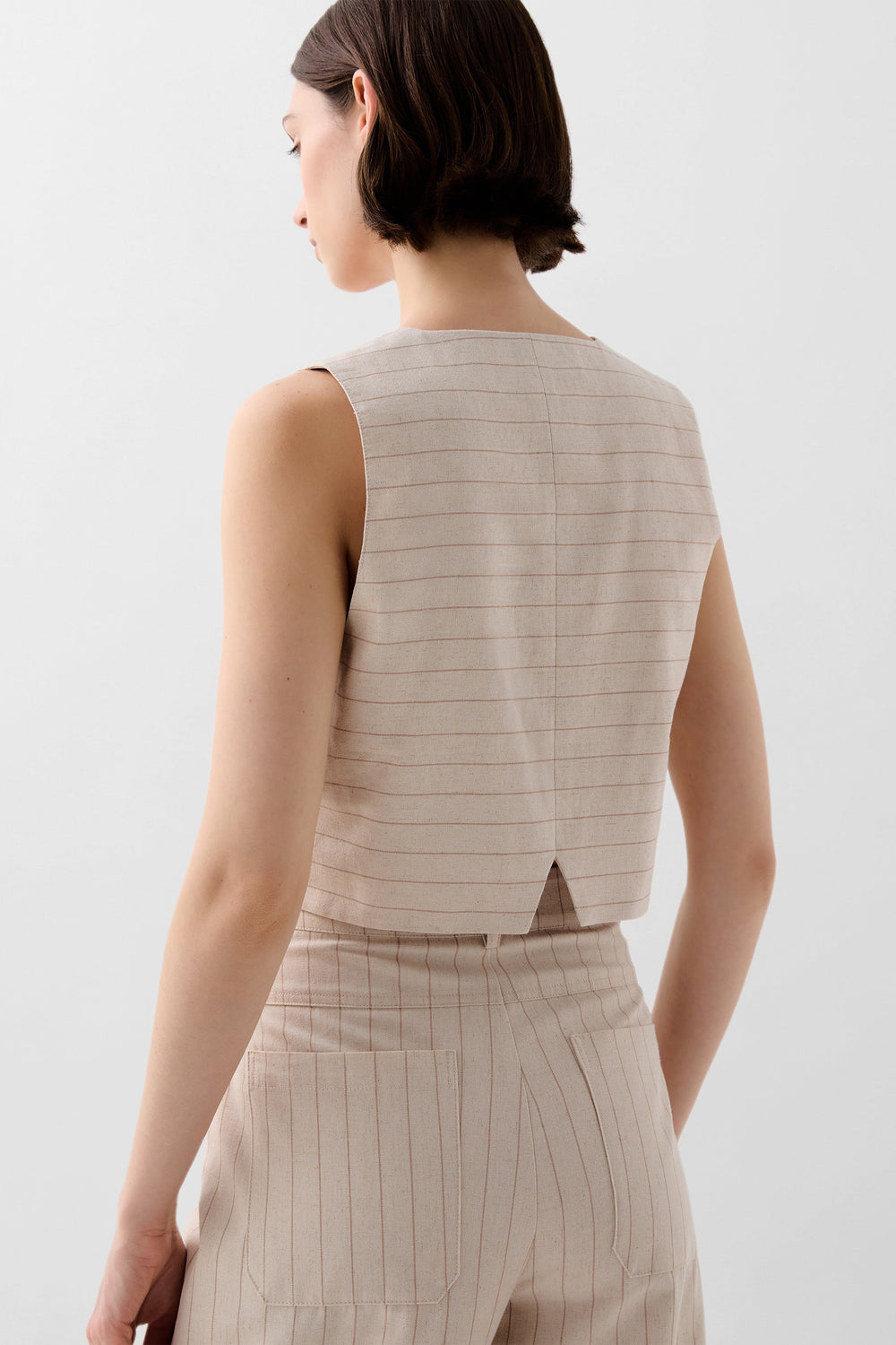 Chaleco de rayas confeccionado en mezcla de algodón y lino. Corte ligeramente cropped, escote en pico y cierre con botones efecto nacarado.