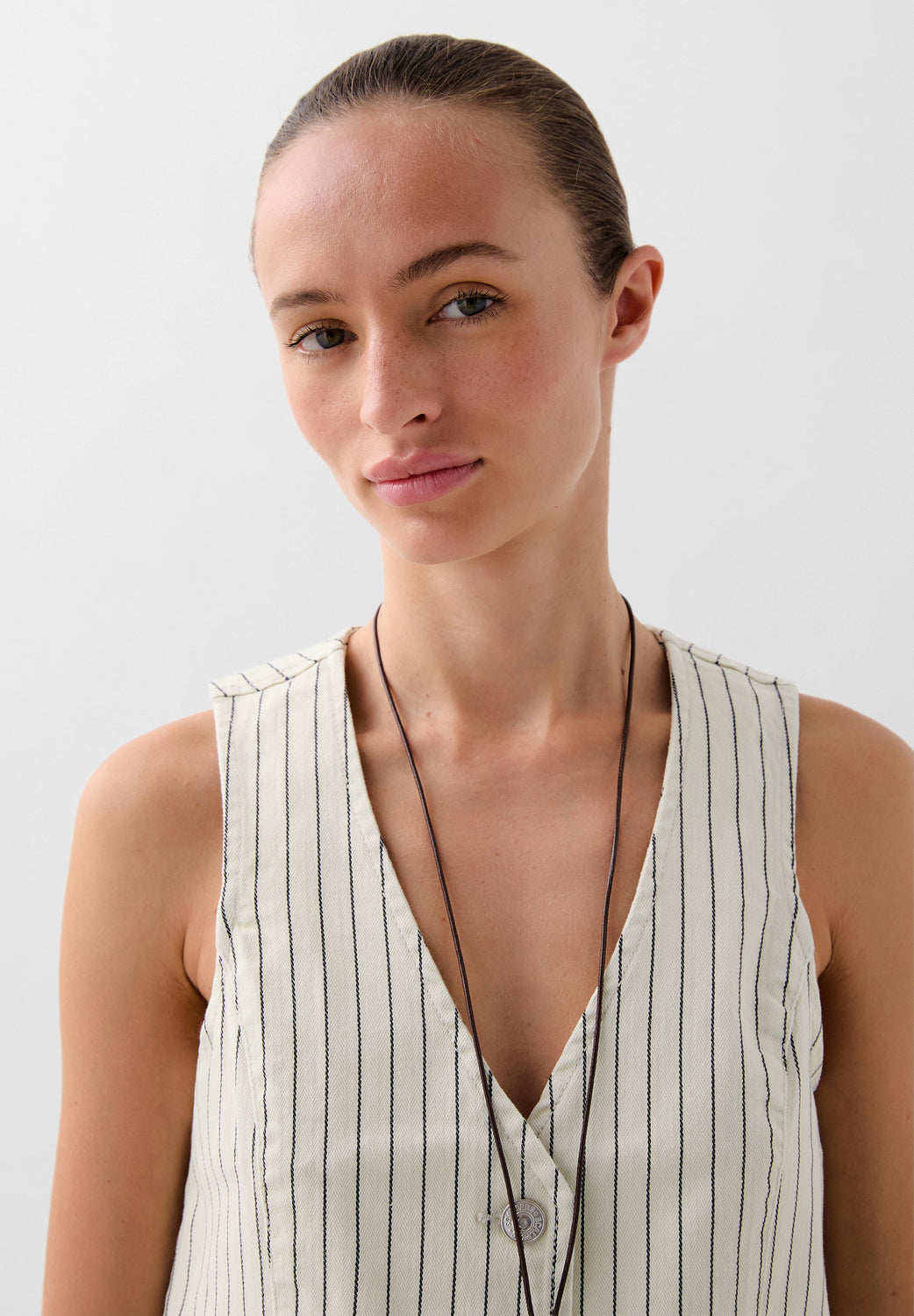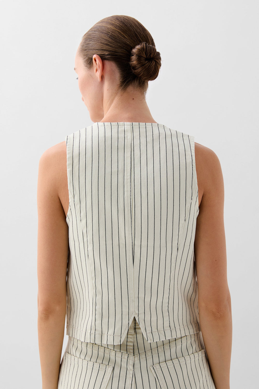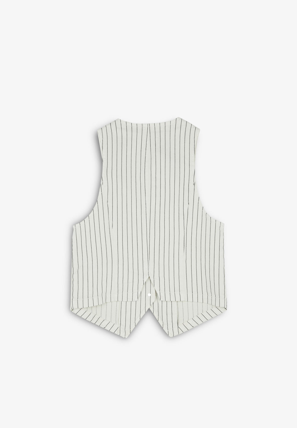 Chaleco denim con estampado de rayas confeccionado en algodón BCI ligeramente elástico. Escote en V, manga en sisa y cierre con botones. Bolsillos de vivo frontales.