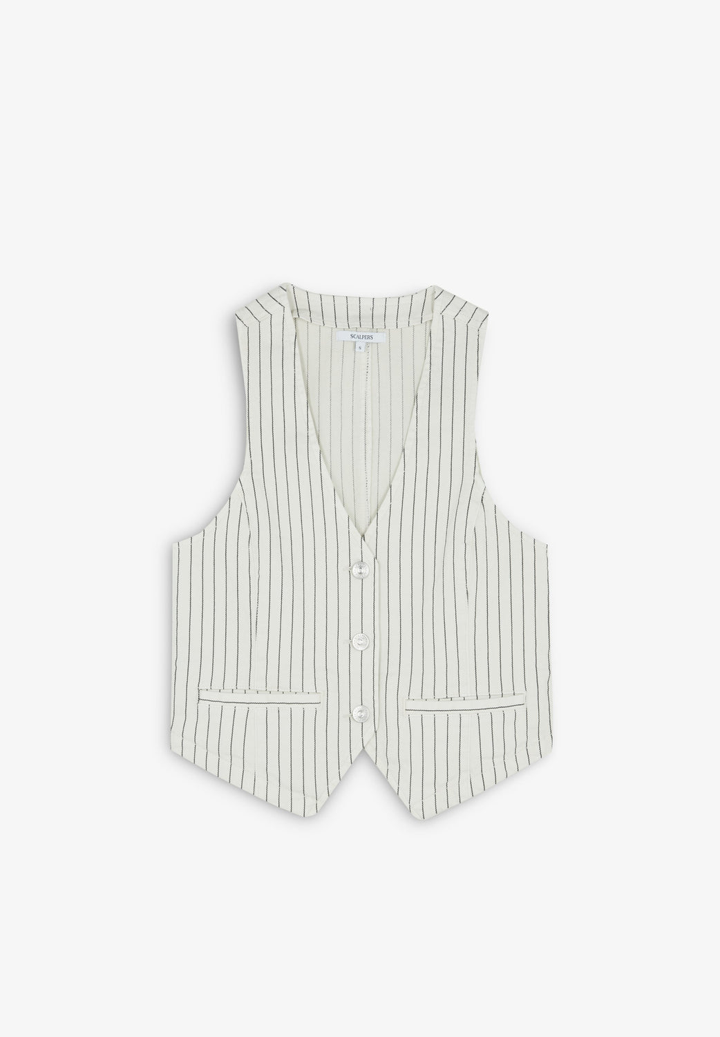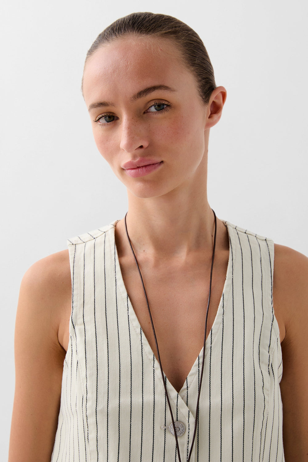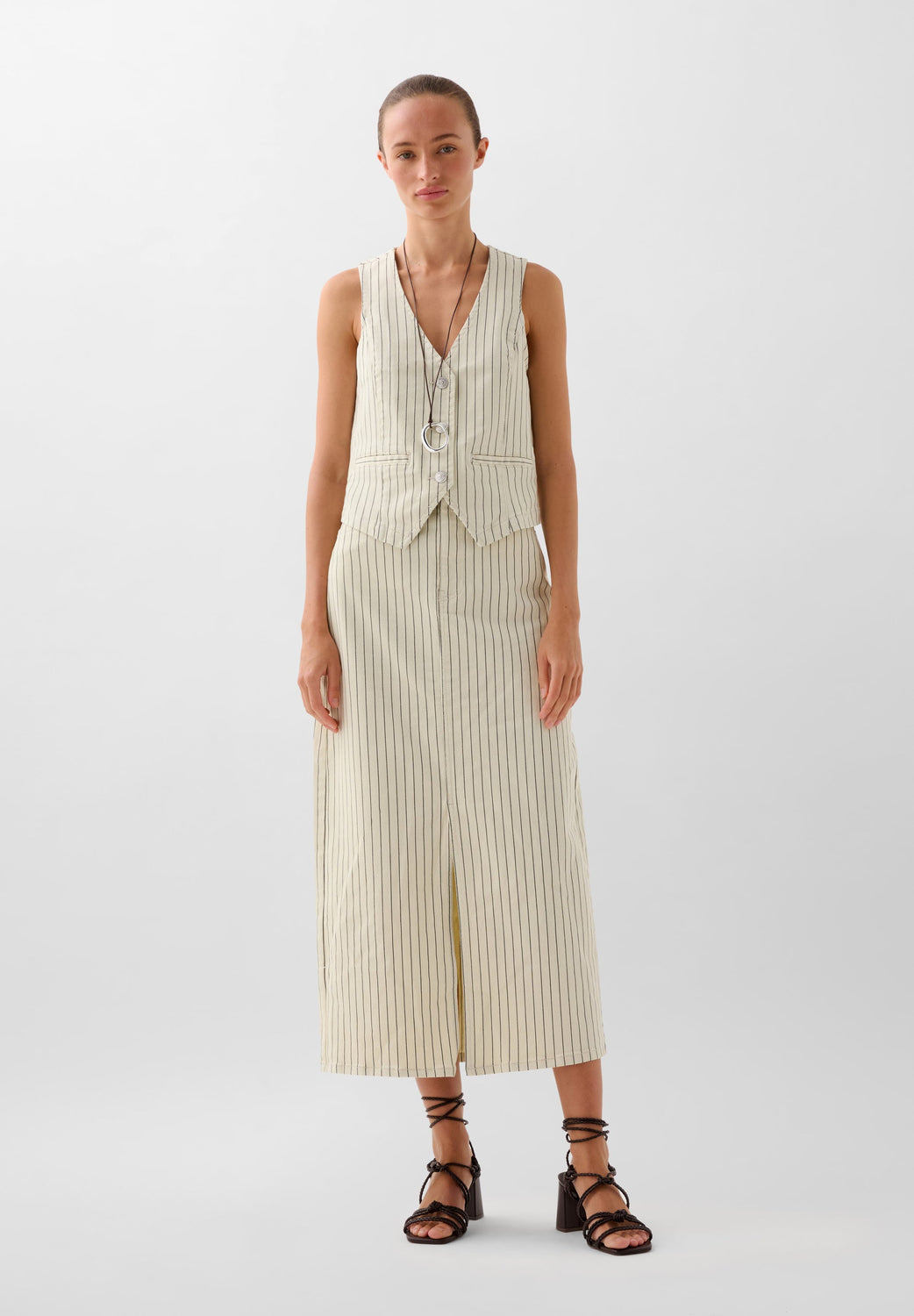 Chaleco denim con estampado de rayas confeccionado en algodón BCI ligeramente elástico. Escote en V, manga en sisa y cierre con botones. Bolsillos de vivo frontales.