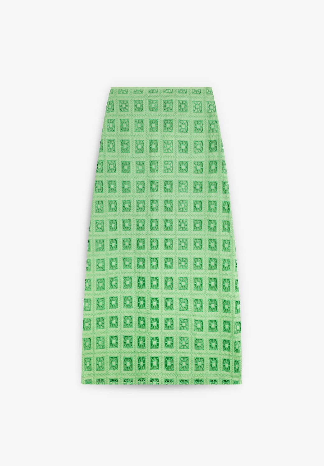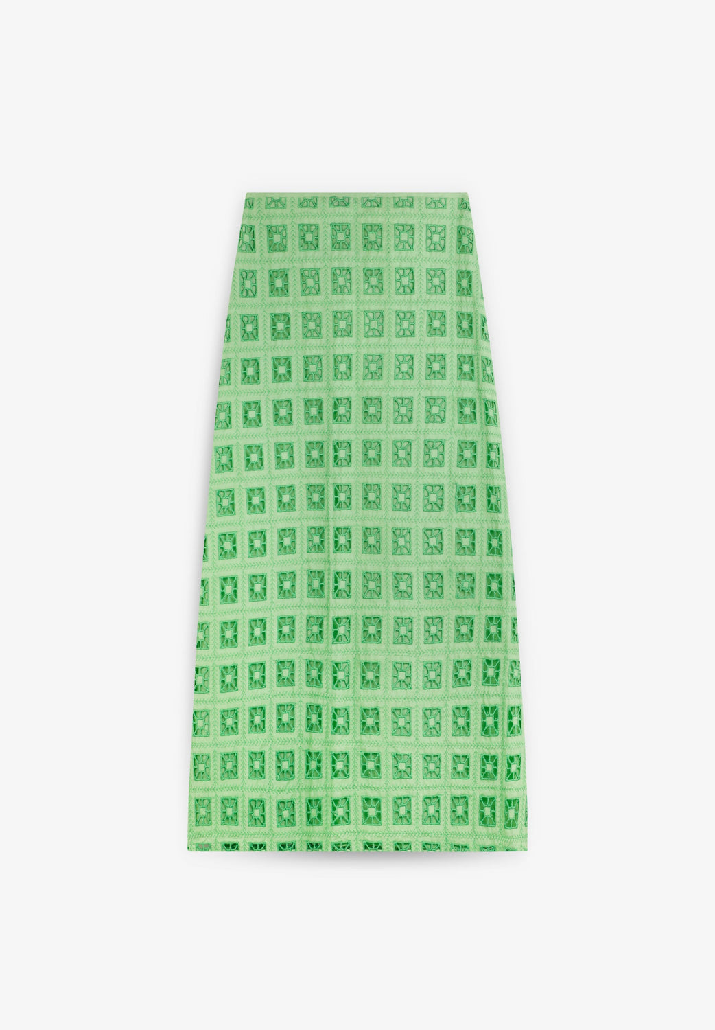 Falda confeccionada en 100% algodón con bordados. Corte midi con cierre de cremallera oculta.