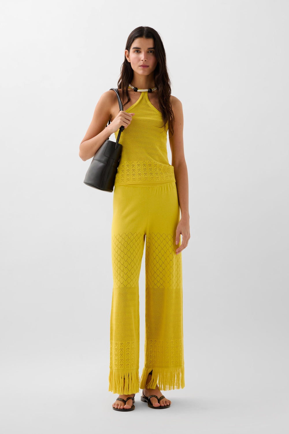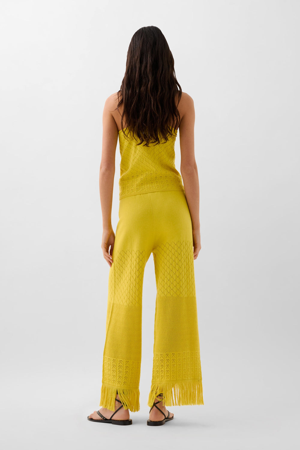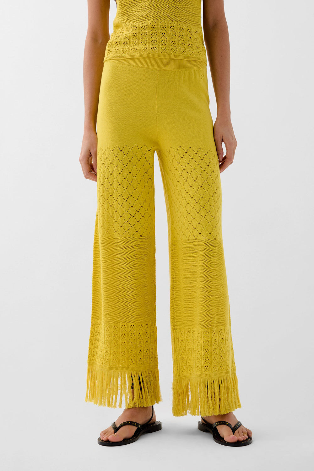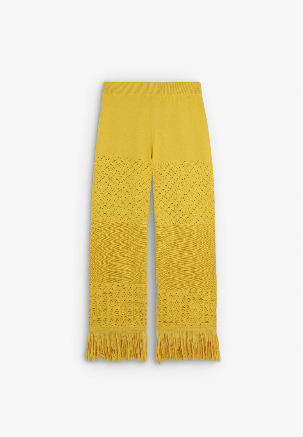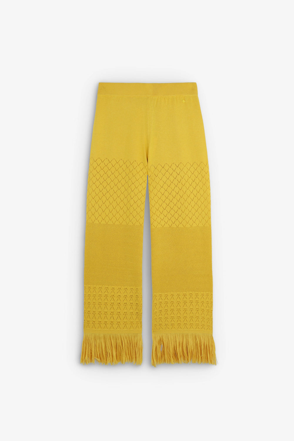 Pantalón de punto pointelle confeccionado en Algodón. Rib en cintura. Detalle desflecado en bajos.