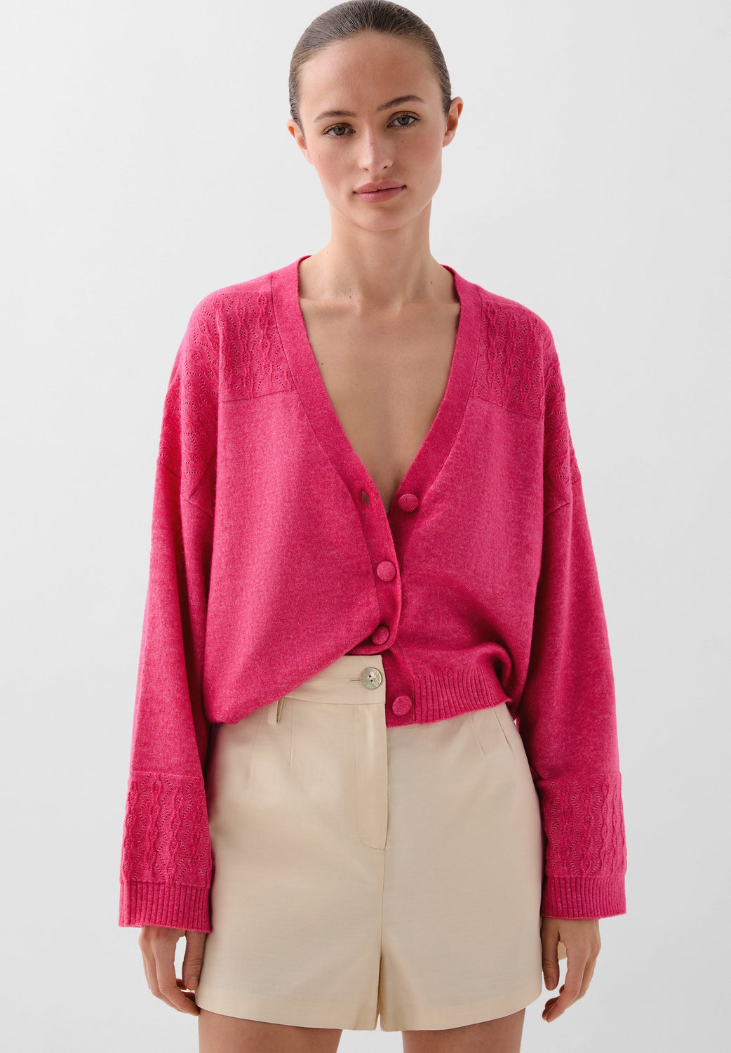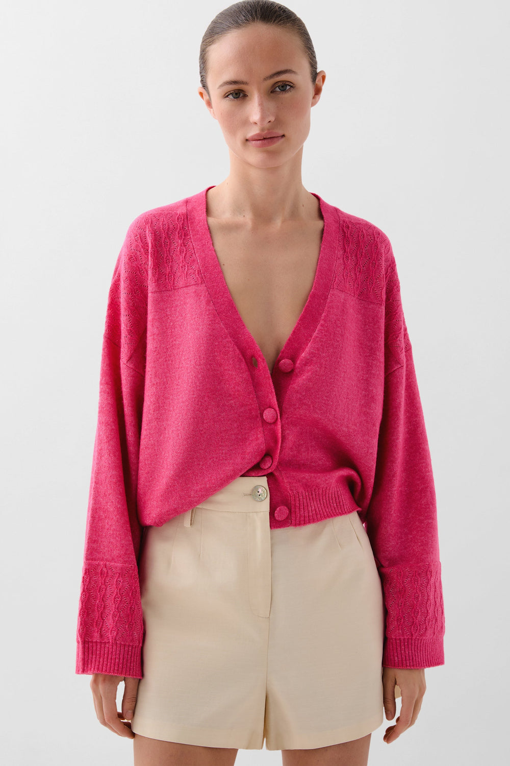 Cárdigan confeccionado en mezcla de lana. Regular fit, cuello de pico y cierre con botones. Manga larga y bolsillos.