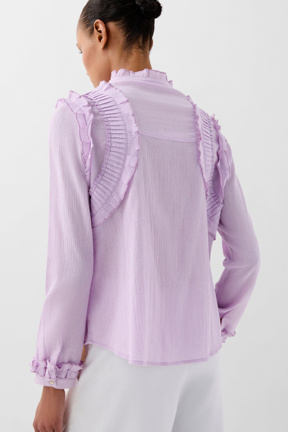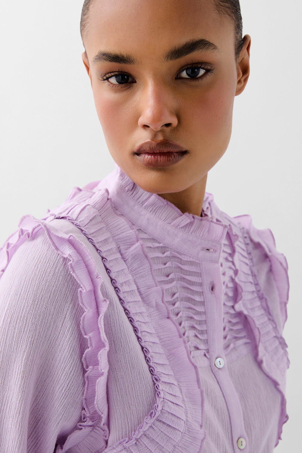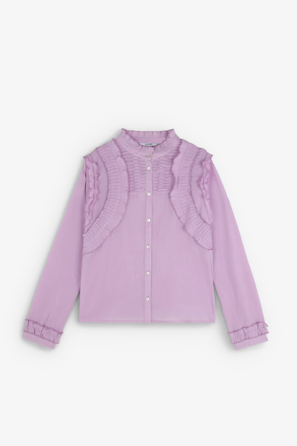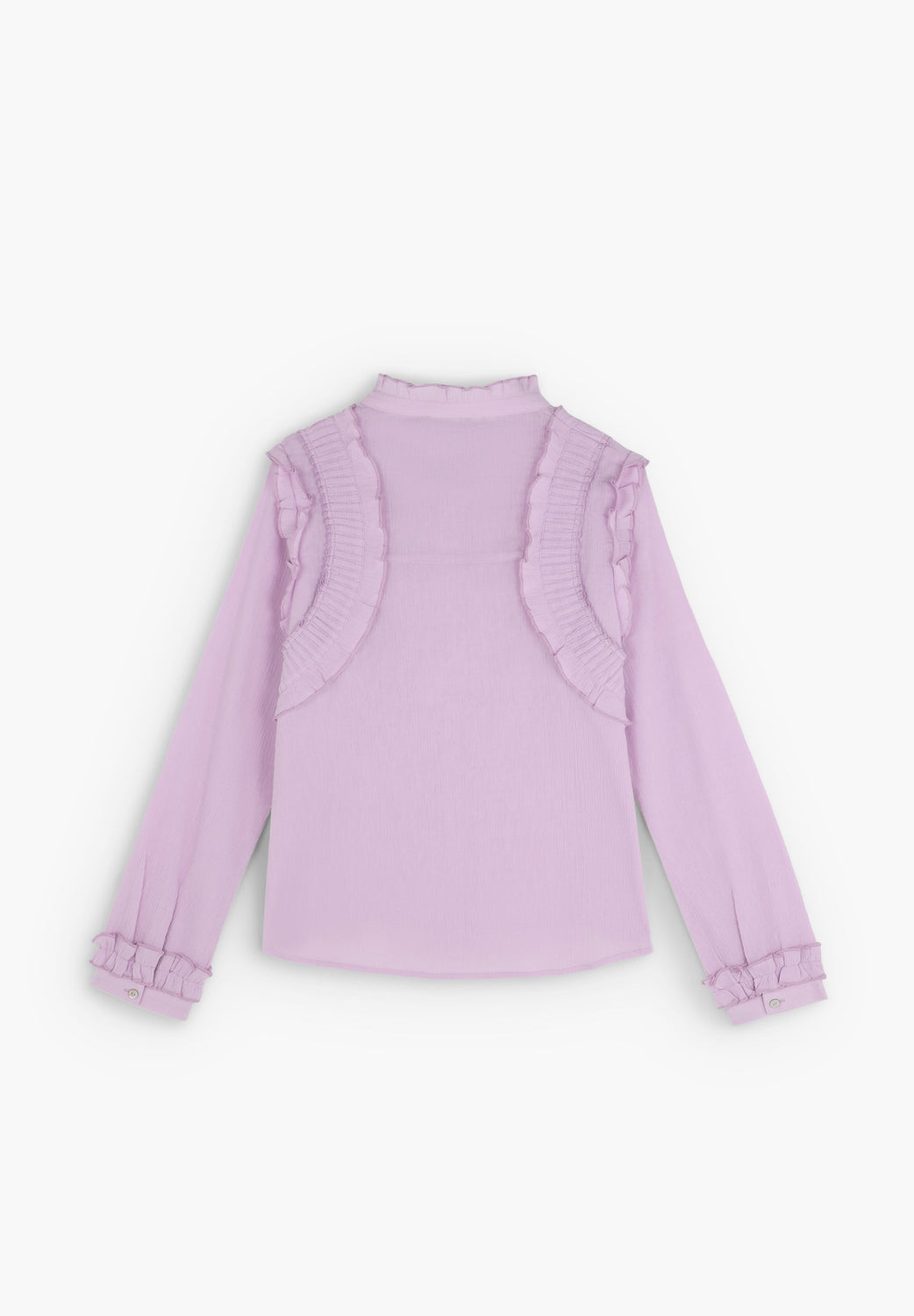 Camisa confeccionada en 100% algodón. Corte regular fit, cuello subido con detalles de frunces. Cierre con botones. Manga larga con detalle de botón en puño.