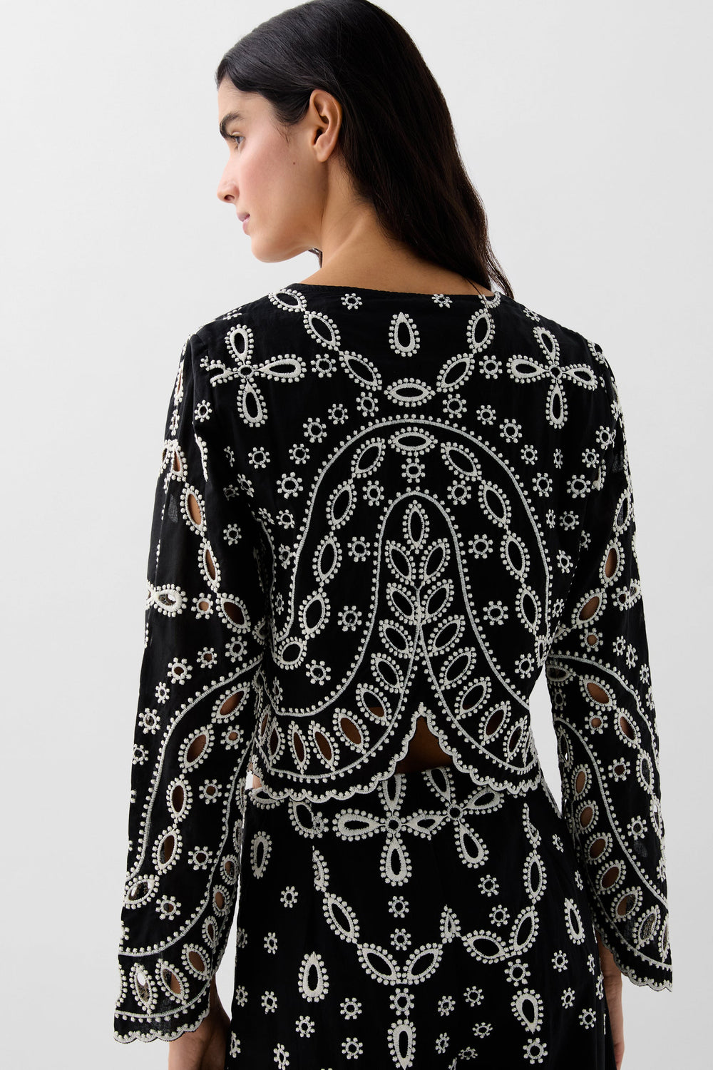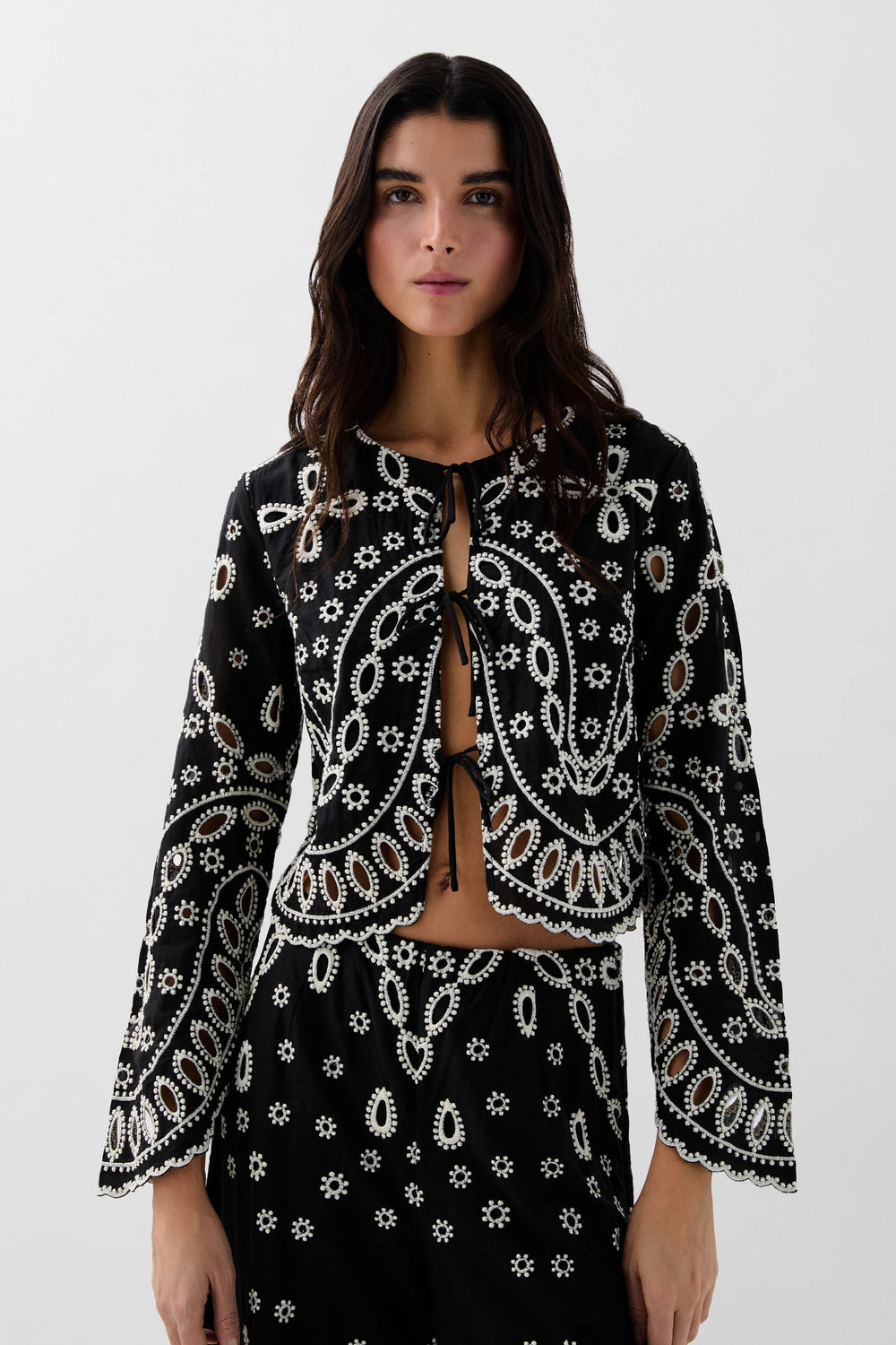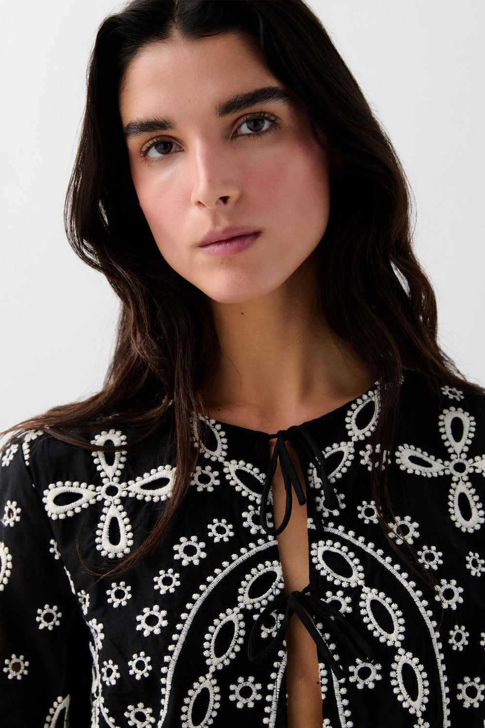 Camisa confeccionada en 100% algodón con bordados a contraste. Corte regular fit, cuello redondo y manga larga ligeramente acampanada. Cierre con lazos frontales.