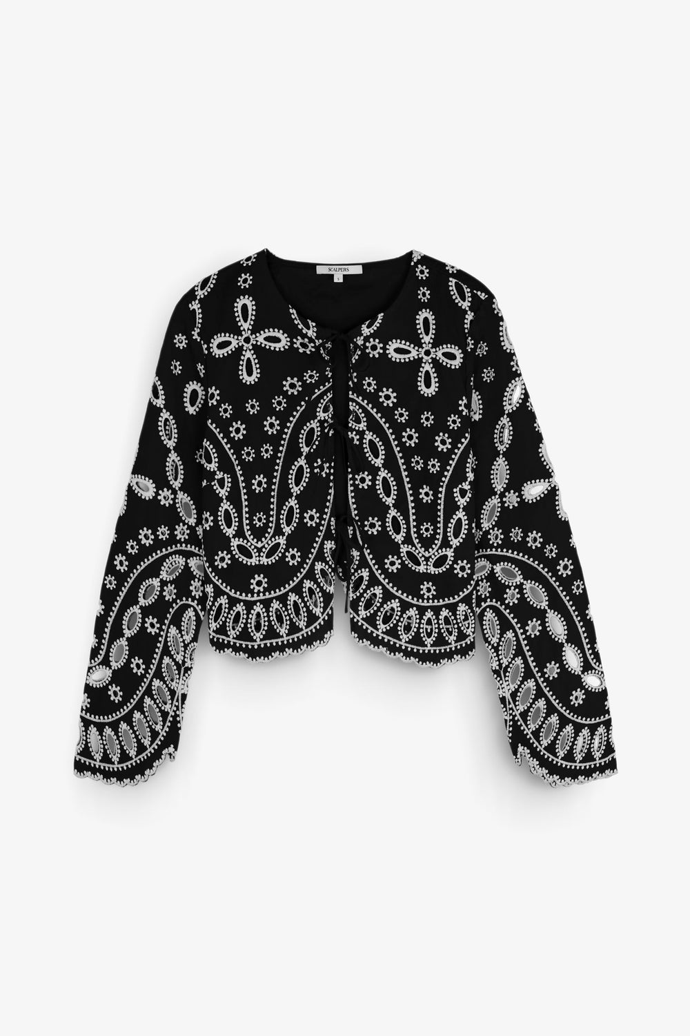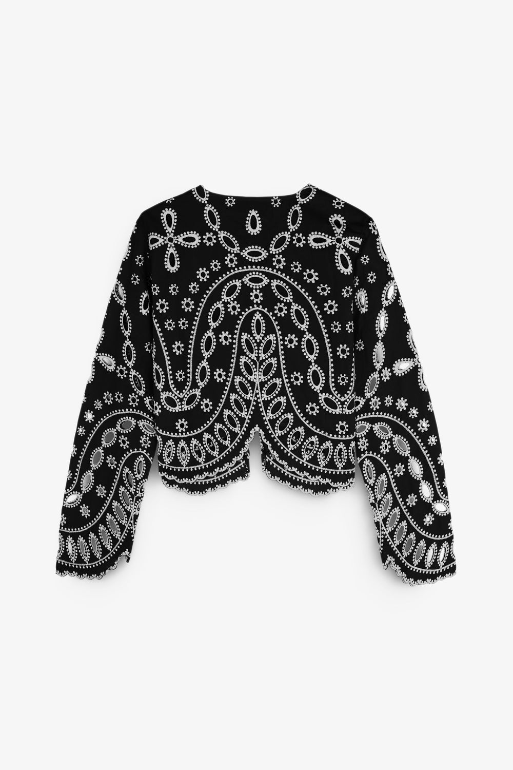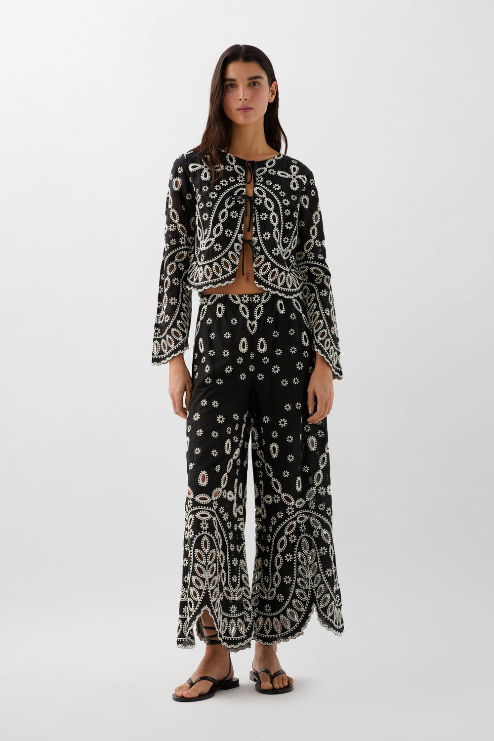 Camisa confeccionada en 100% algodón con bordados a contraste. Corte regular fit, cuello redondo y manga larga ligeramente acampanada. Cierre con lazos frontales.