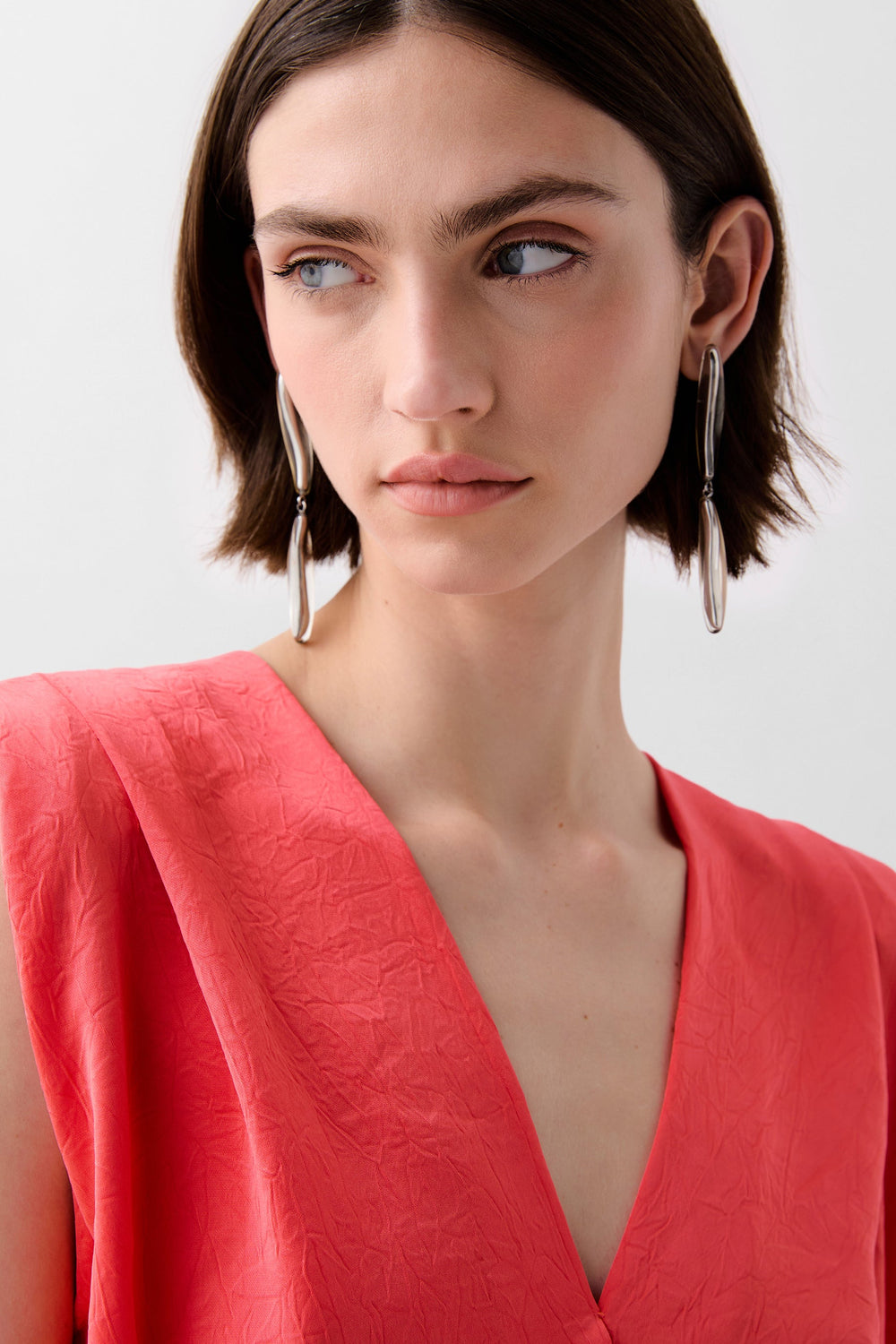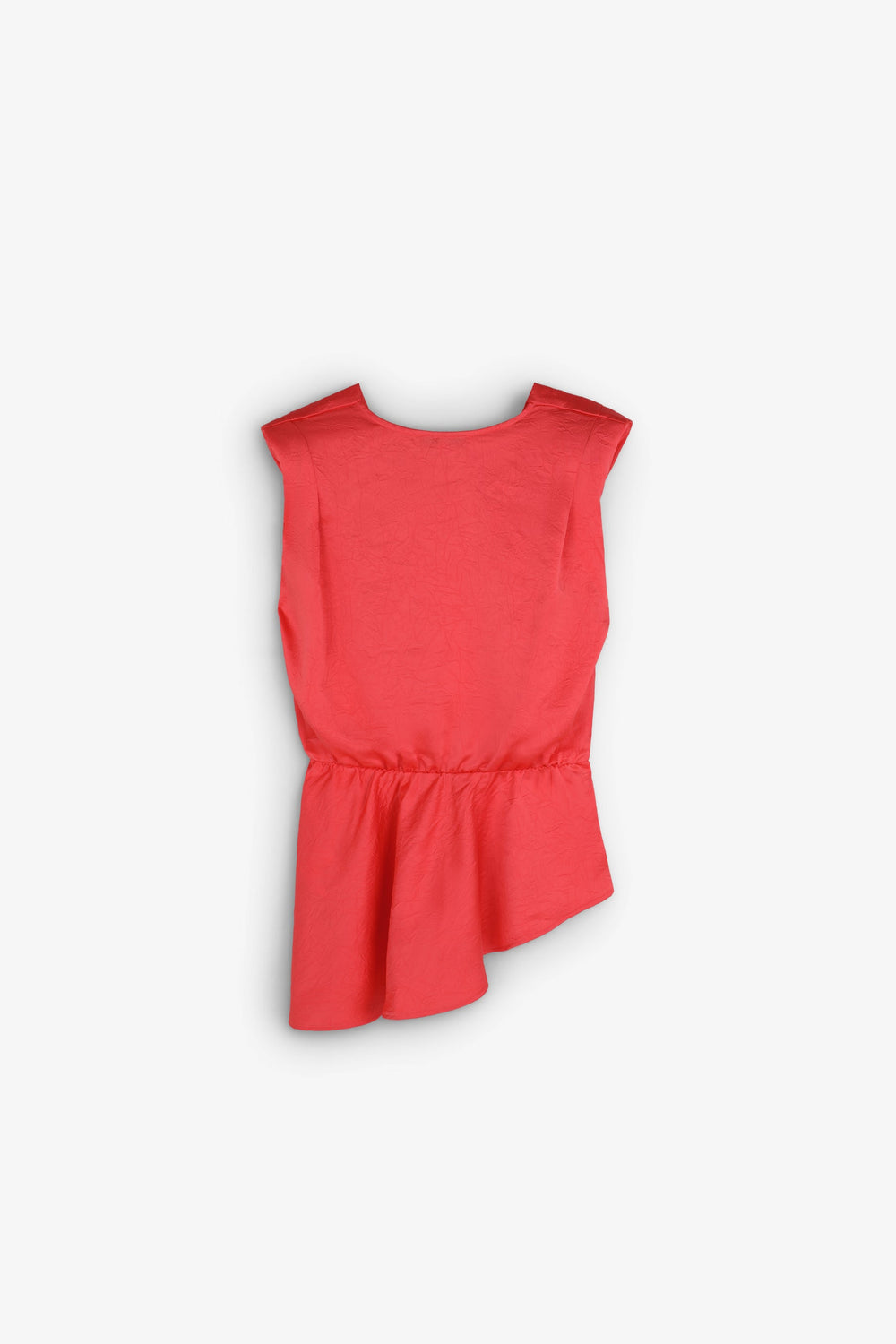 Top confeccionado en tejido fluido con textura. Corte regular fit, escote en V y manga en sisa con ligera hombrera. Plisados en pecho, cogido en cintura y con volante en el bajo.