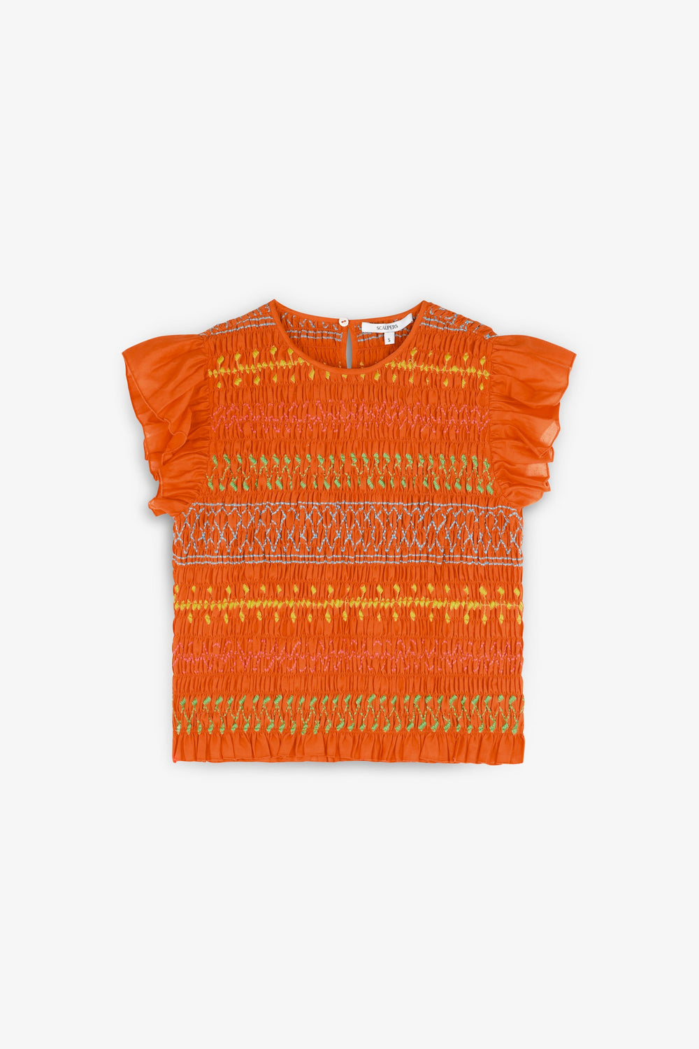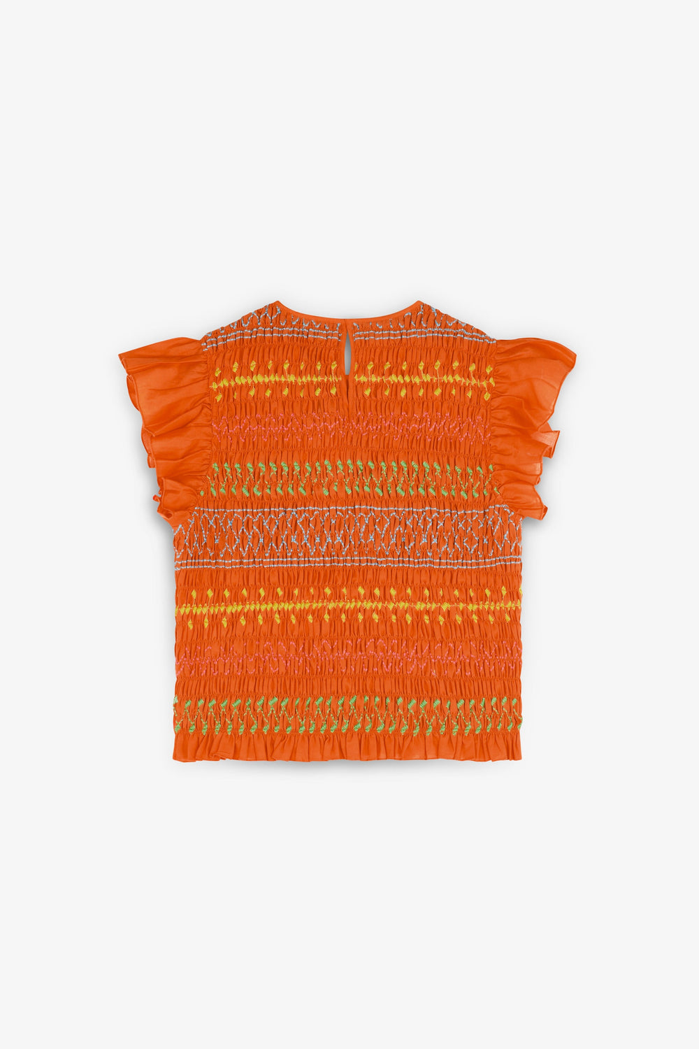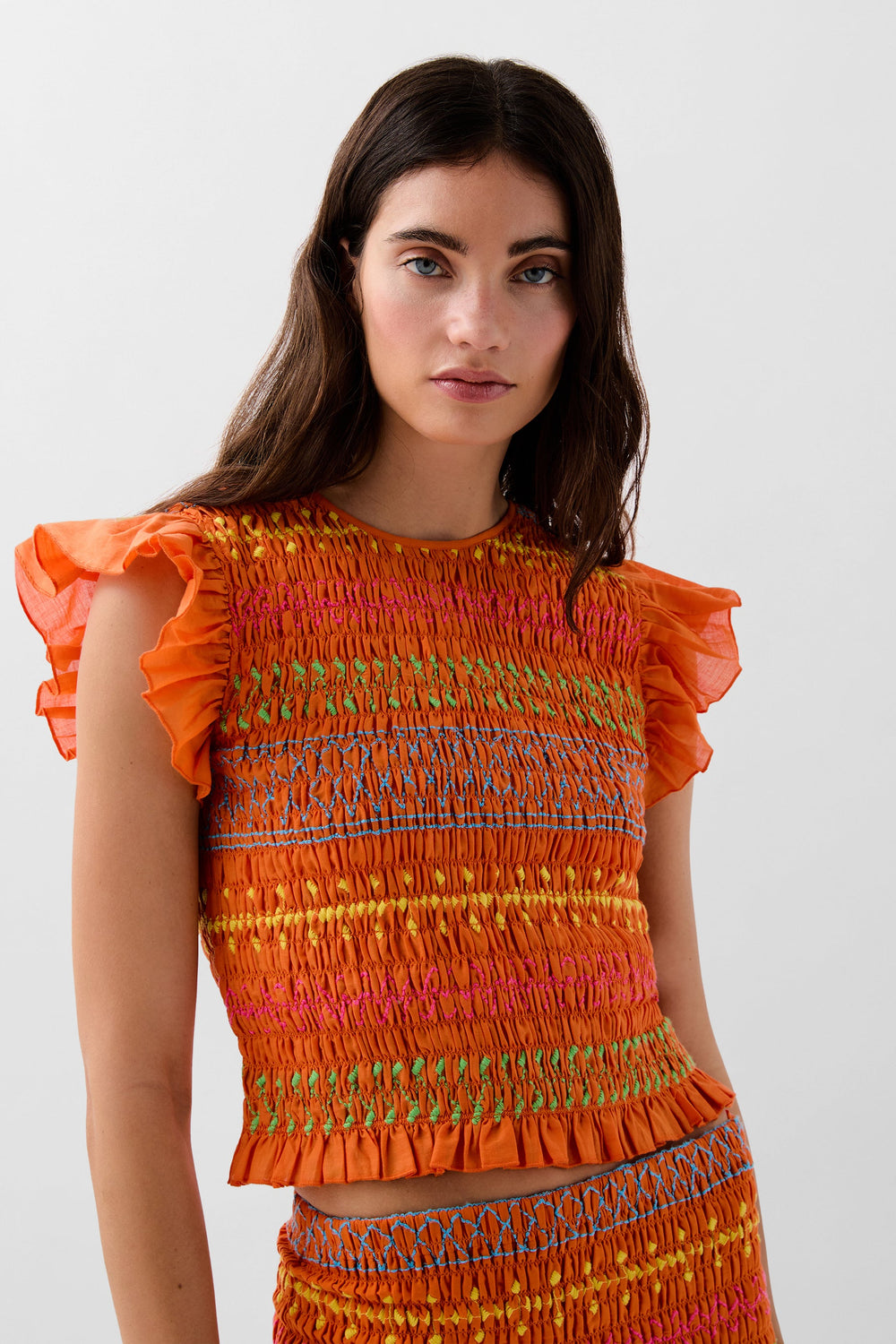 Top confeccionado en mezcla de algodón ligeramente elástico con cuerpo en nido de abeja y manga corta con ligero volante. Corte Slim fit, ligeramente cropped y cuello redondo y cierre con botón en parte trasera.