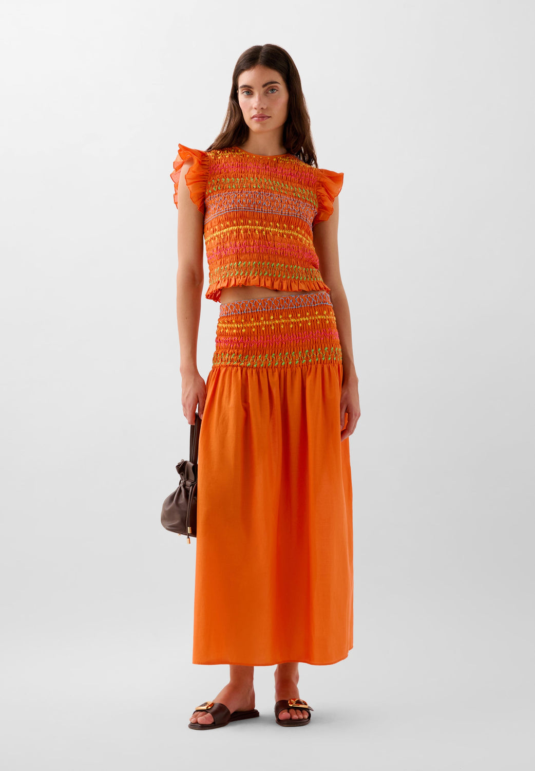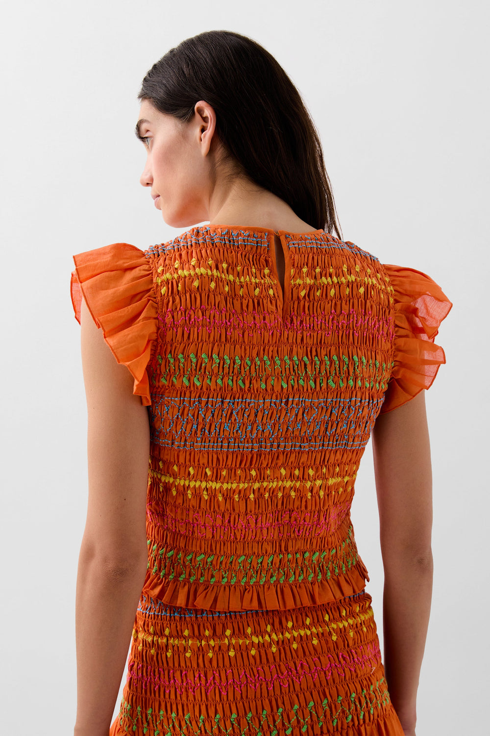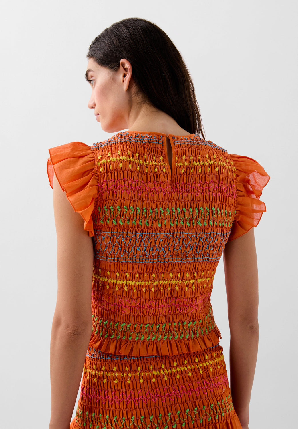 Top confeccionado en mezcla de algodón ligeramente elástico con cuerpo en nido de abeja y manga corta con ligero volante. Corte Slim fit, ligeramente cropped y cuello redondo y cierre con botón en parte trasera.