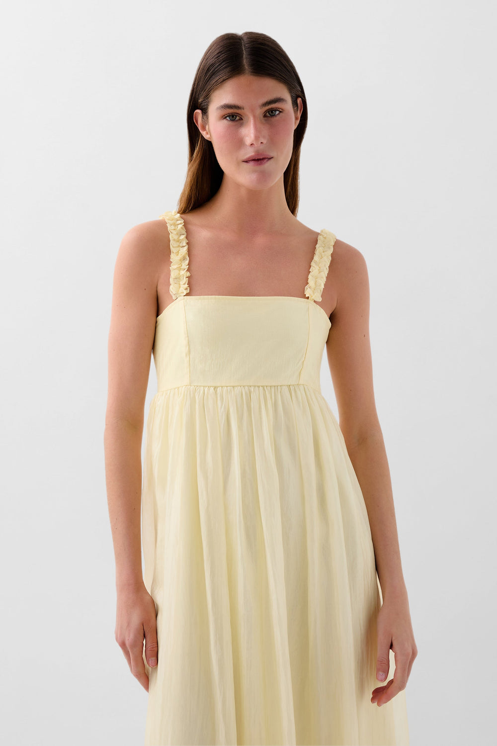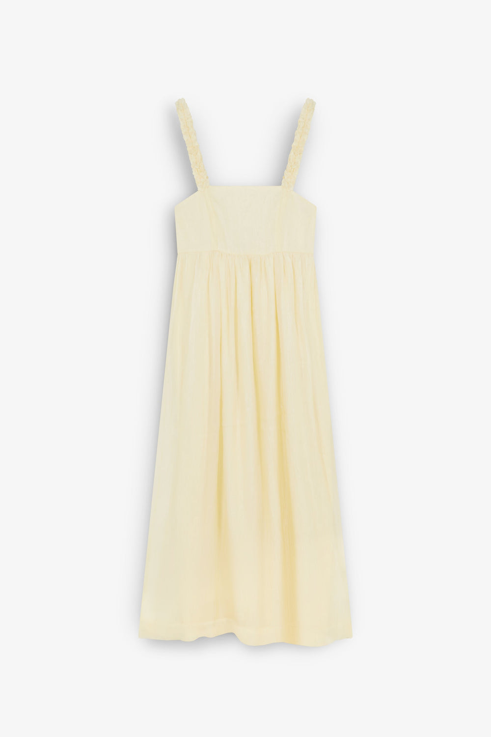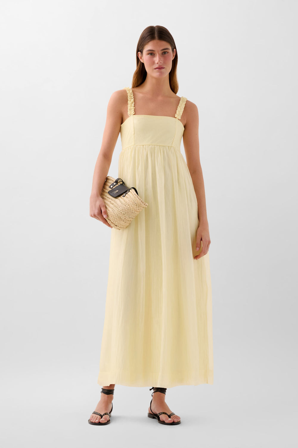 Vestido largo fluido escote en cuadrado. Tirantes anchos fruncidos. Detalle ajustado en escote. Forro interior.