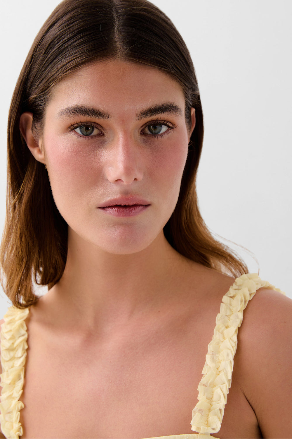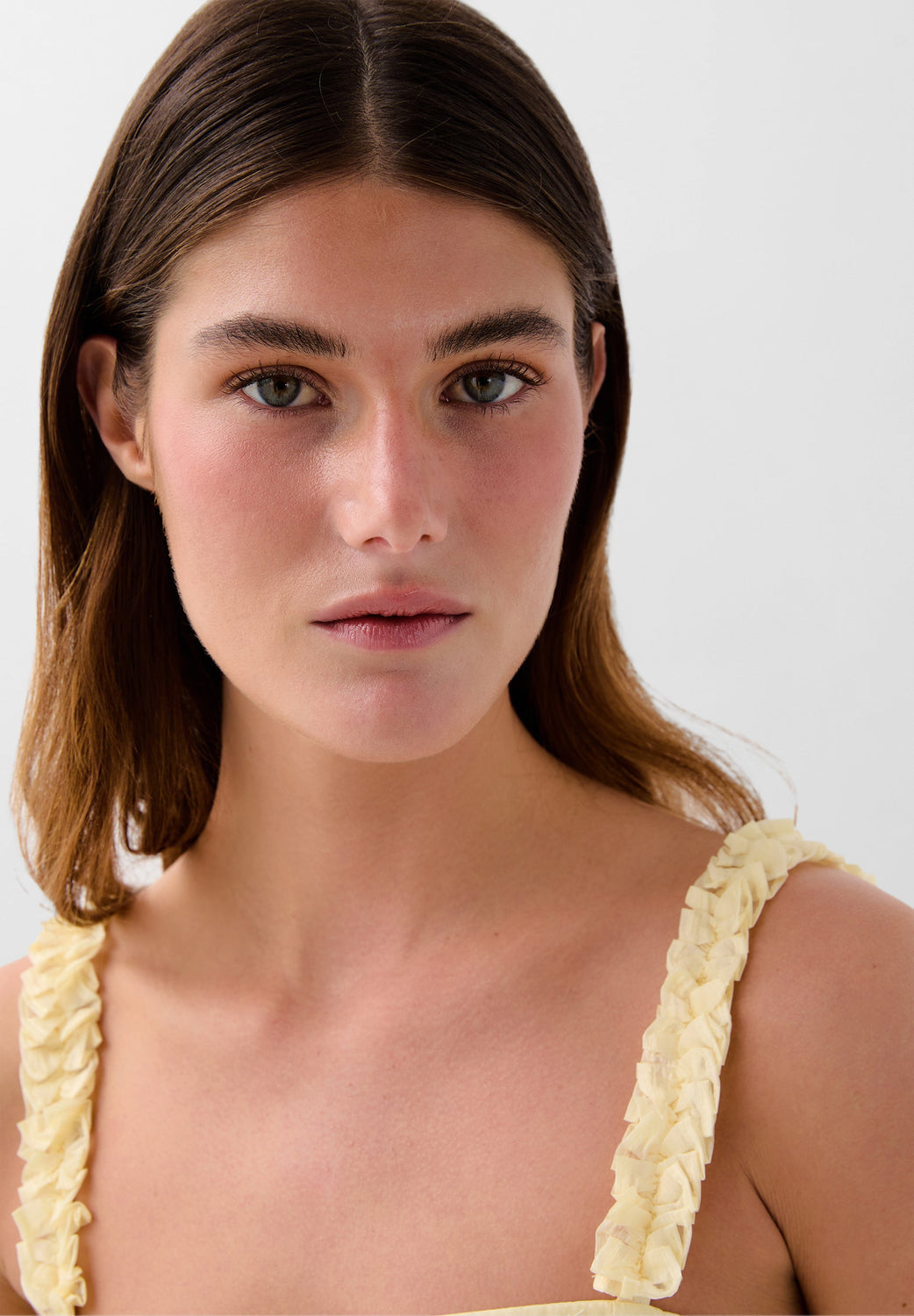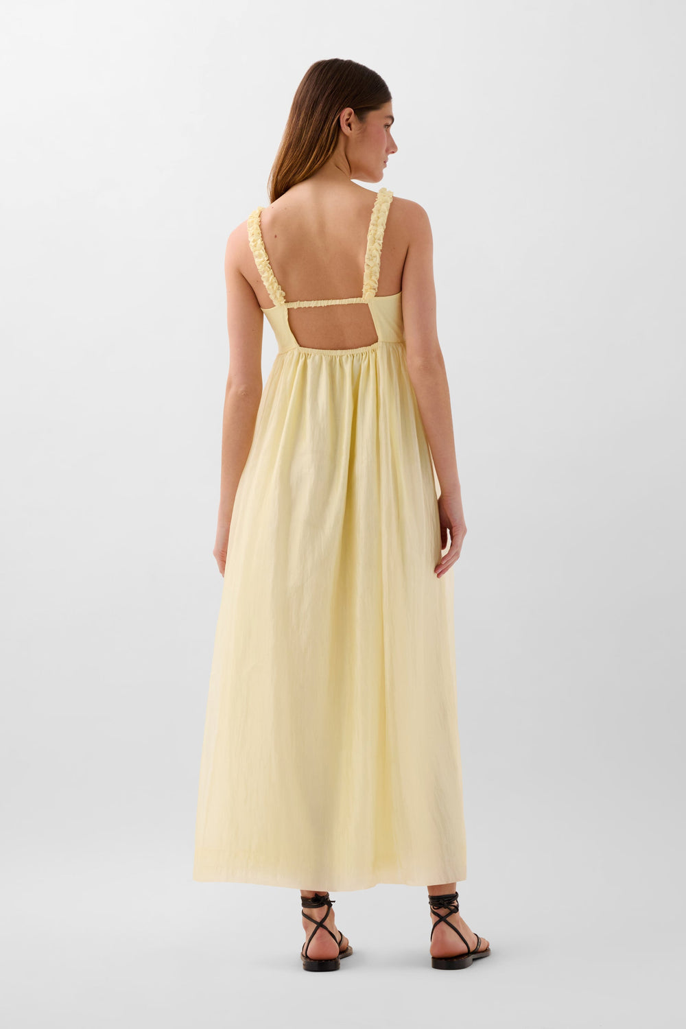 Vestido largo fluido escote en cuadrado. Tirantes anchos fruncidos. Detalle ajustado en escote. Forro interior.