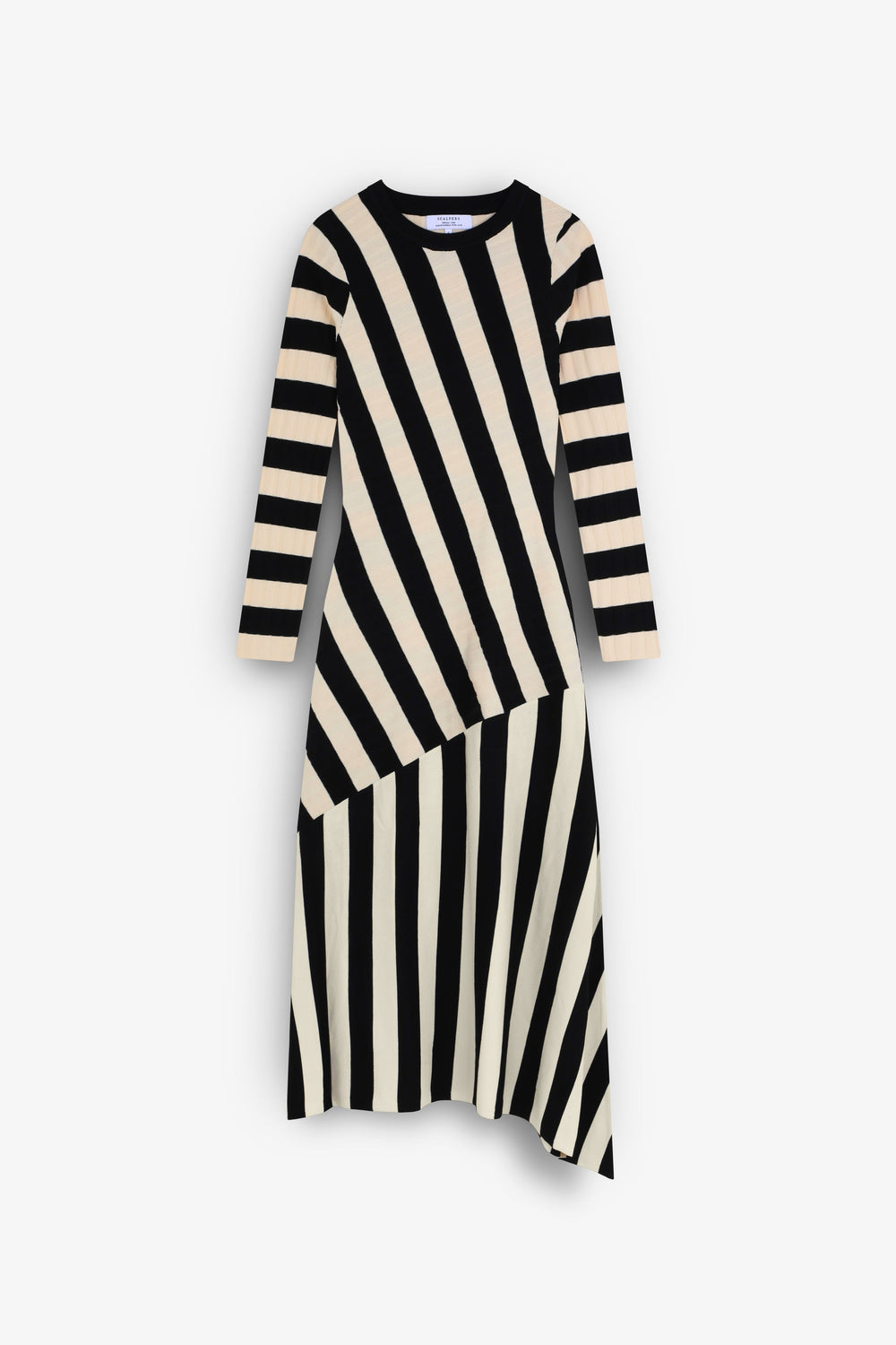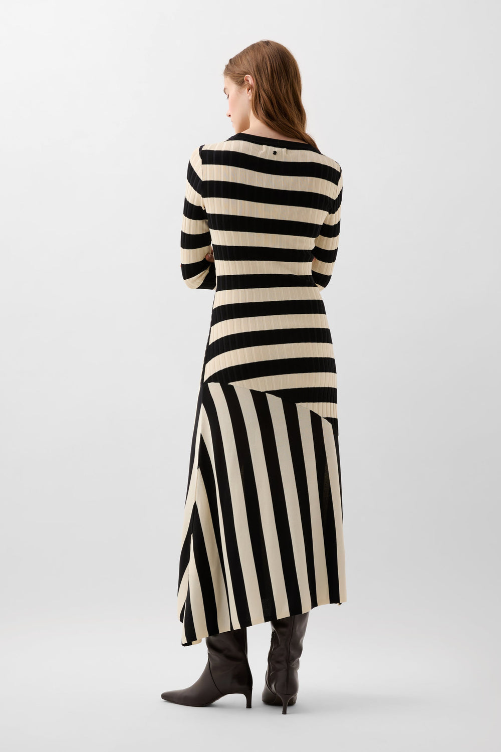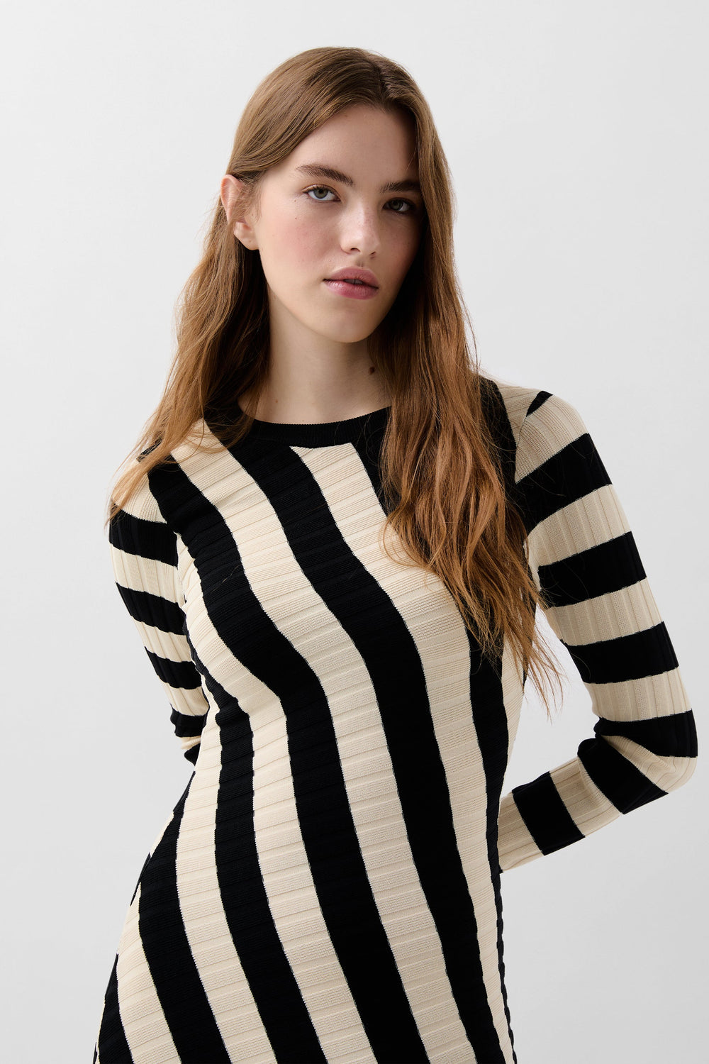 Vestido de rayas de punto. Slim Fit, cuello redondo y manga larga. Detalle de canalé en la parte superior y corte en la falda. Bajo asimétrico.