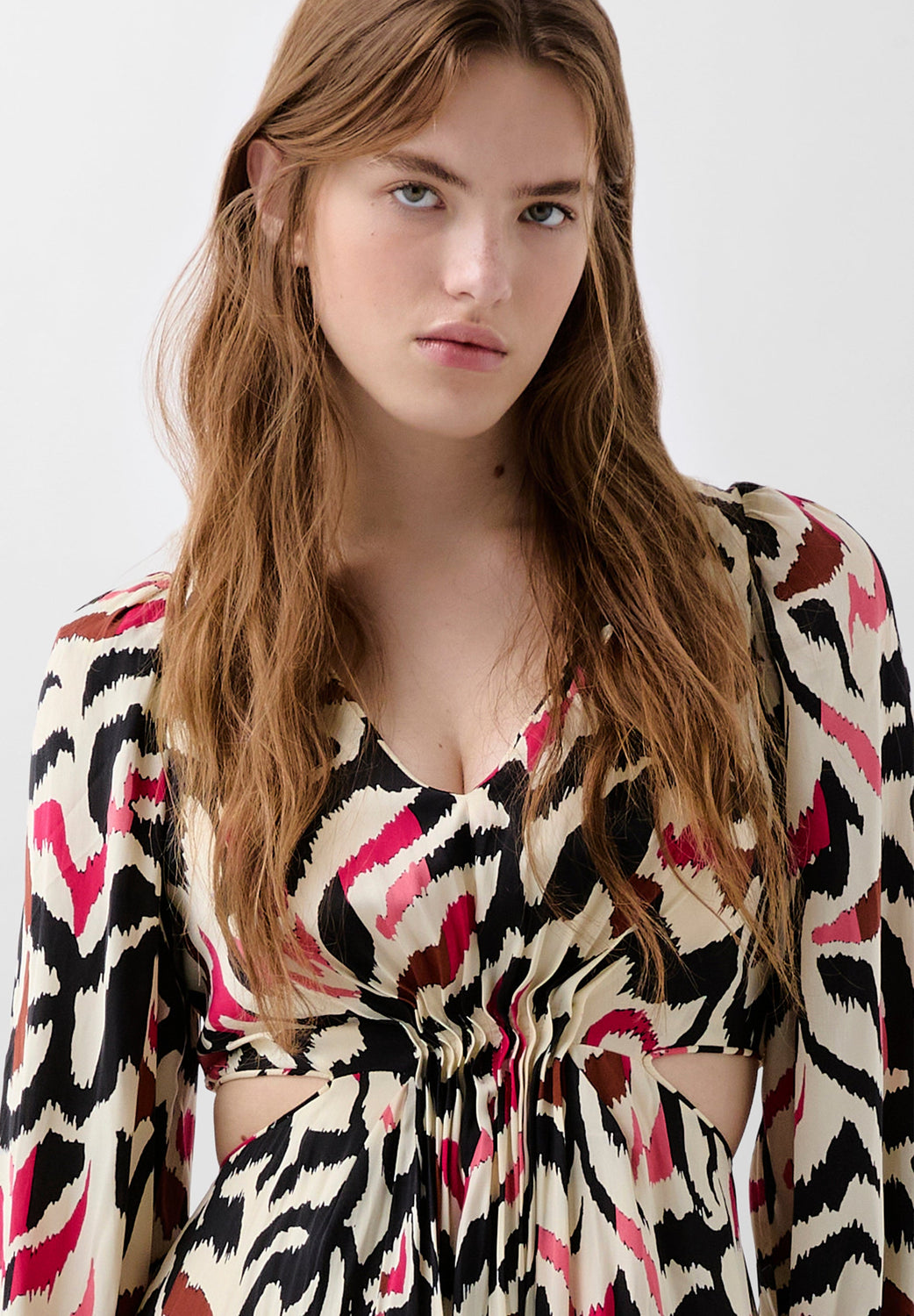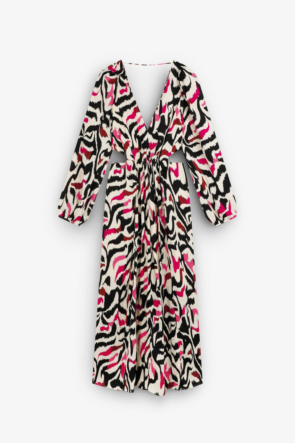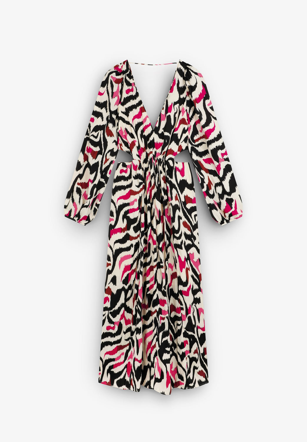 Vestido confeccionado en tejido fluido con estampado. Escote en V, aberturas laterales y trasera. Frunce en pecho y manga larga. Corte midi.