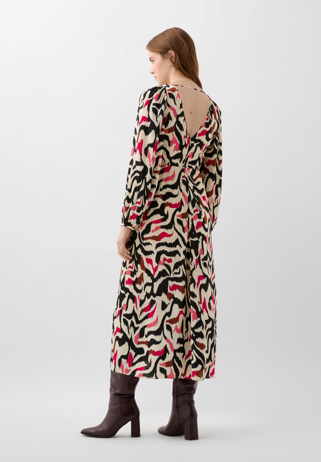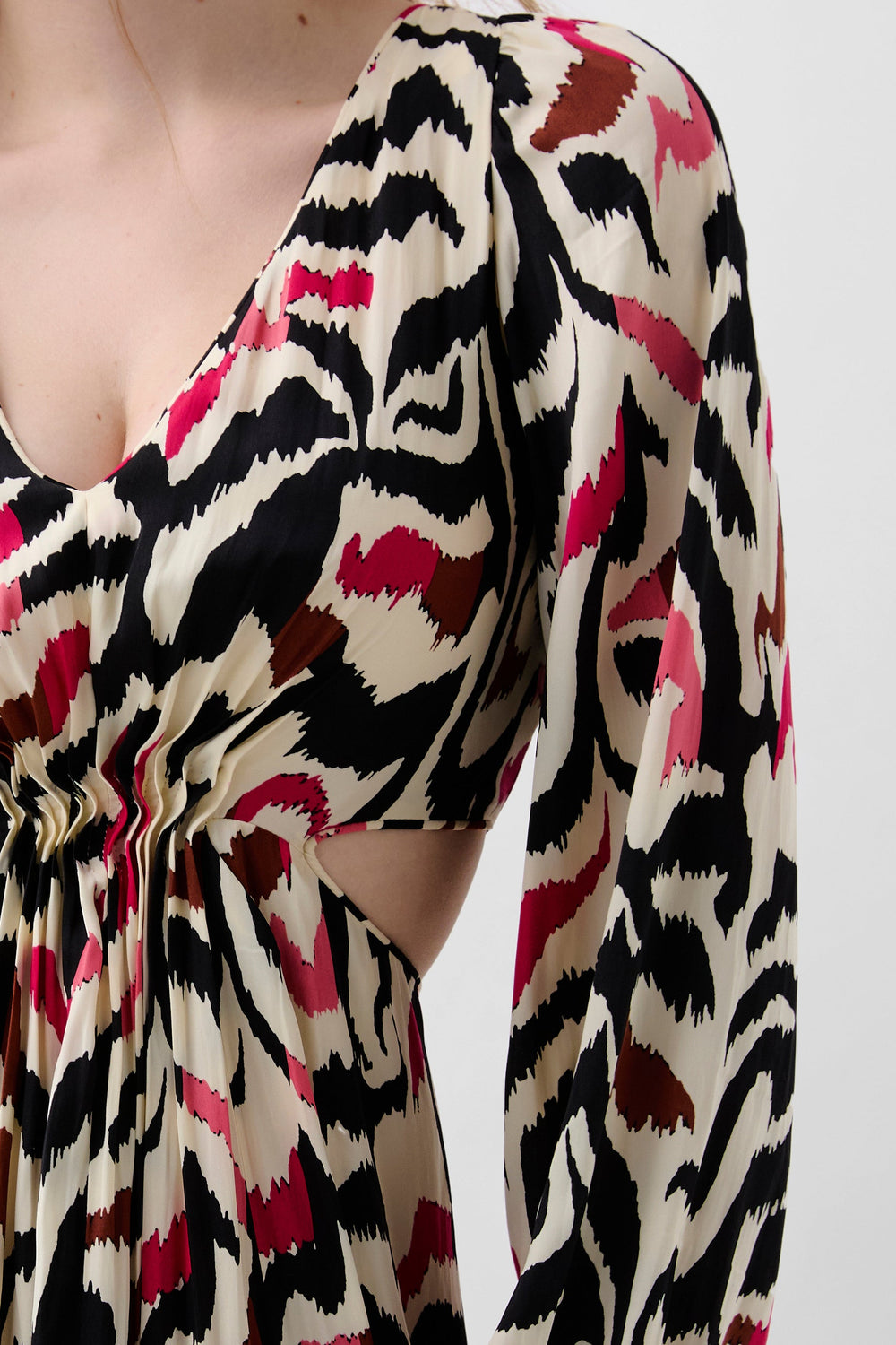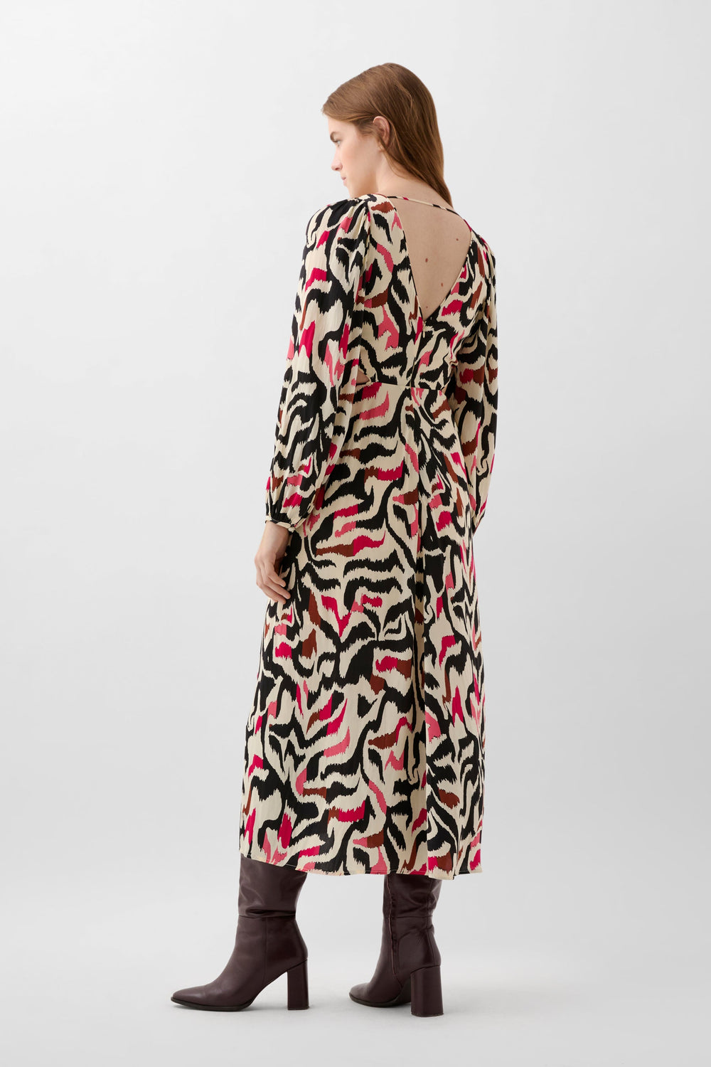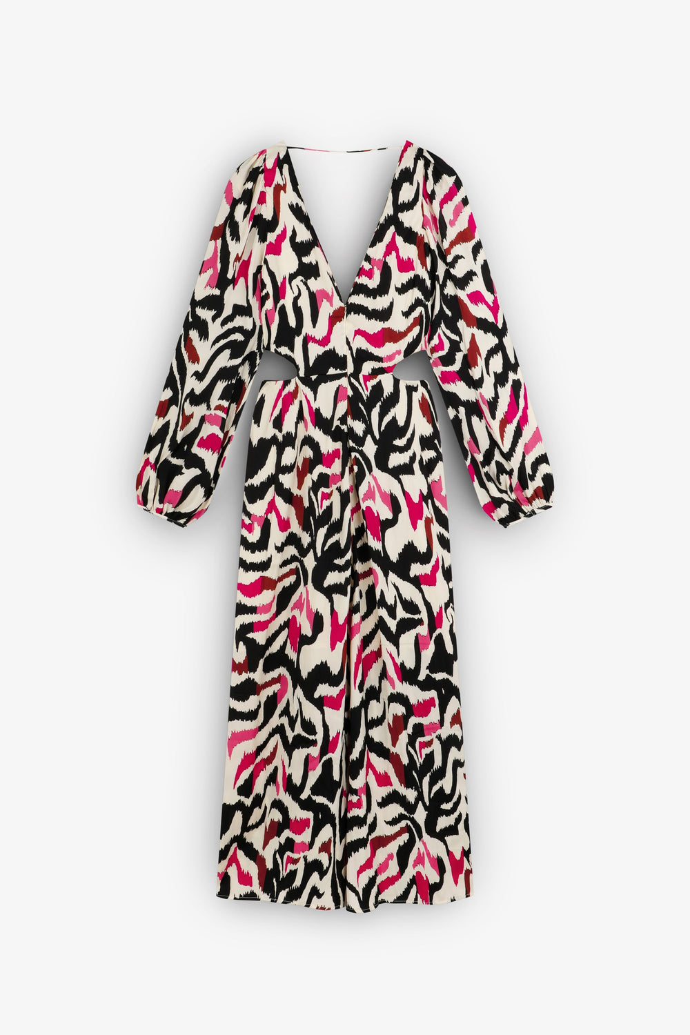 Vestido confeccionado en tejido fluido con estampado. Escote en V, aberturas laterales y trasera. Frunce en pecho y manga larga. Corte midi.
