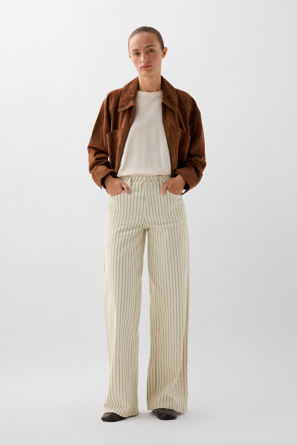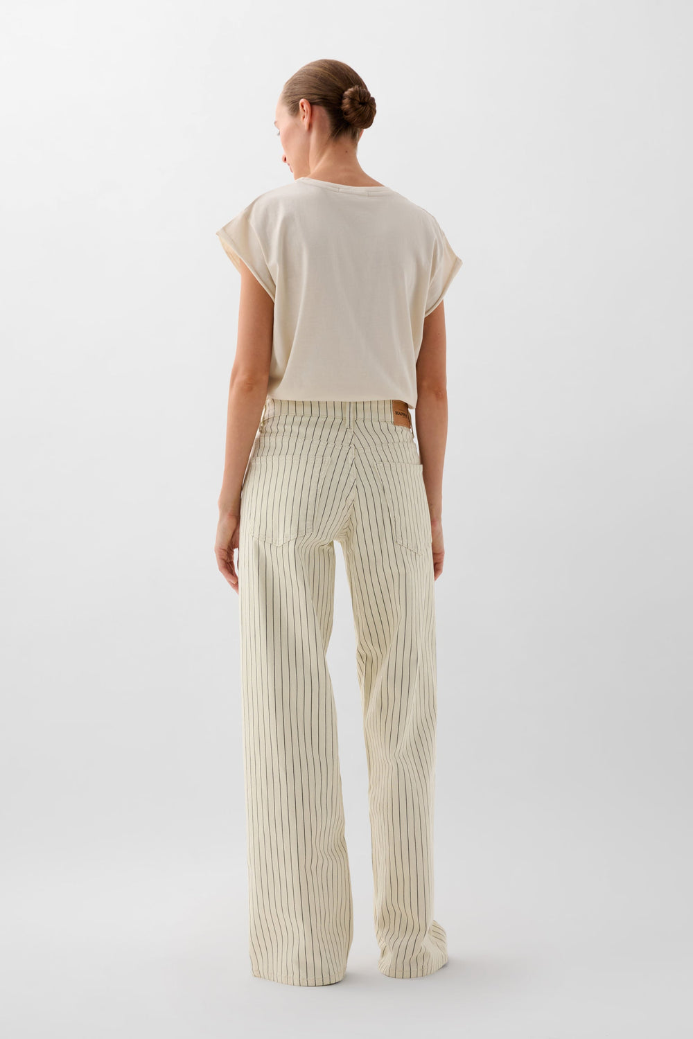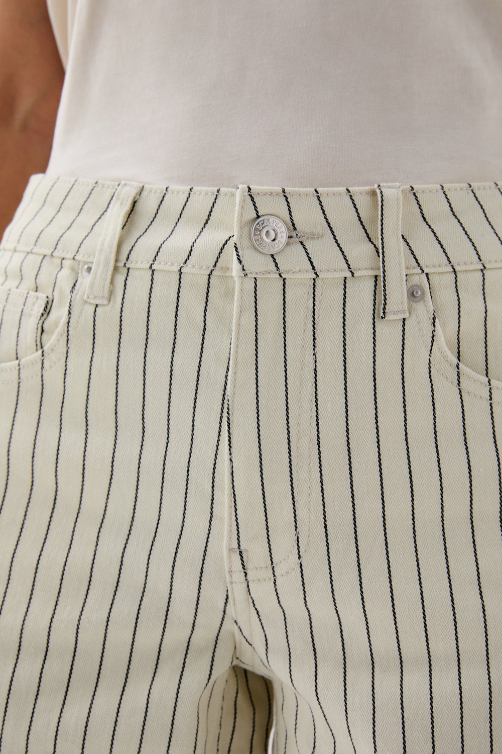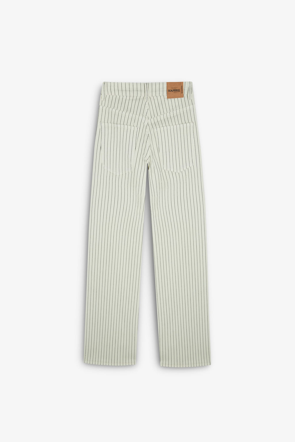 Pantalón vaquero de tiro alto confeccionado en 98% Algodón Orgánico BCI. Cierre por botón y cremallera. Dos bolsillos en frontal. Dos bolsillos en espalda. Estampado rayas. Regular Fit.