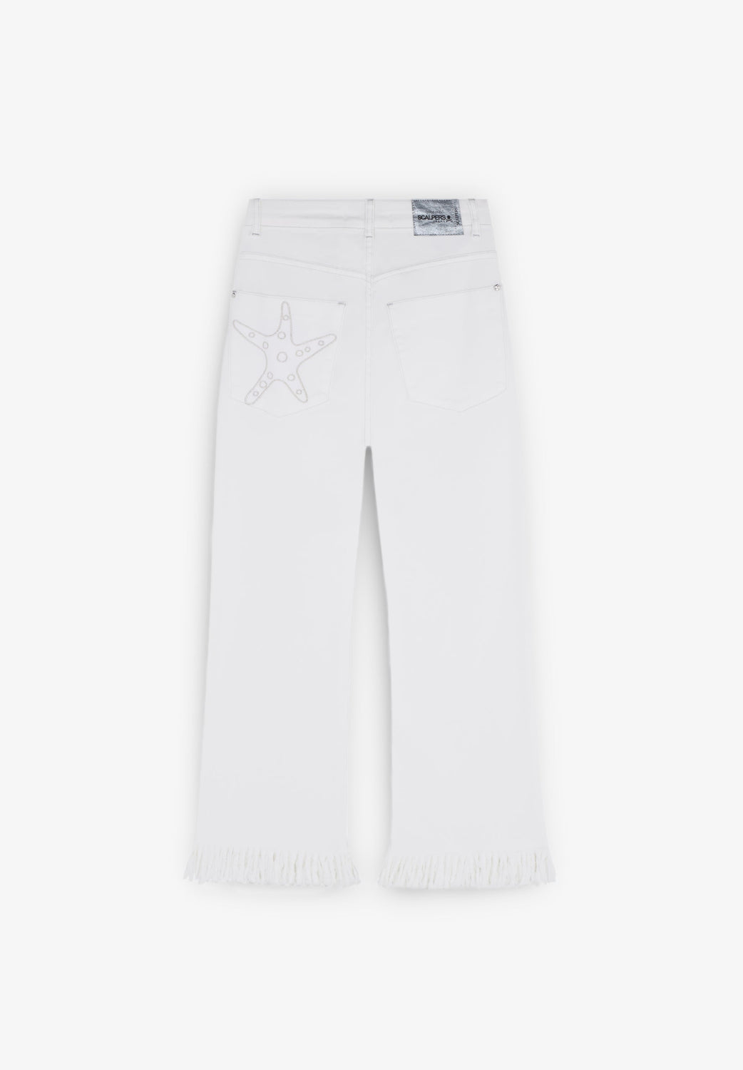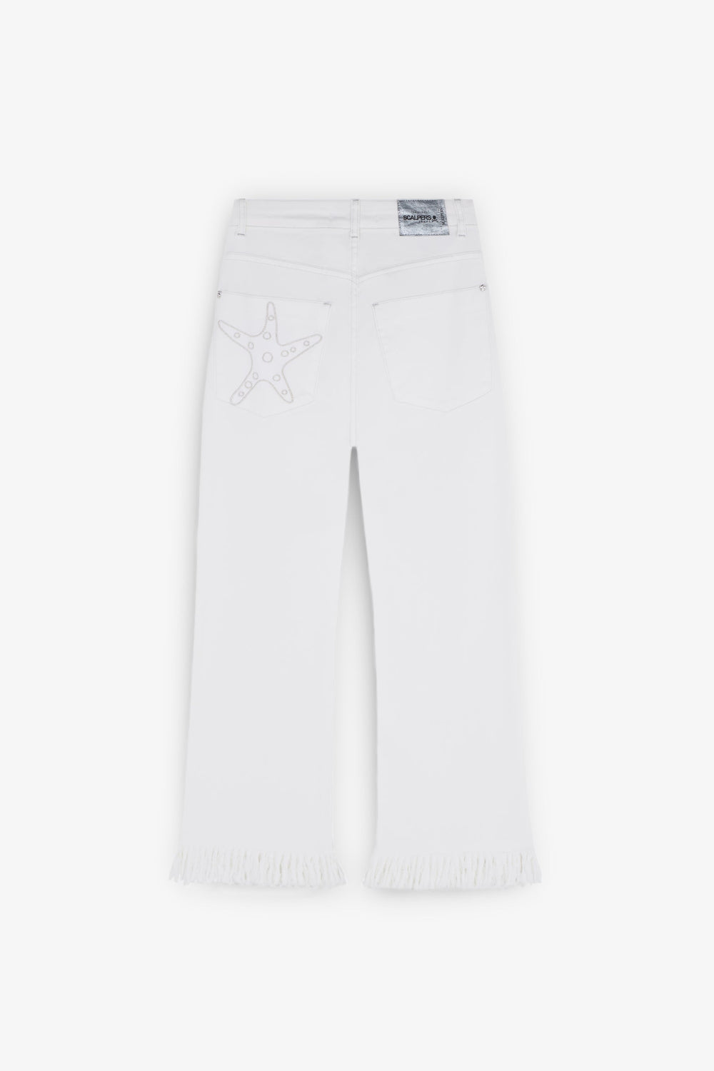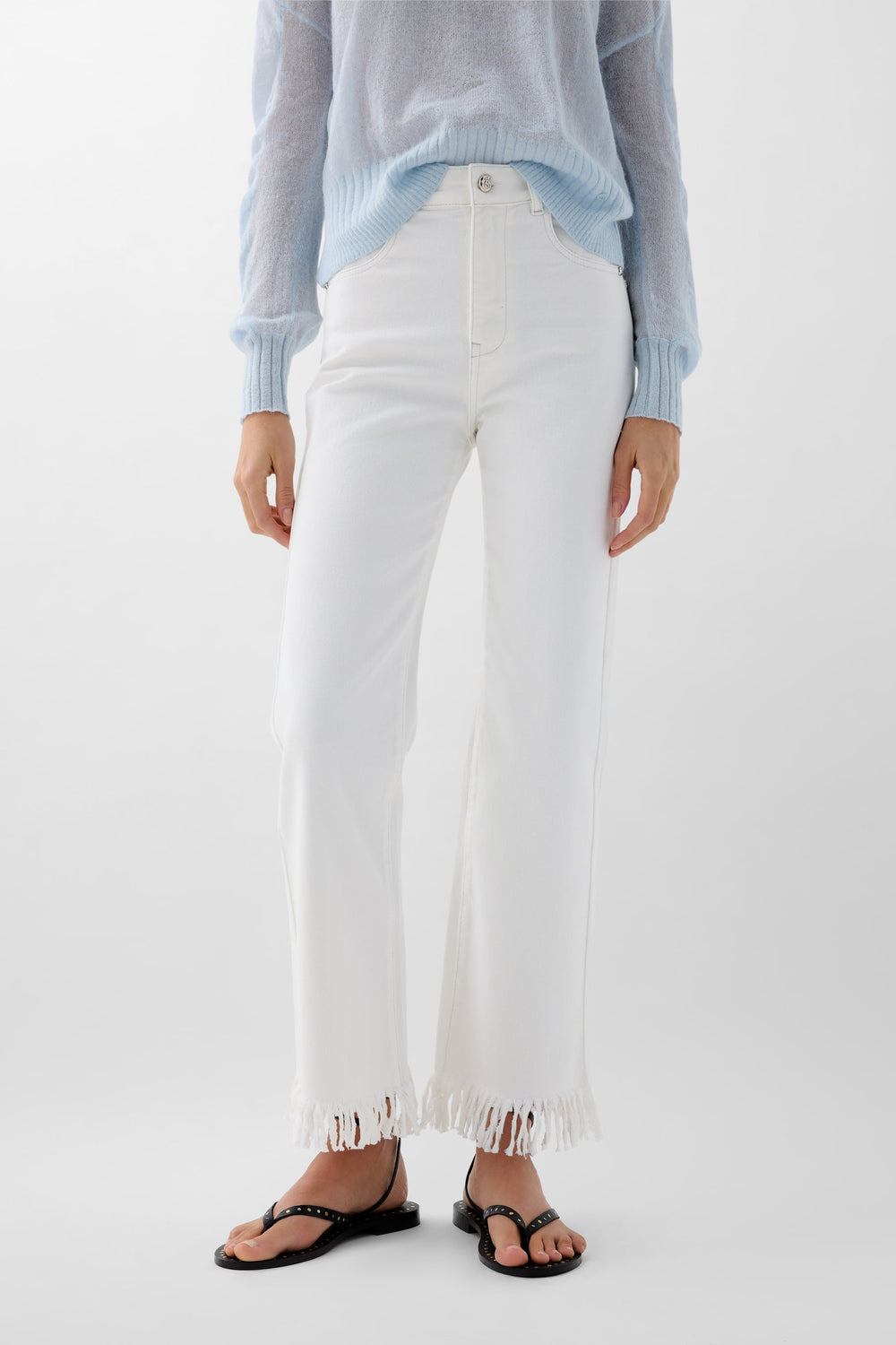 Pantalón vaquero confeccionado en 100% Algodón Orgánico BCI. Dos bolsillos en frontal. Dos bolsillos posteriores con detalle bordado. Motivo desflecado en bajos. Cierre mediante botón y cremallera.