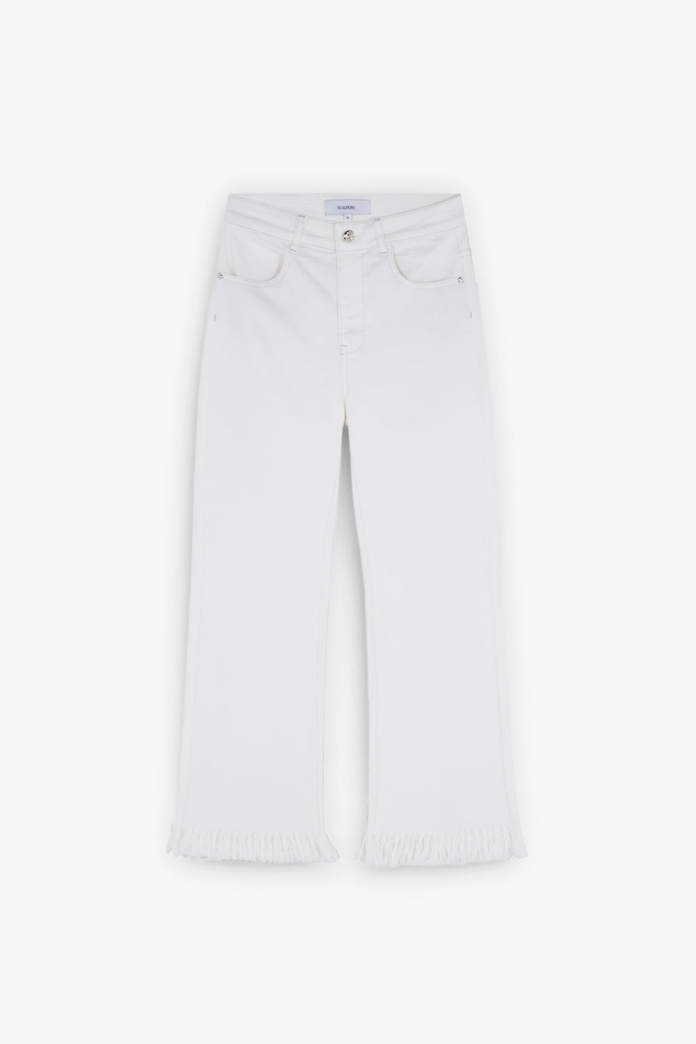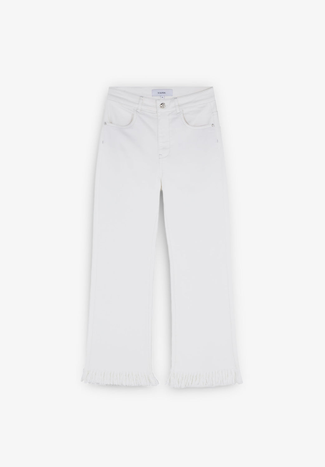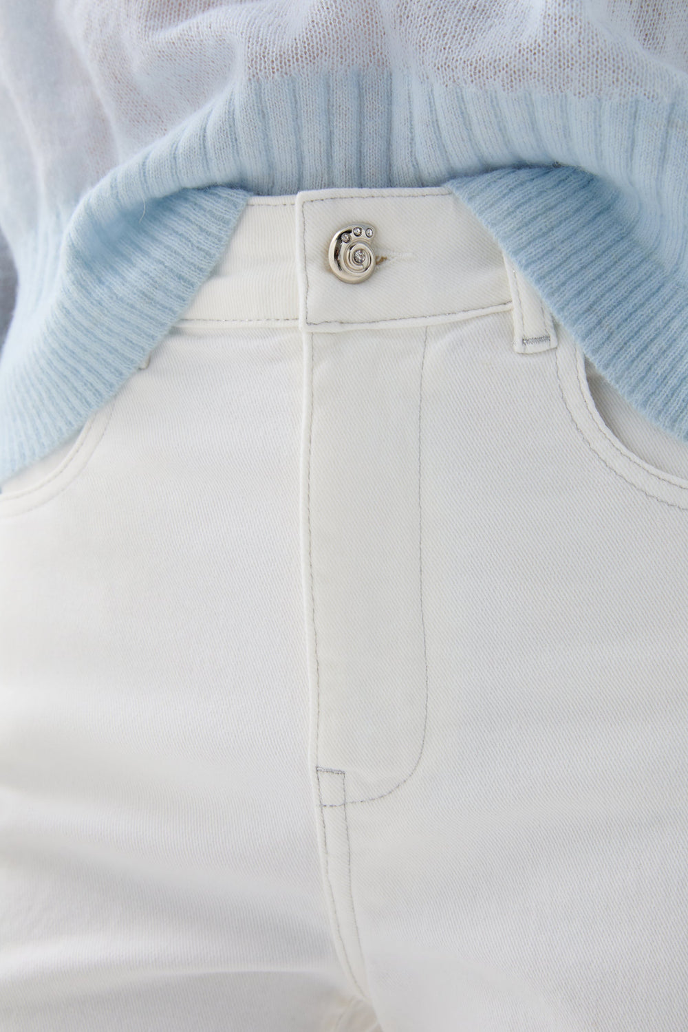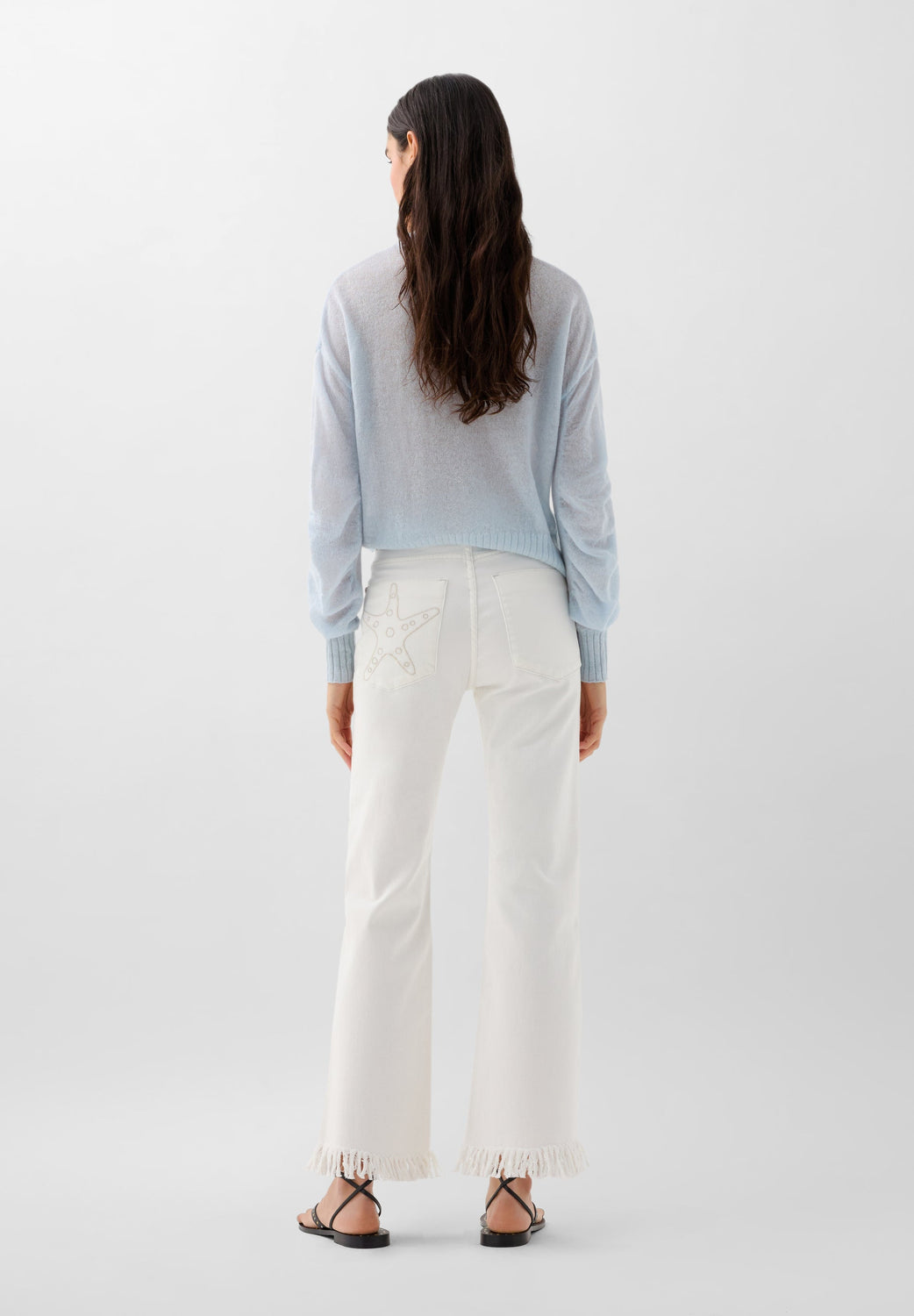 Pantalón vaquero confeccionado en 100% Algodón Orgánico BCI. Dos bolsillos en frontal. Dos bolsillos posteriores con detalle bordado. Motivo desflecado en bajos. Cierre mediante botón y cremallera.