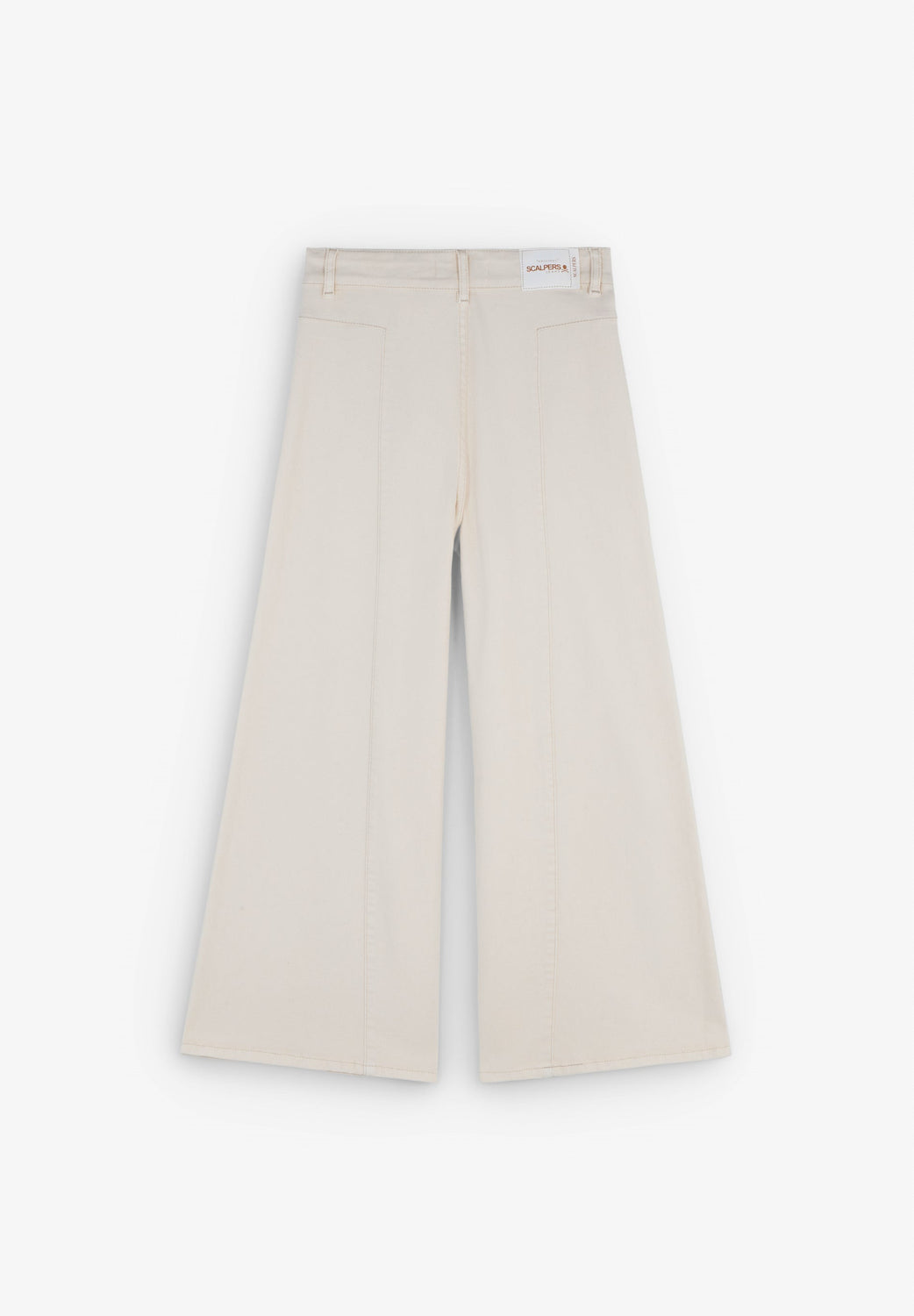 Jeans confeccionados en algodón ligeramente elástico. Corte culotte con tiro alto, cierre con botón y cremallera y trabillas en cintura. Detalle de costuras marcadas.