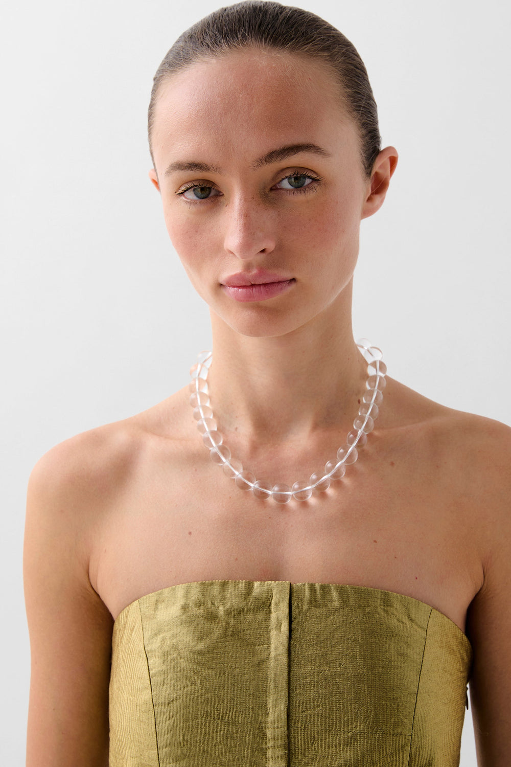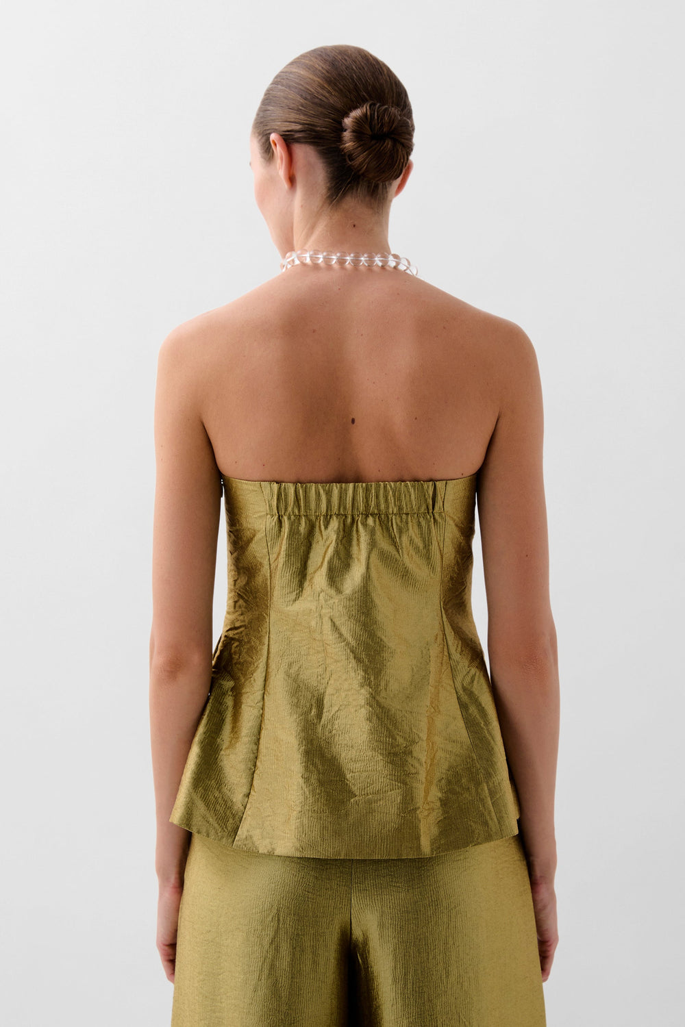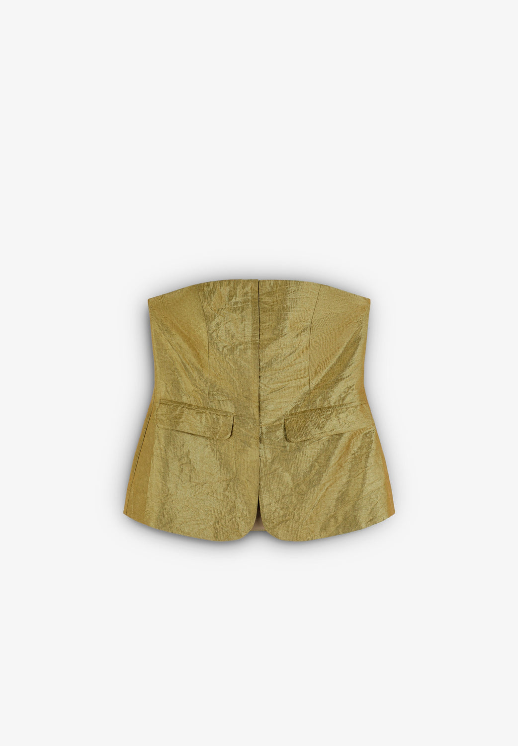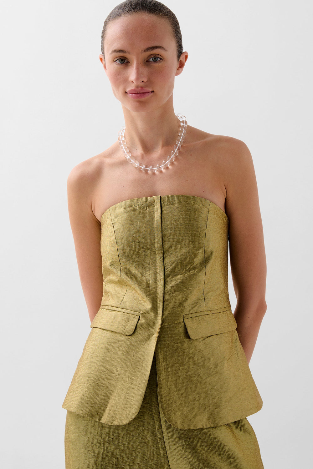 Top confeccionado en tejido metalizado. Escote palabra de honor con banda ajustable trasera. Pinzas frontales, ligeramente peplum y bolsillos con tapeta.