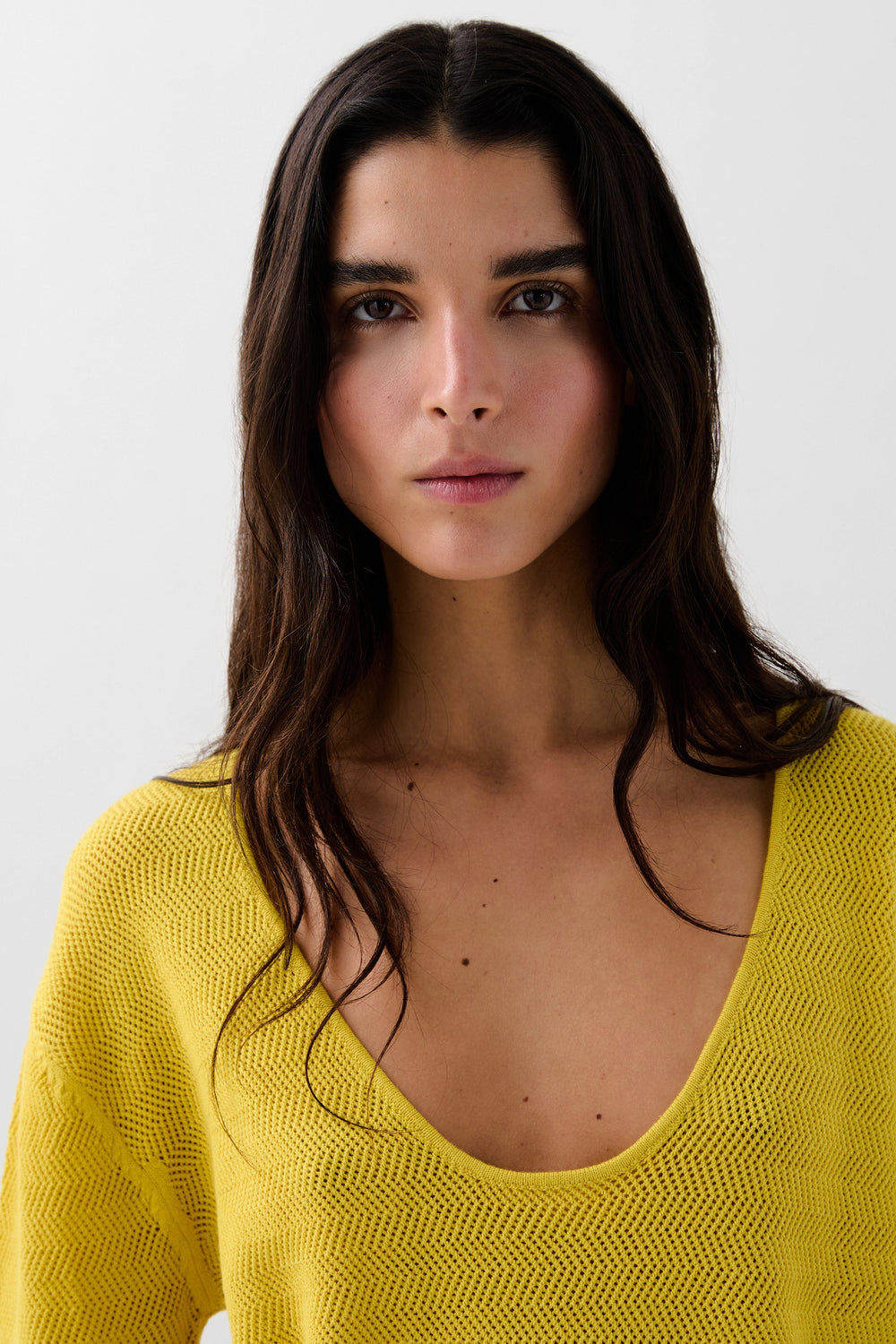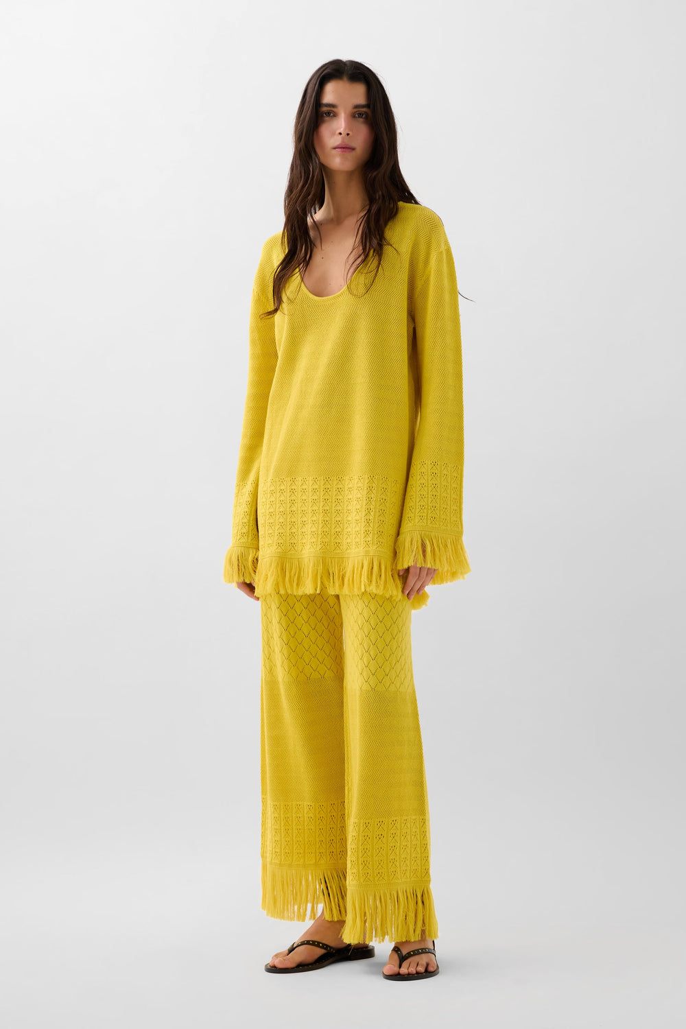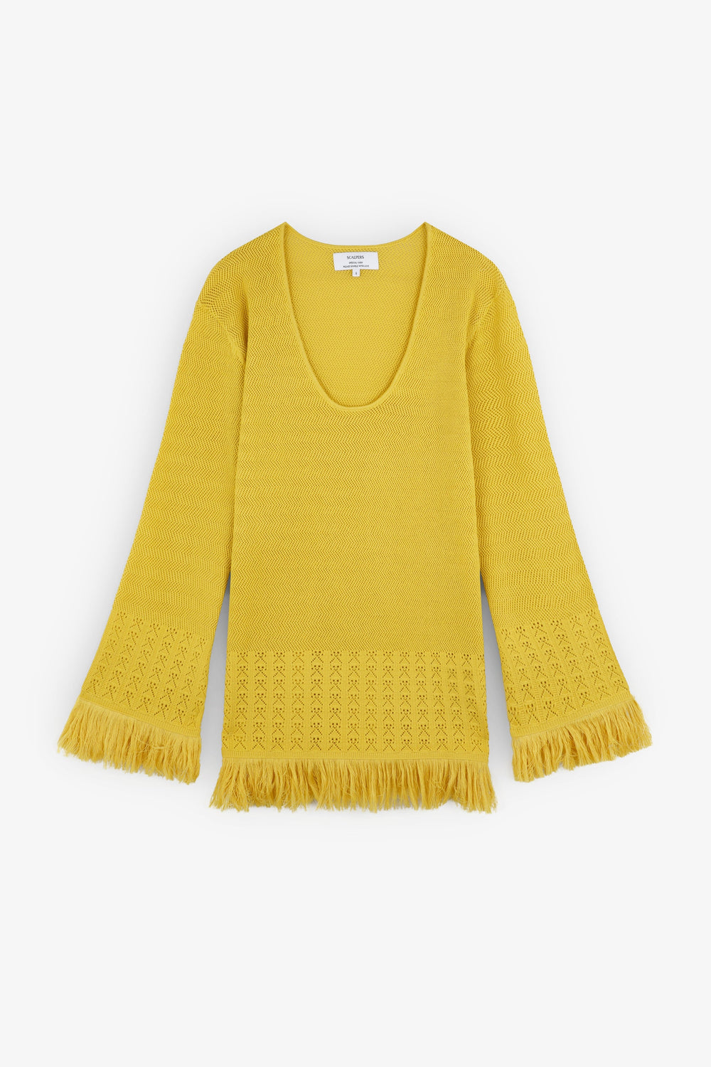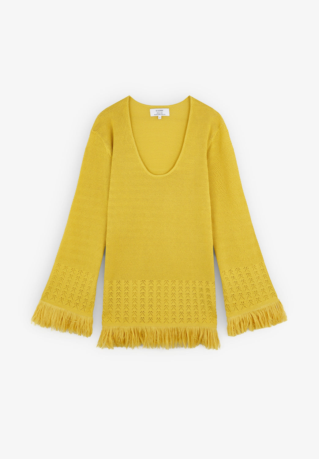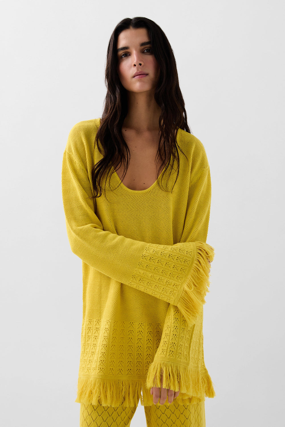 Jersey confeccionado en punto ligeramente elástico. Corte regular fit, cuello redondo y manga larga con puños y bajo acabado en flecos.