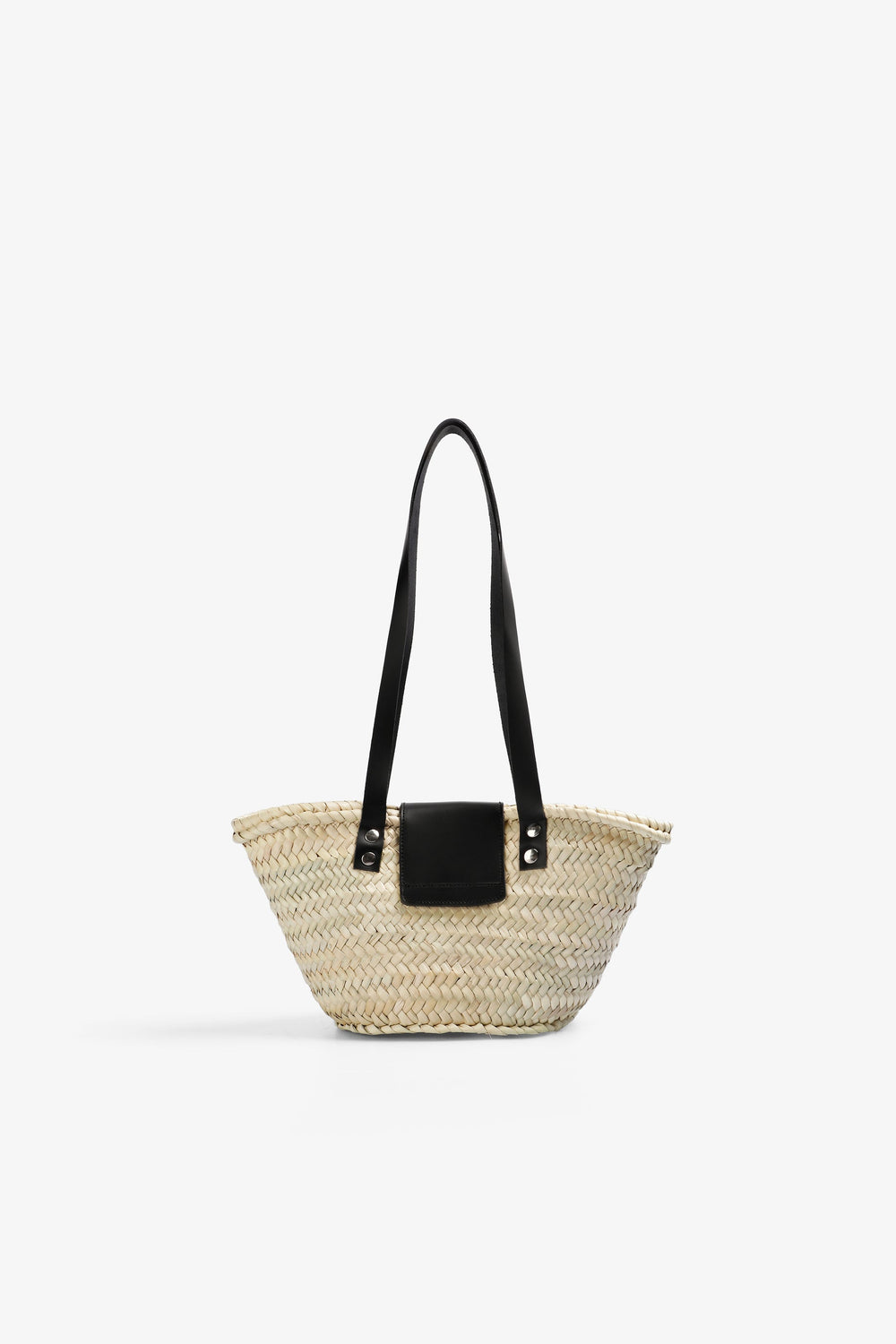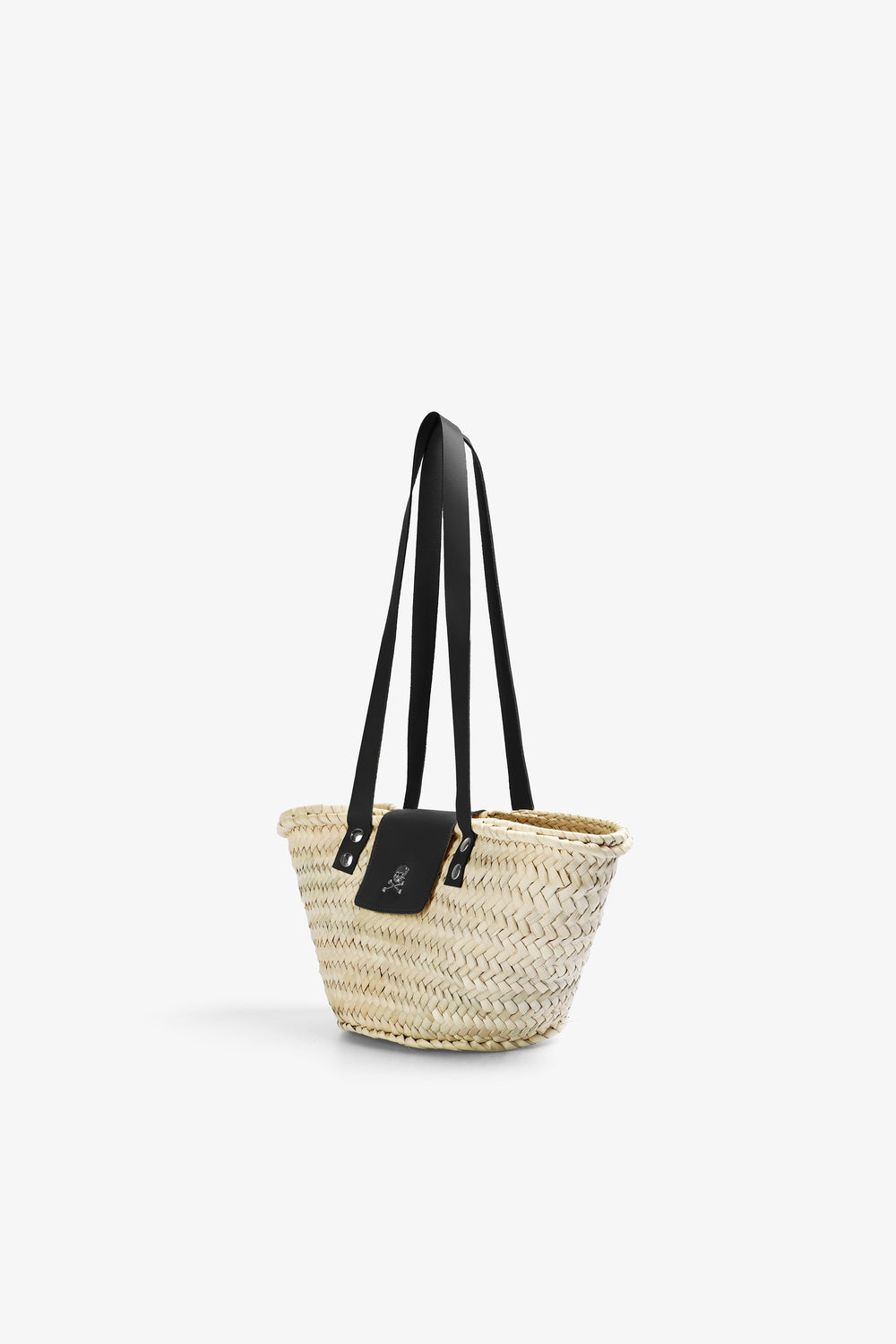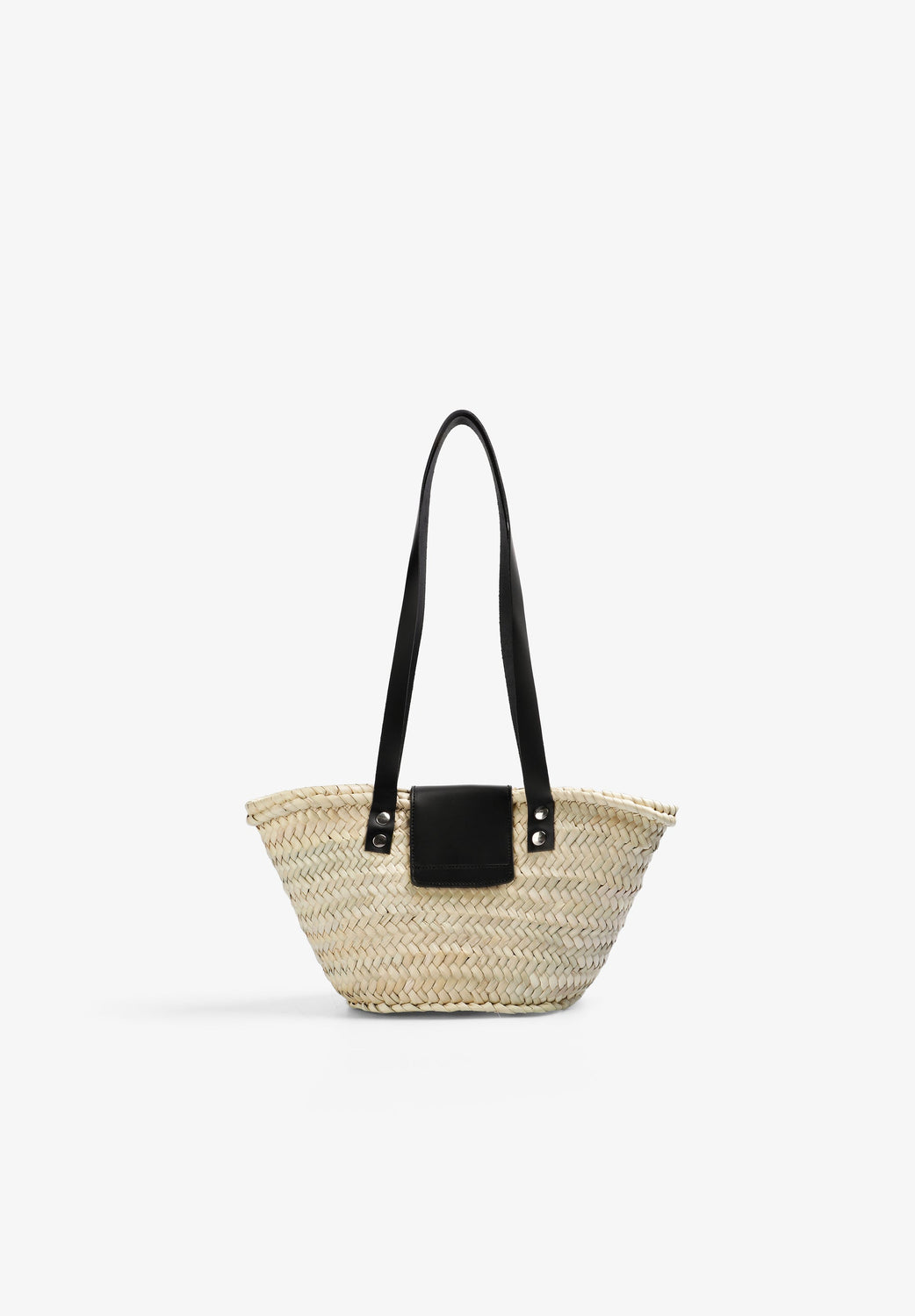Bolso tipo capazo con logo. Confeccionado en 100% hoja de palma. Asas largas. Cierre con snap.