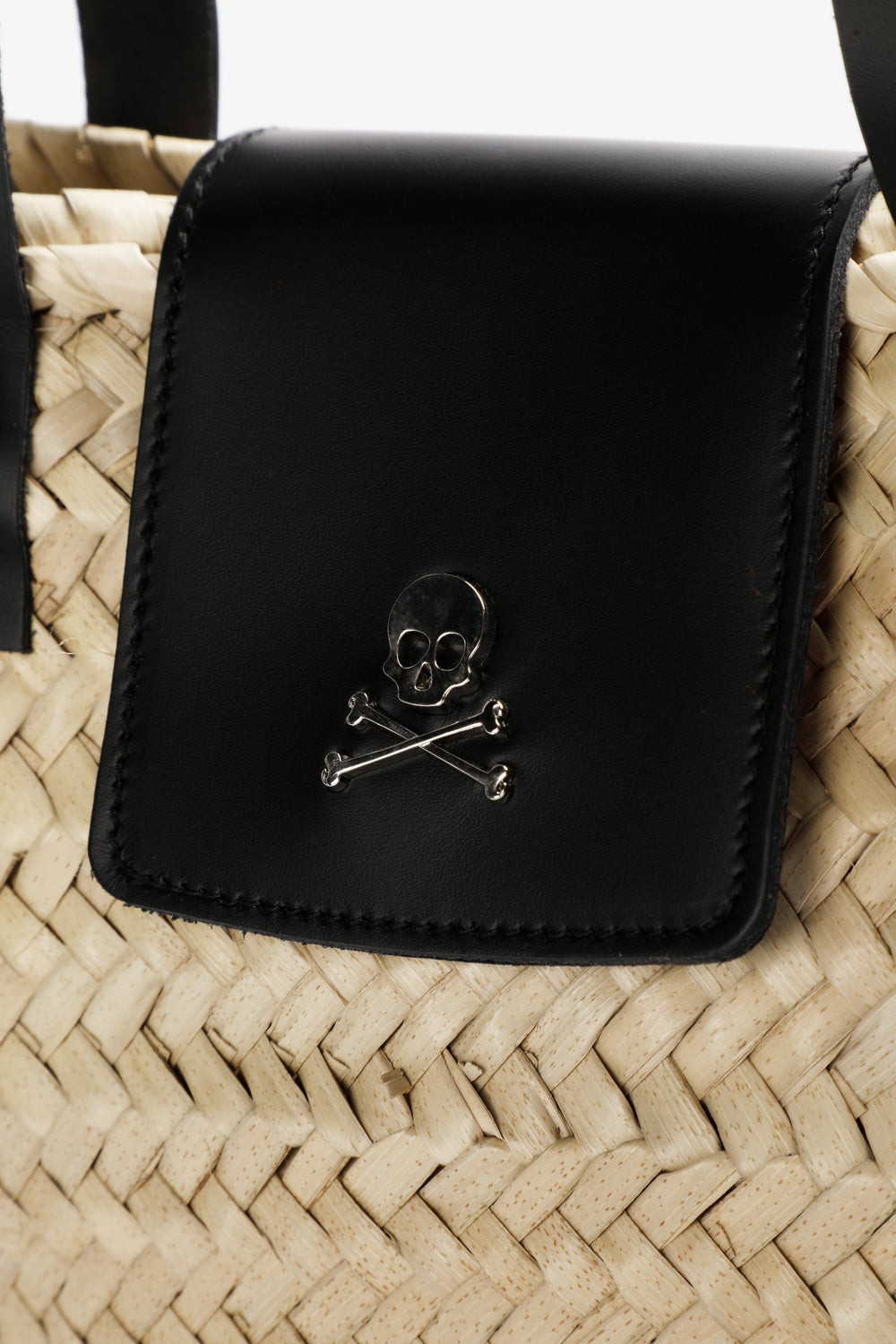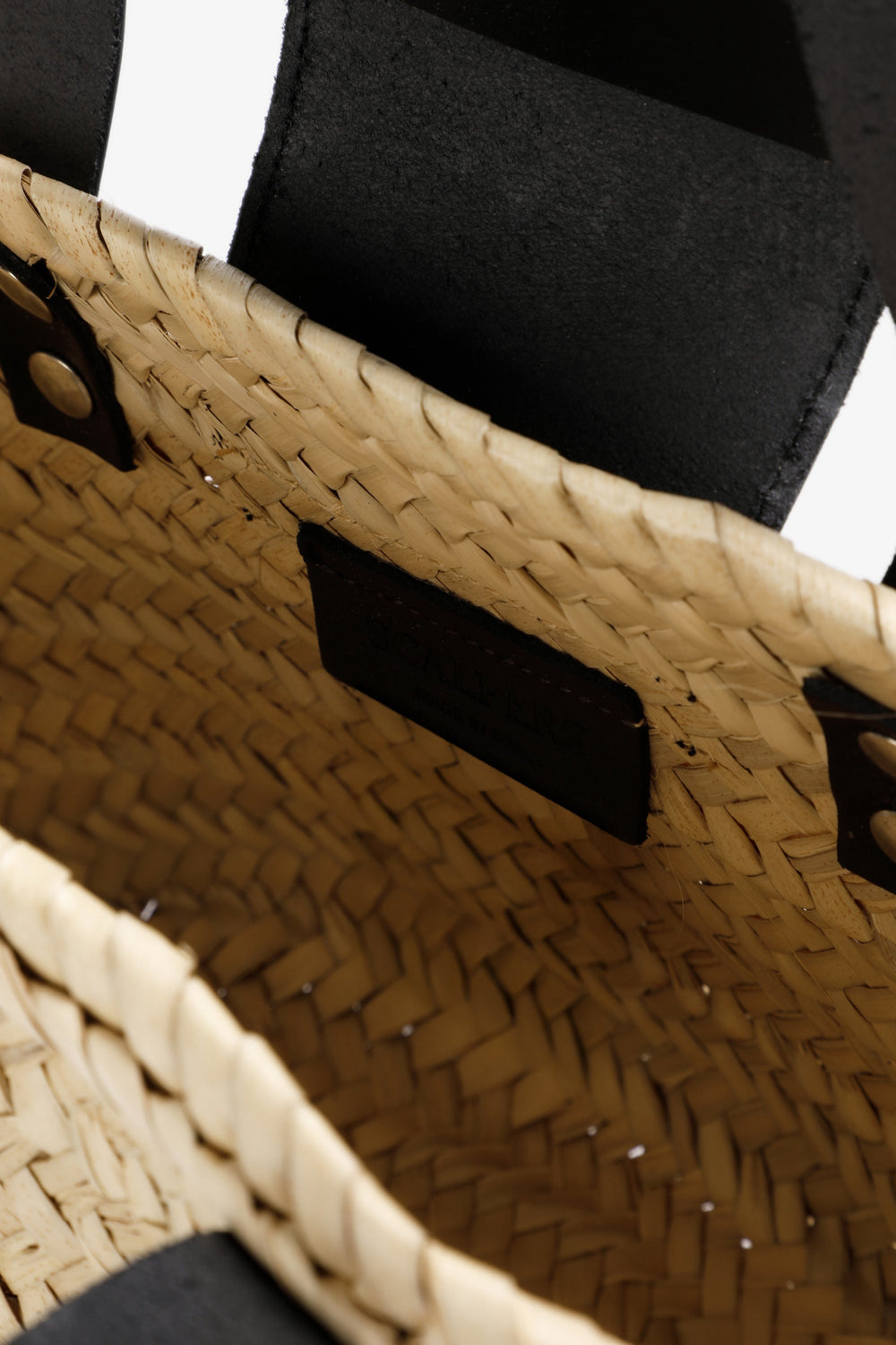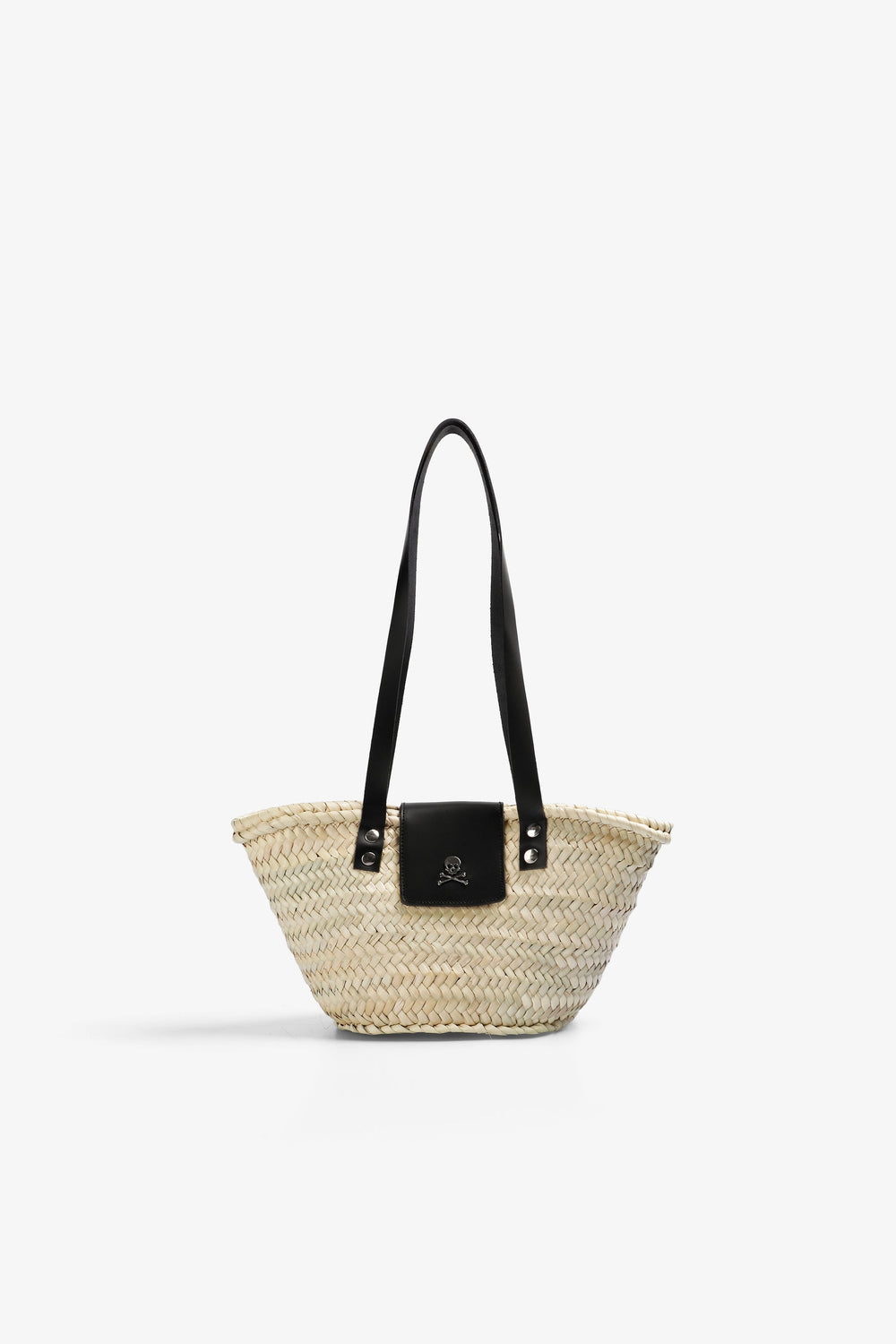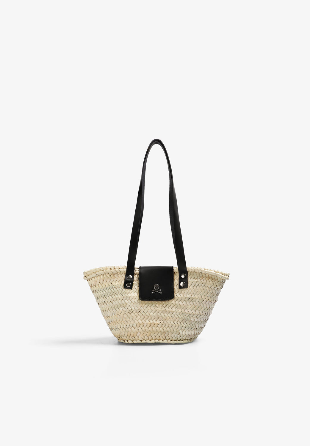 Bolso tipo capazo con logo. Confeccionado en 100% hoja de palma. Asas largas. Cierre con snap.