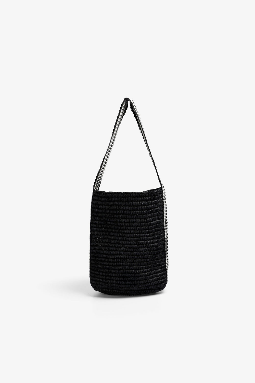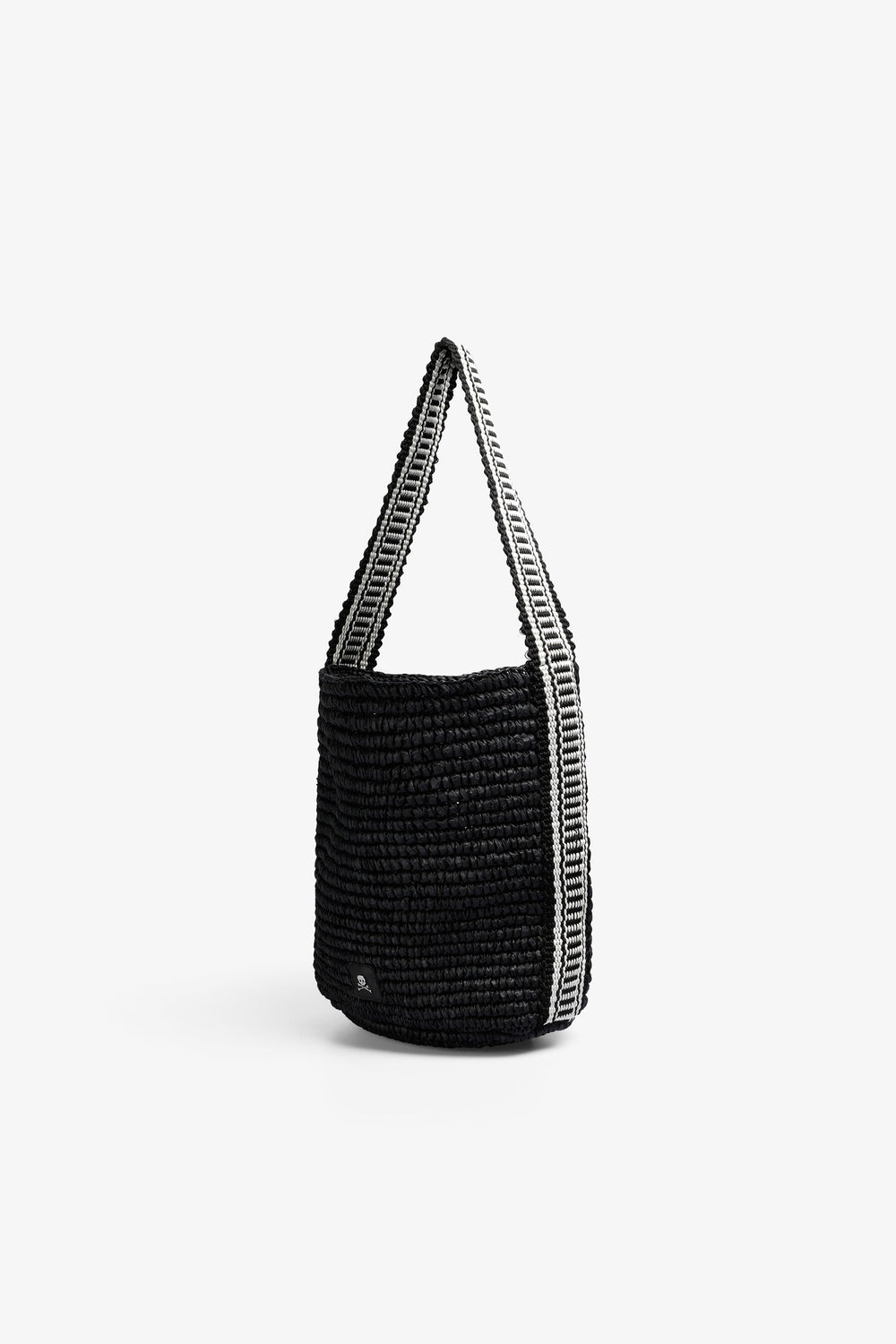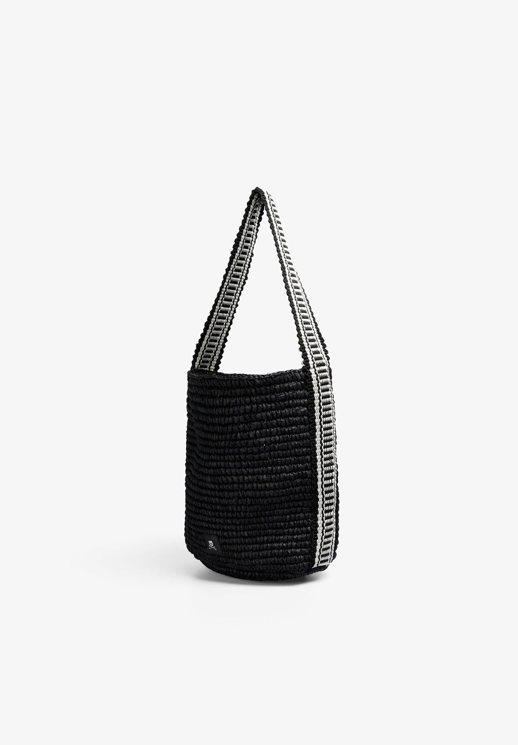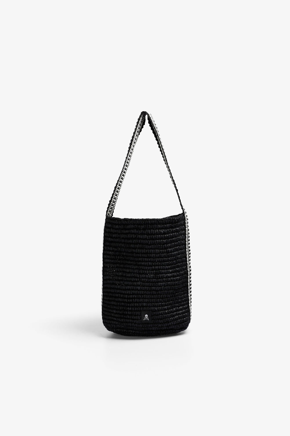 Bolso cubo confeccionado en rafia con asa bicolor. Parche con logo metálico frontal.