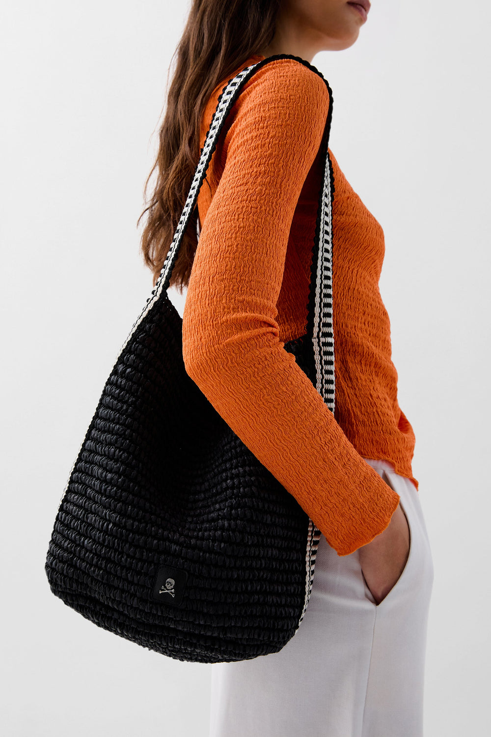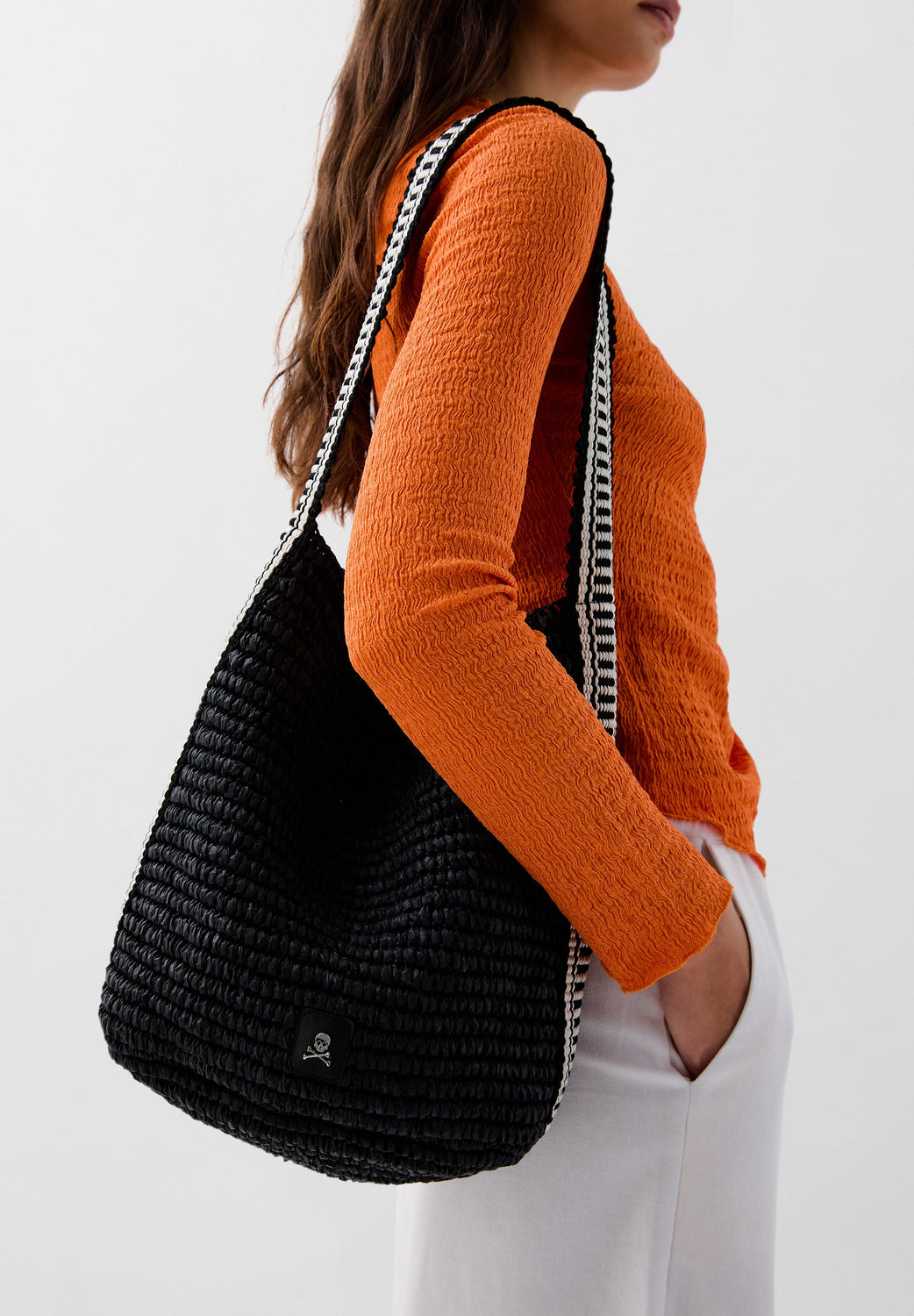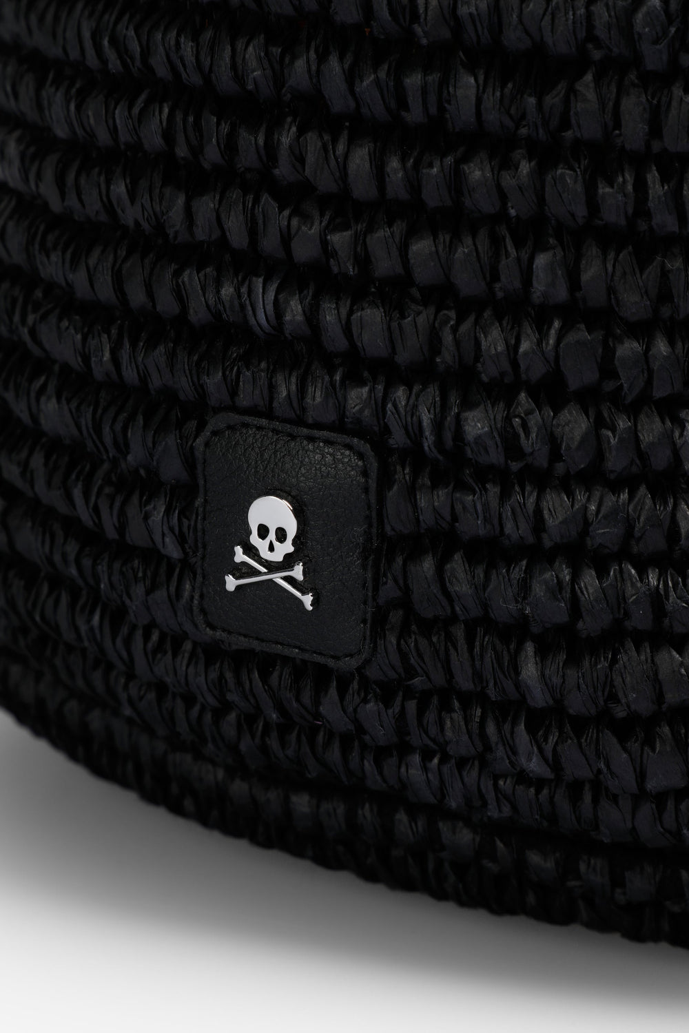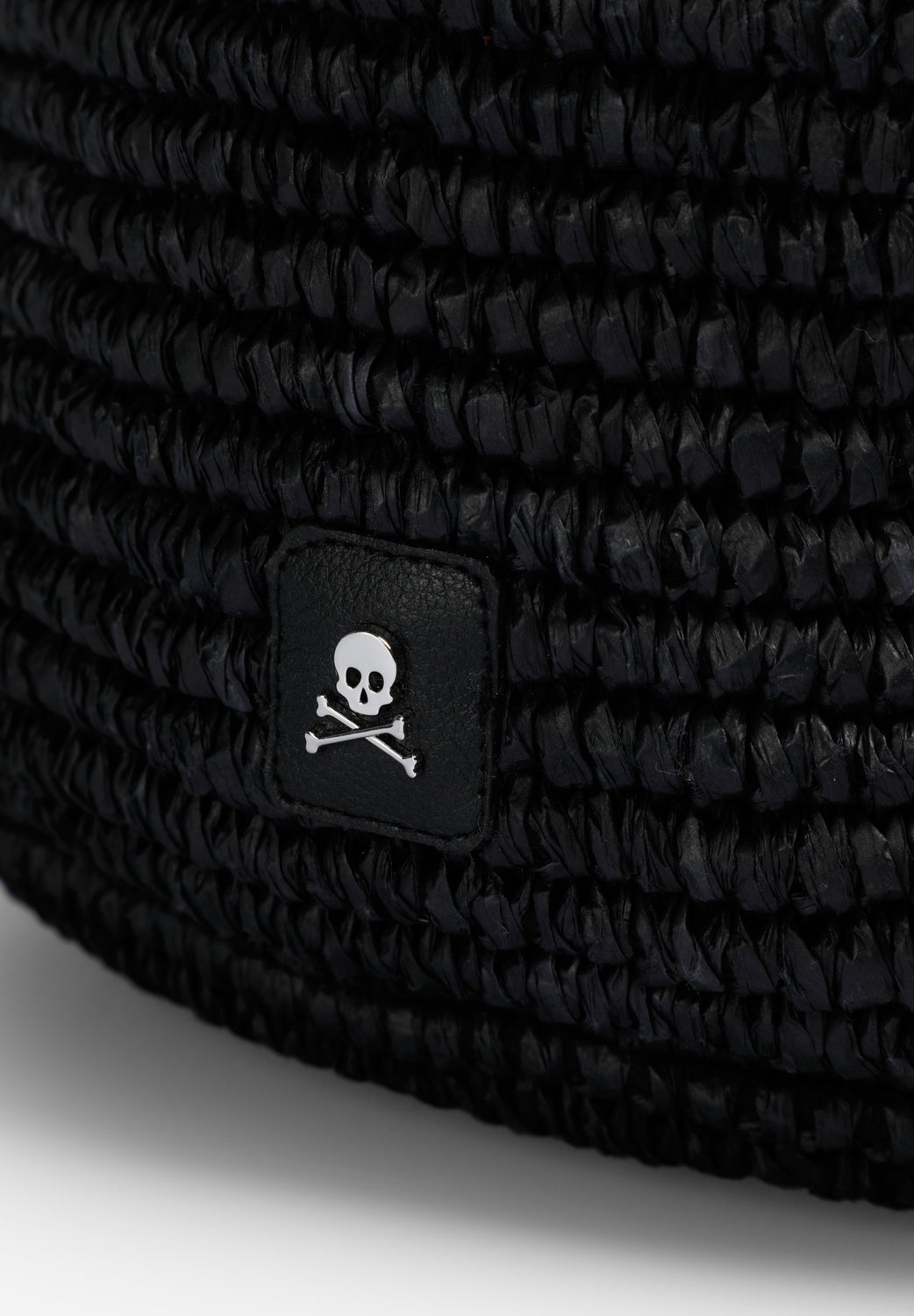 Bolso cubo confeccionado en rafia con asa bicolor. Parche con logo metálico frontal.