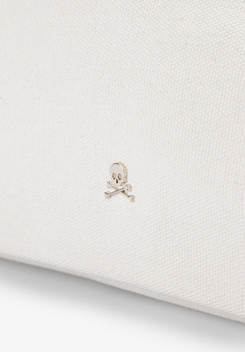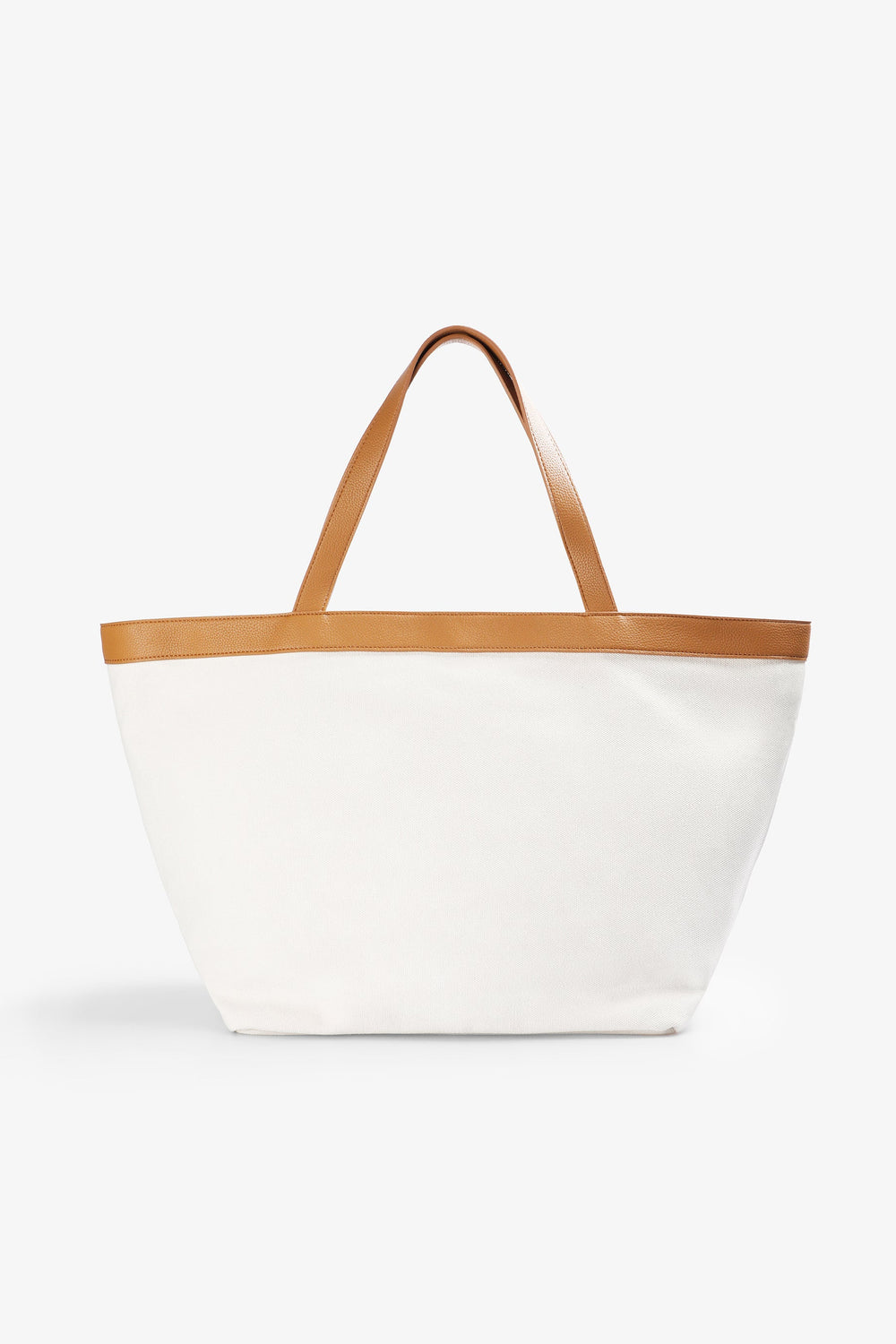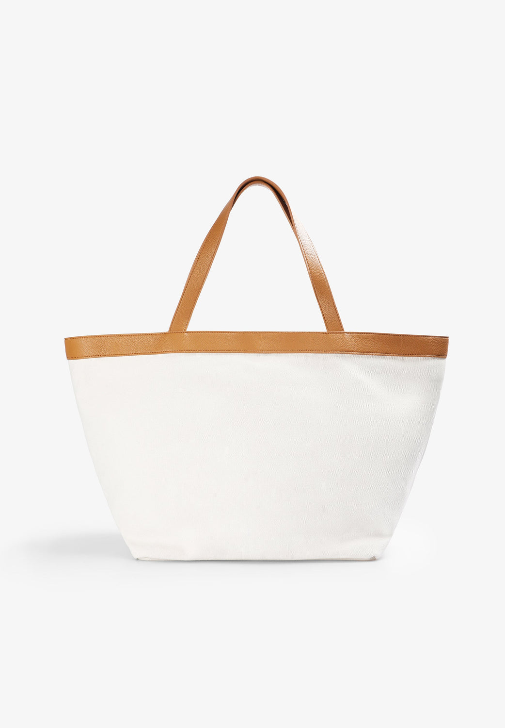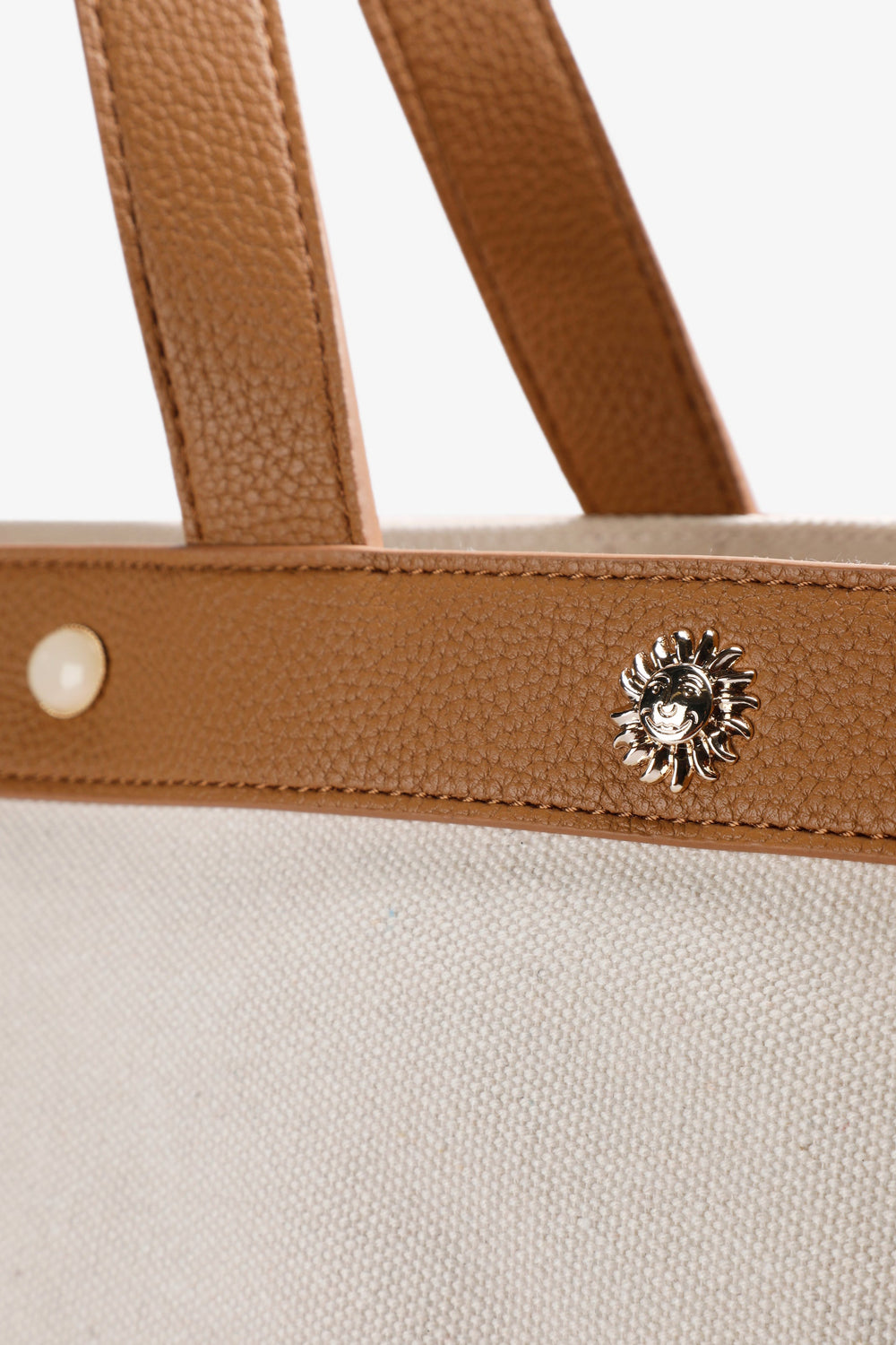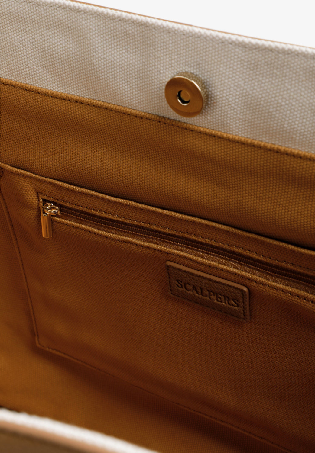 Bolso tipo shopper en tejido rústico. Confeccionado en canvas y detalles en efecto piel. Cierre con solapa con snap y detalle de logo grabado con tachuelas. Asas cortas. Bolsillo interior de parche y cremallera.