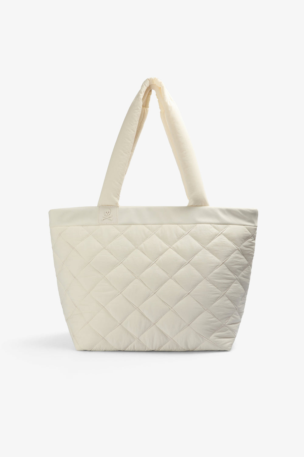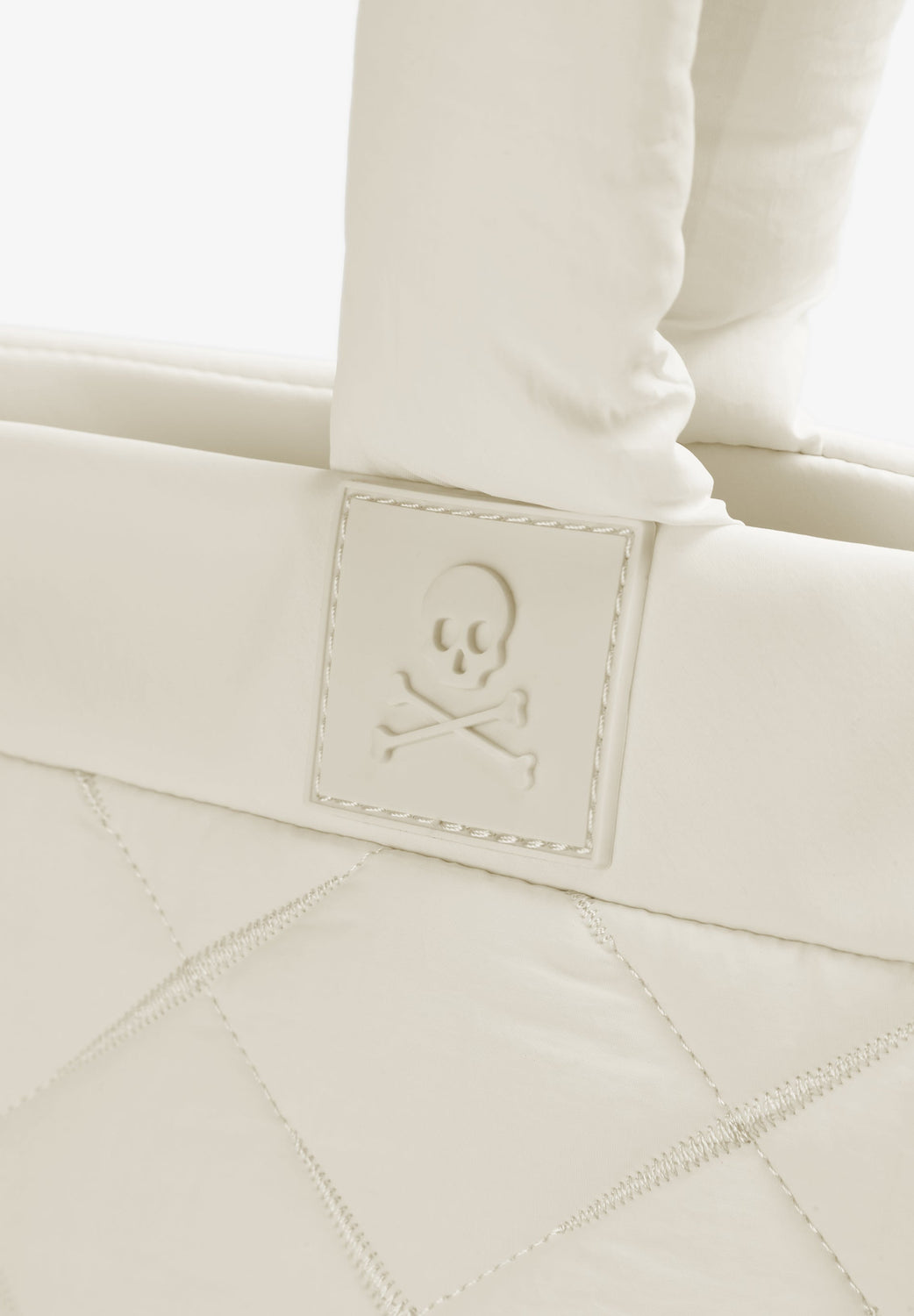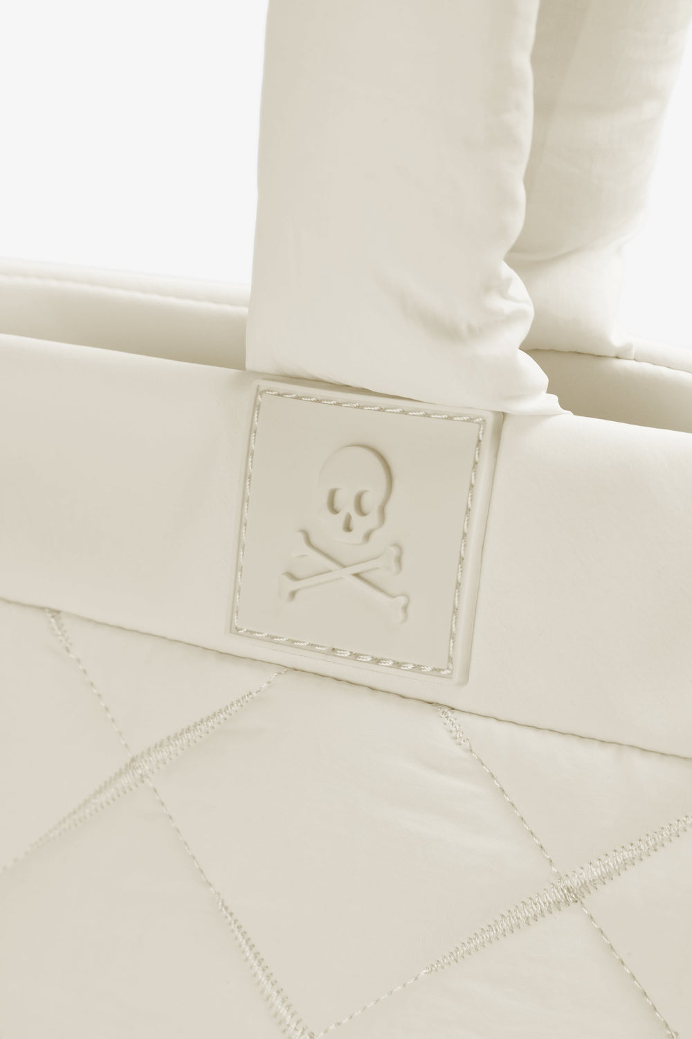 Bolso shopper acolchado confeccionado en nylon. Doble asa y cierre con snaps. Parche de calavera.