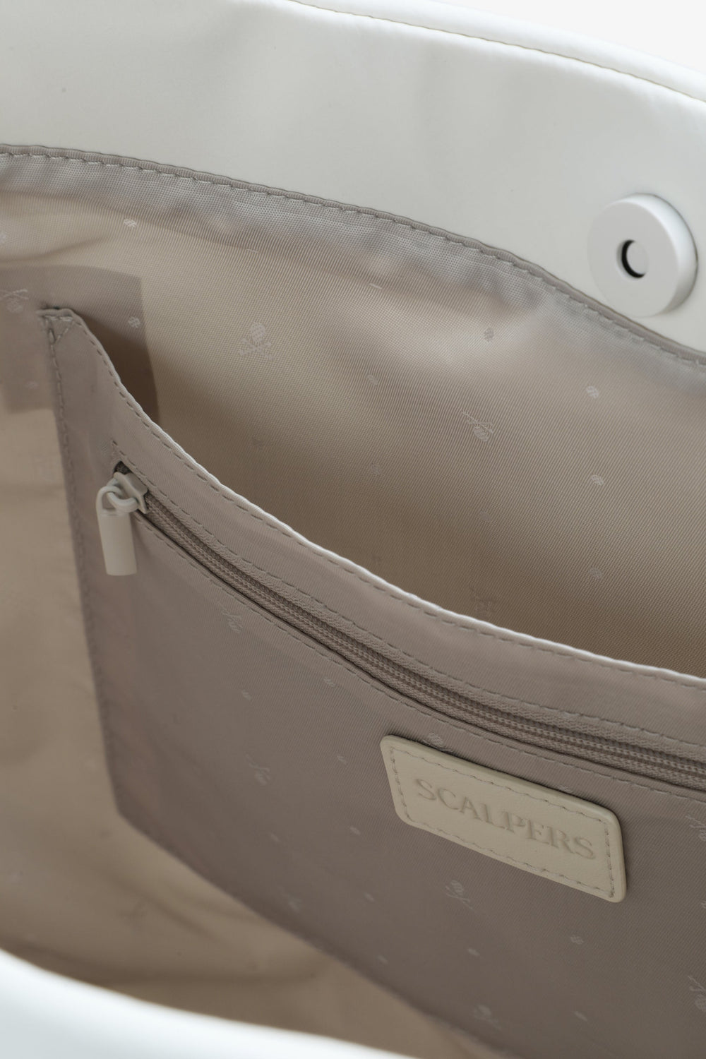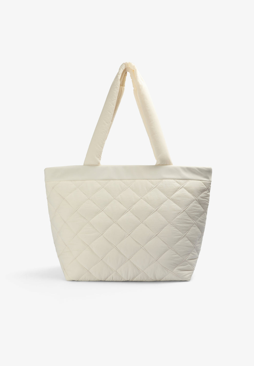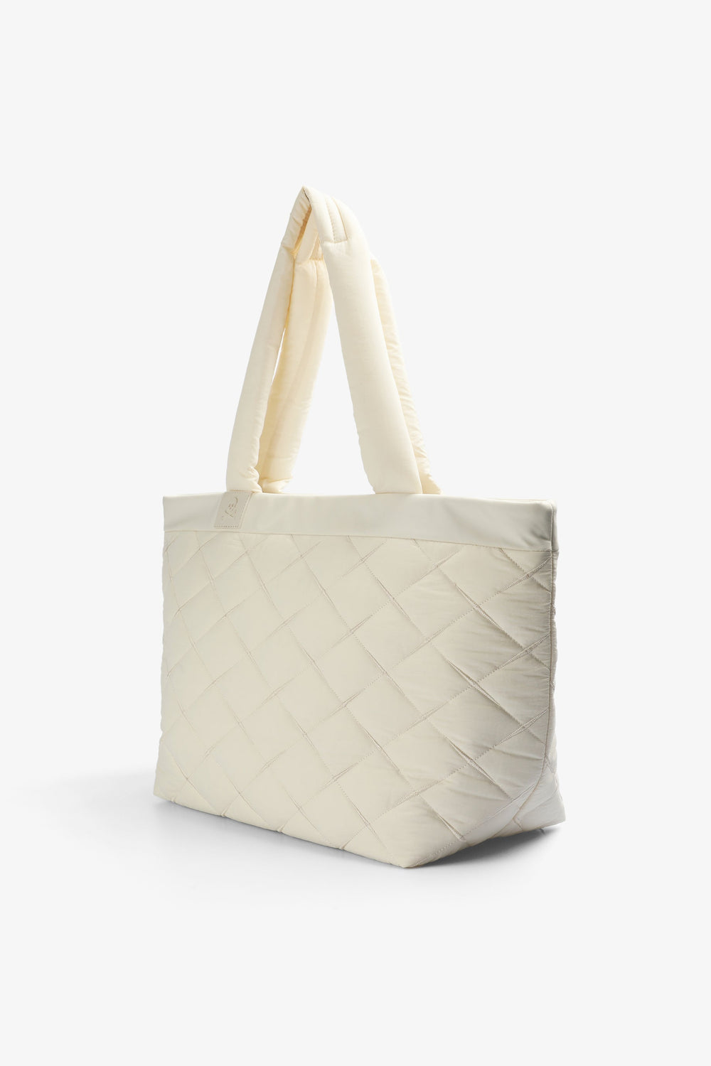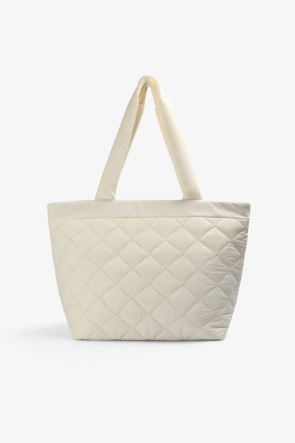 Bolso shopper acolchado confeccionado en nylon. Doble asa y cierre con snaps. Parche de calavera.