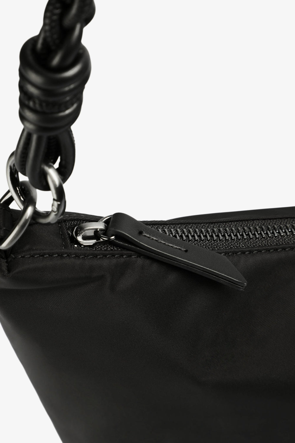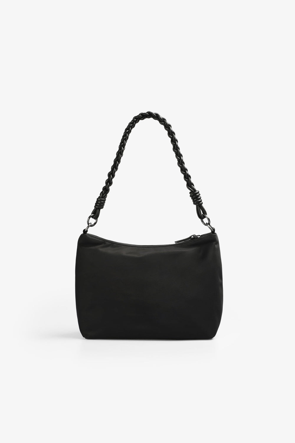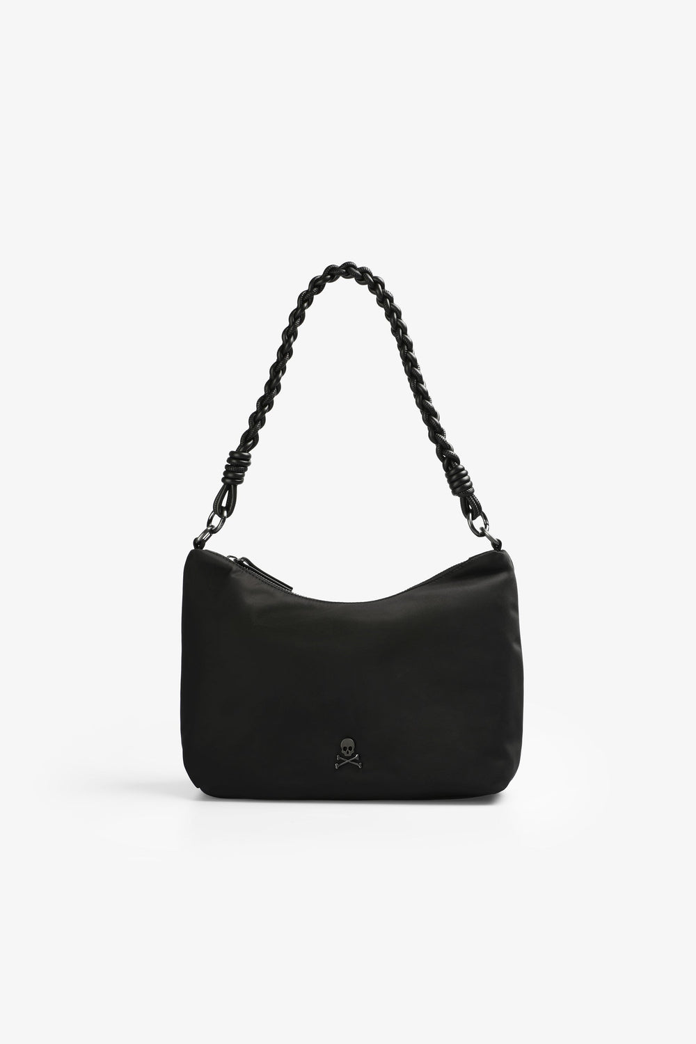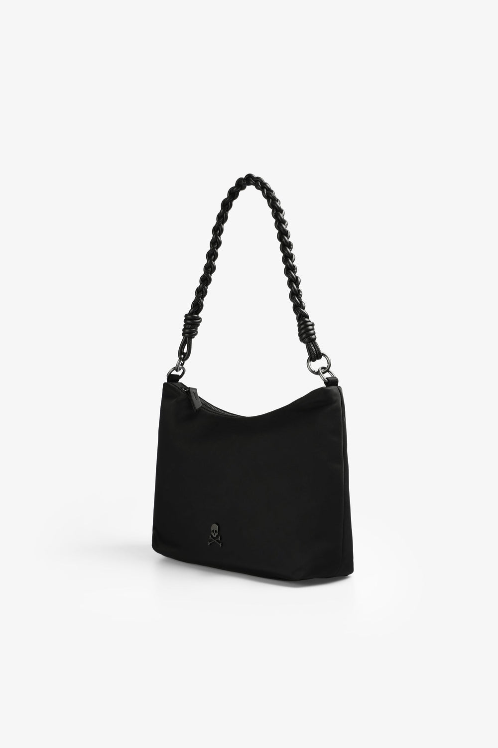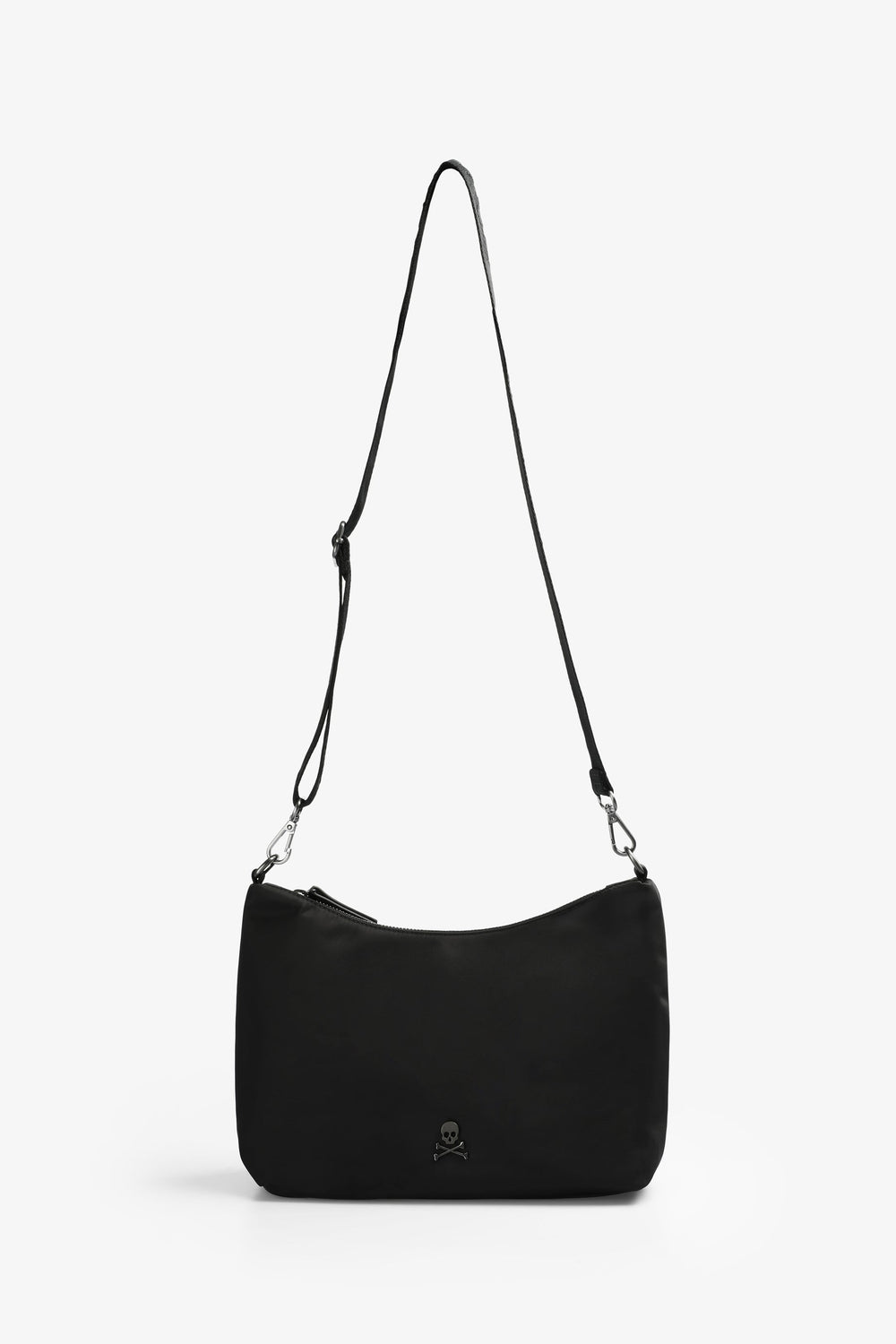 Bolso de hombro confeccionado en tejido técnico. Parche metálico de calavera frontal. Cierre con cremallera. Forro interior con bolsillo con cremallera. Asa trenzada corta desmontable y asa larga.