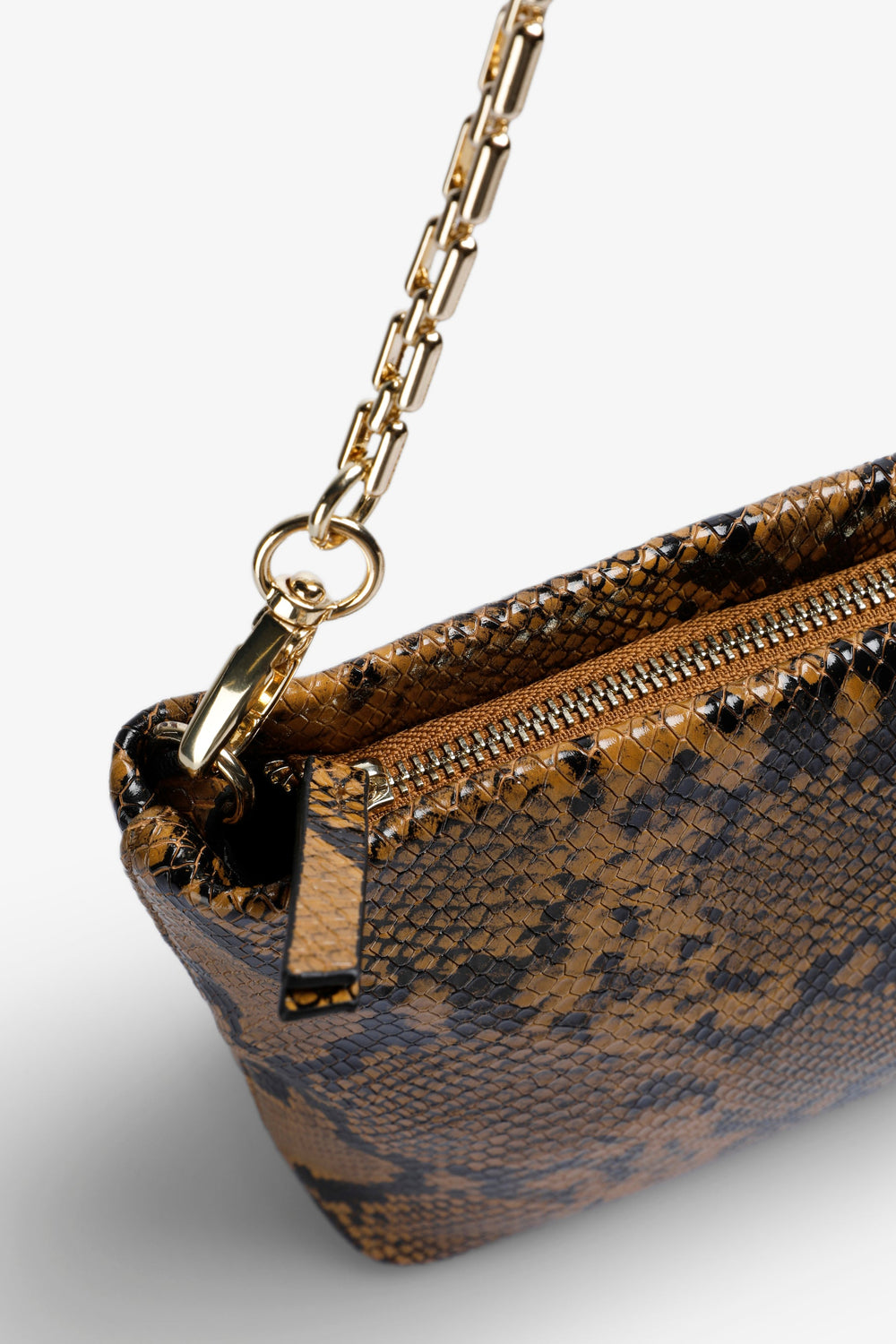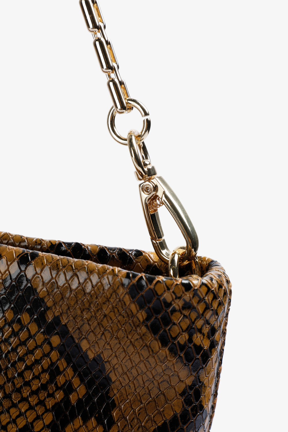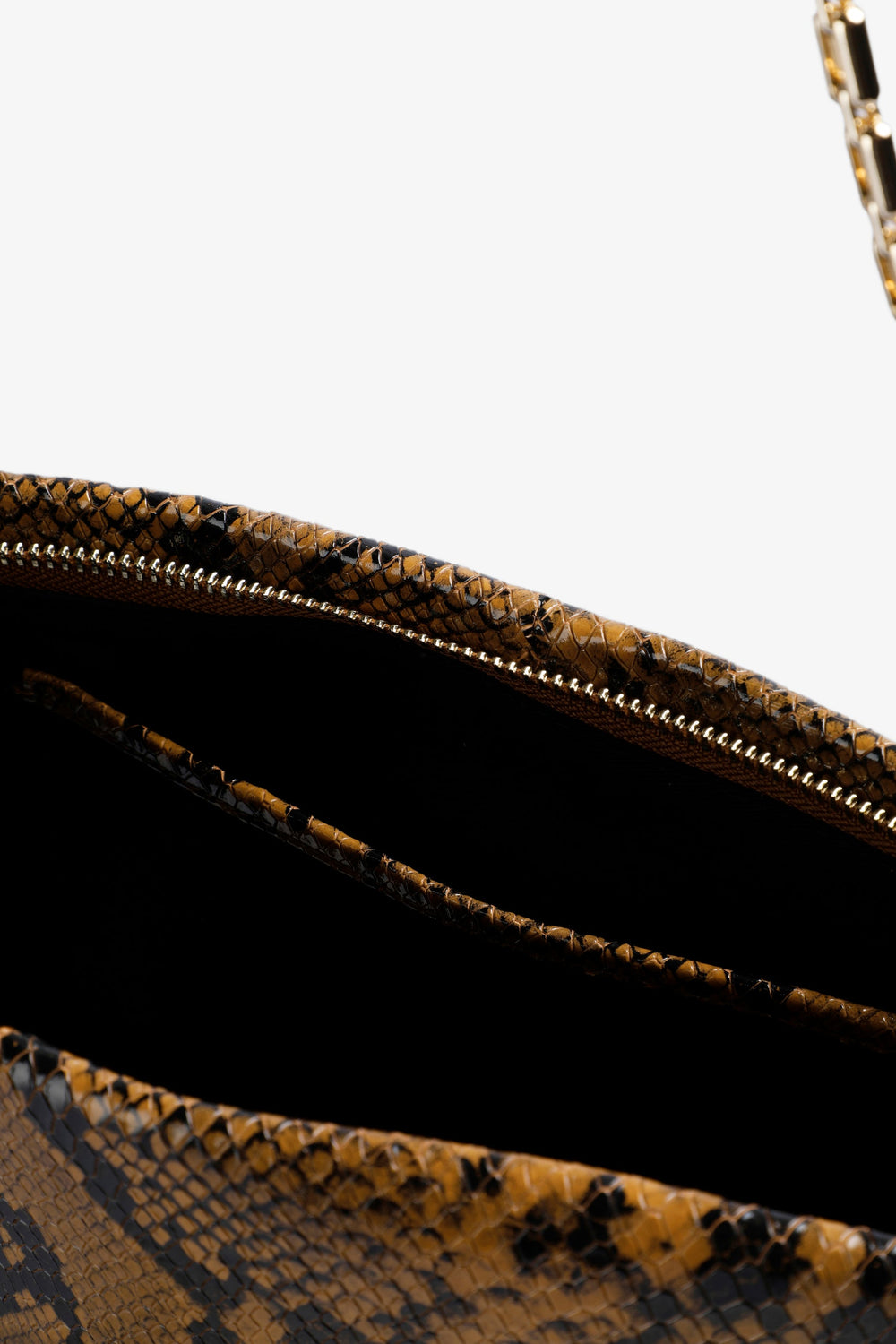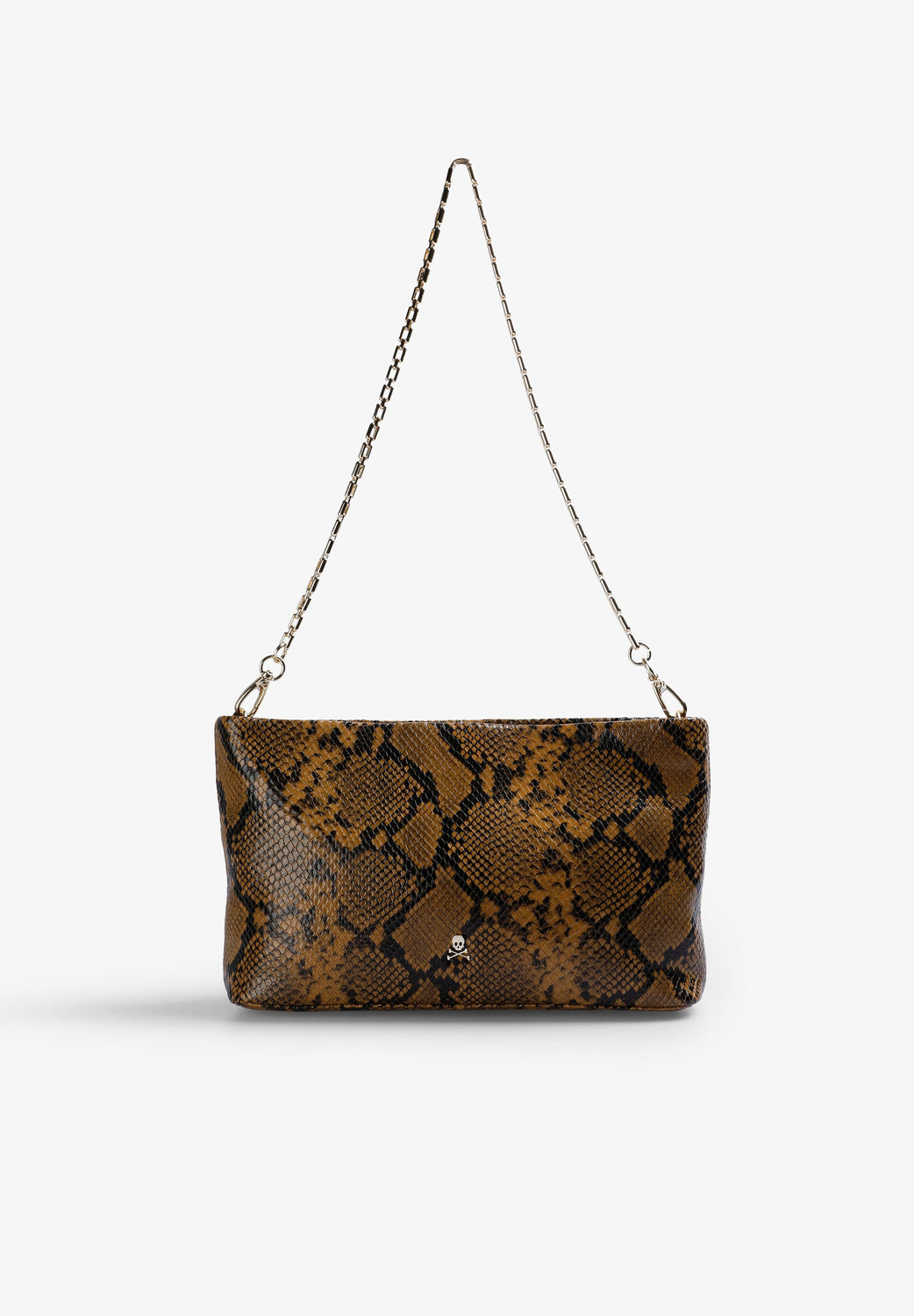 Bolso estilo clutch confeccionado en 100% piel con estampado animal print. Bolsillo interior y cierre con cremallera. Asa de cadena.