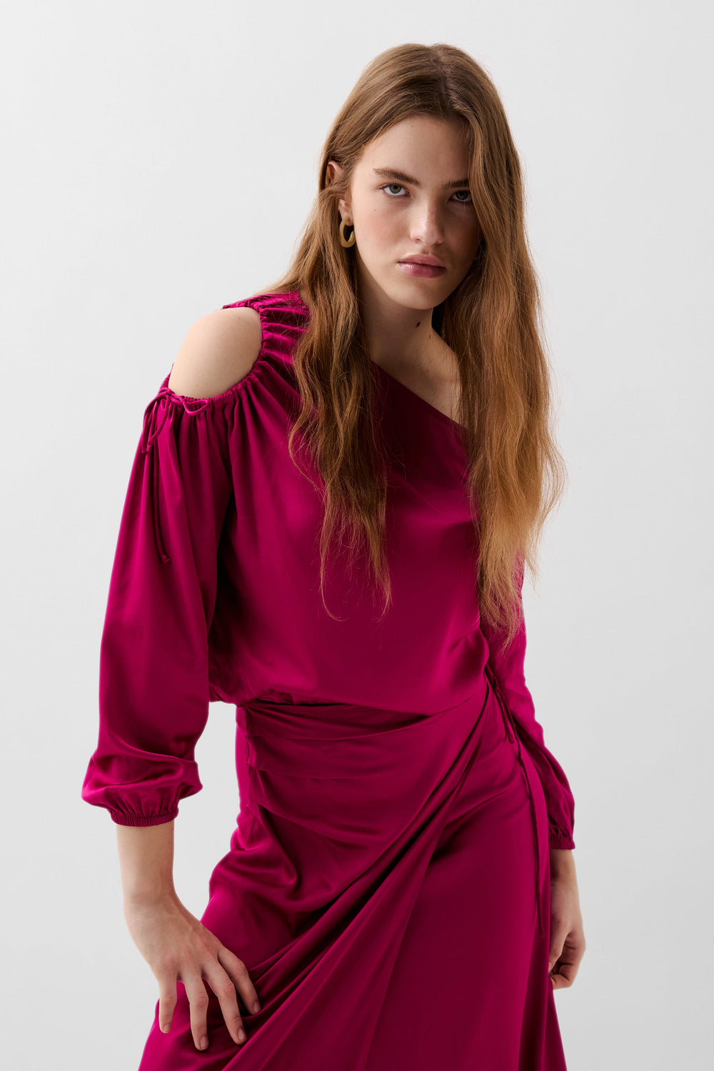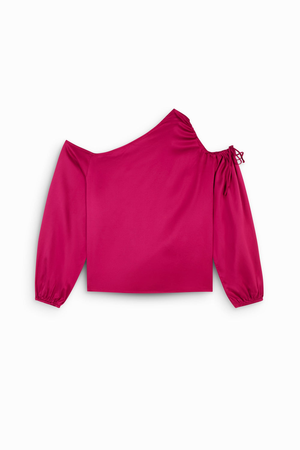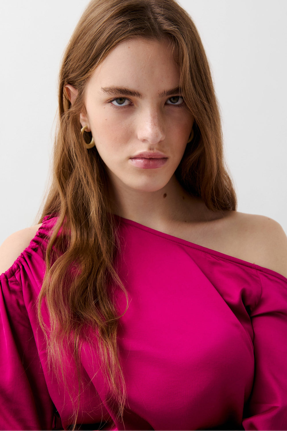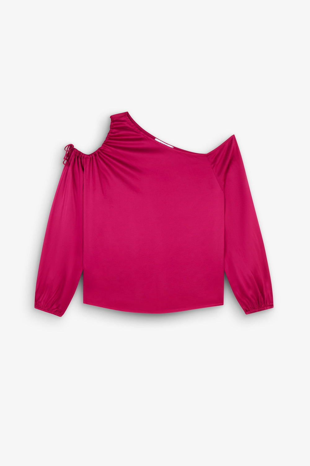 Top satinado confeccionado en tejido ligeramente elástico. Regular fit, escote asimétrico y manga larga terminada en elástico. Detalle de abertura en hombro.